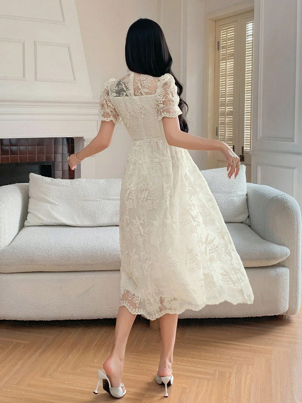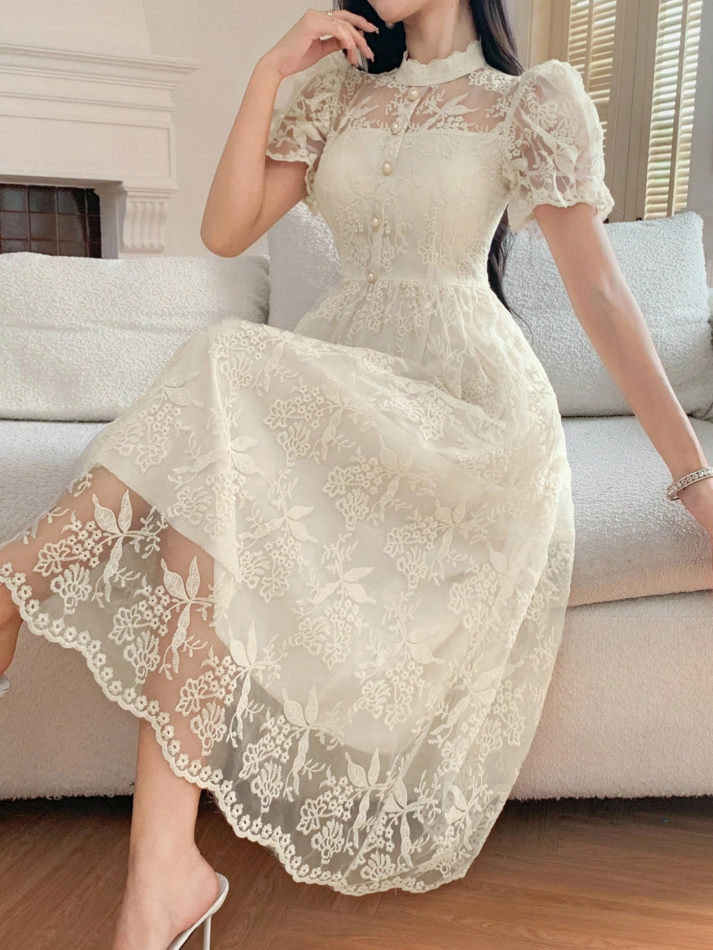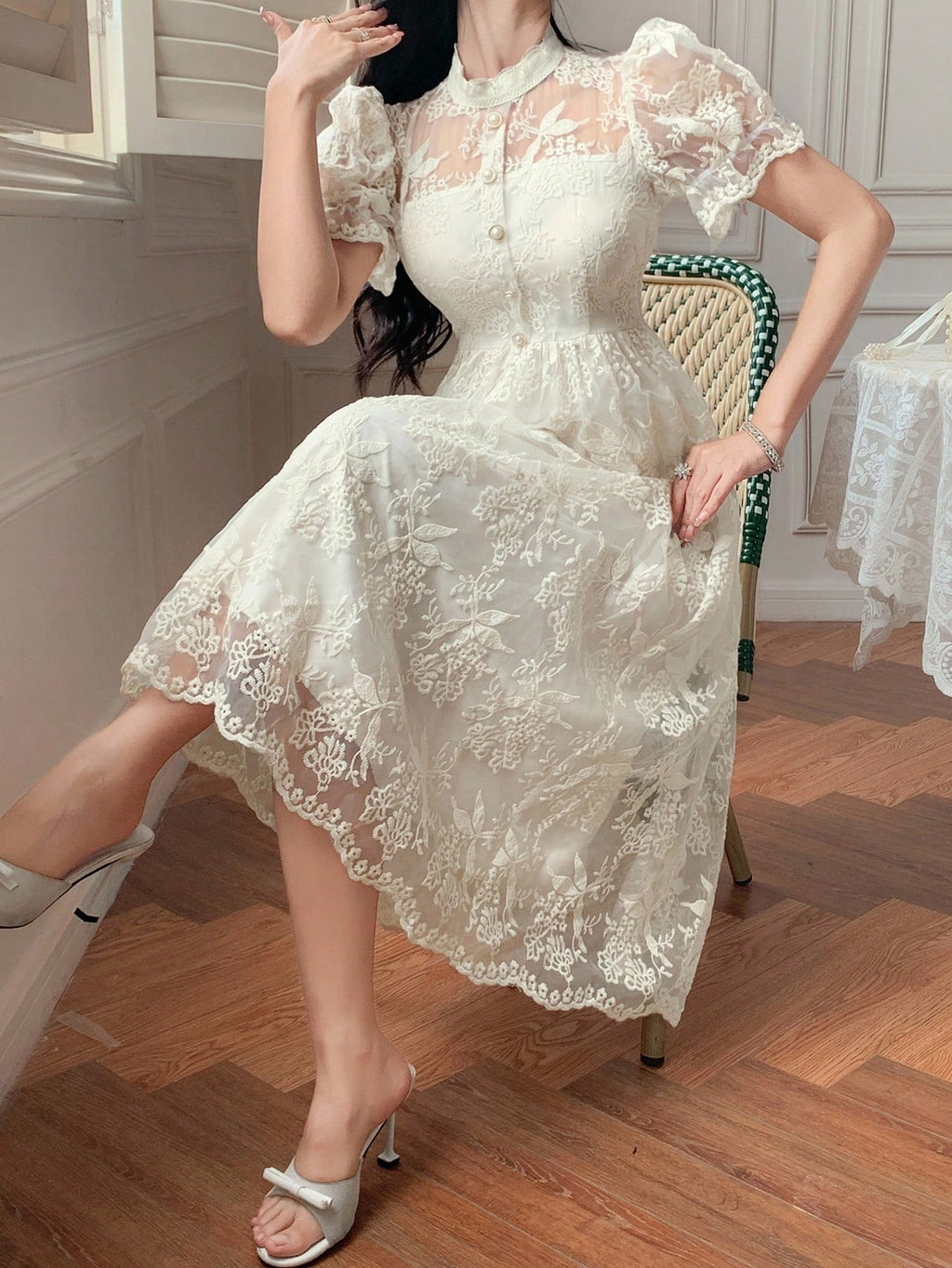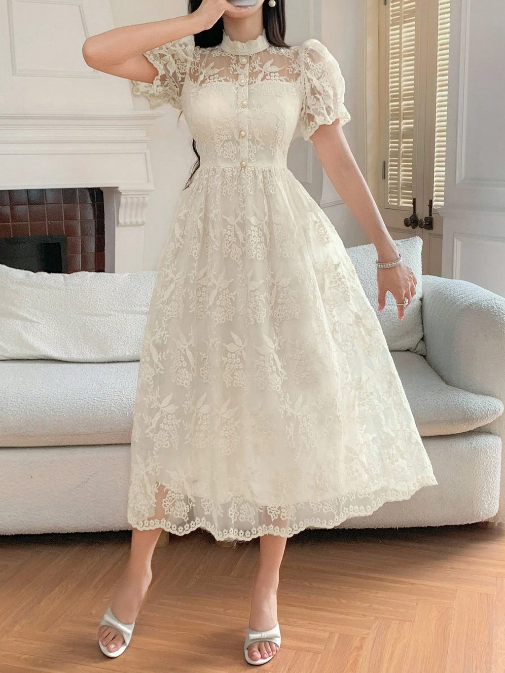 MIU Women's Elegant Lace Collar Puff Sleeve Mid-Long Dress