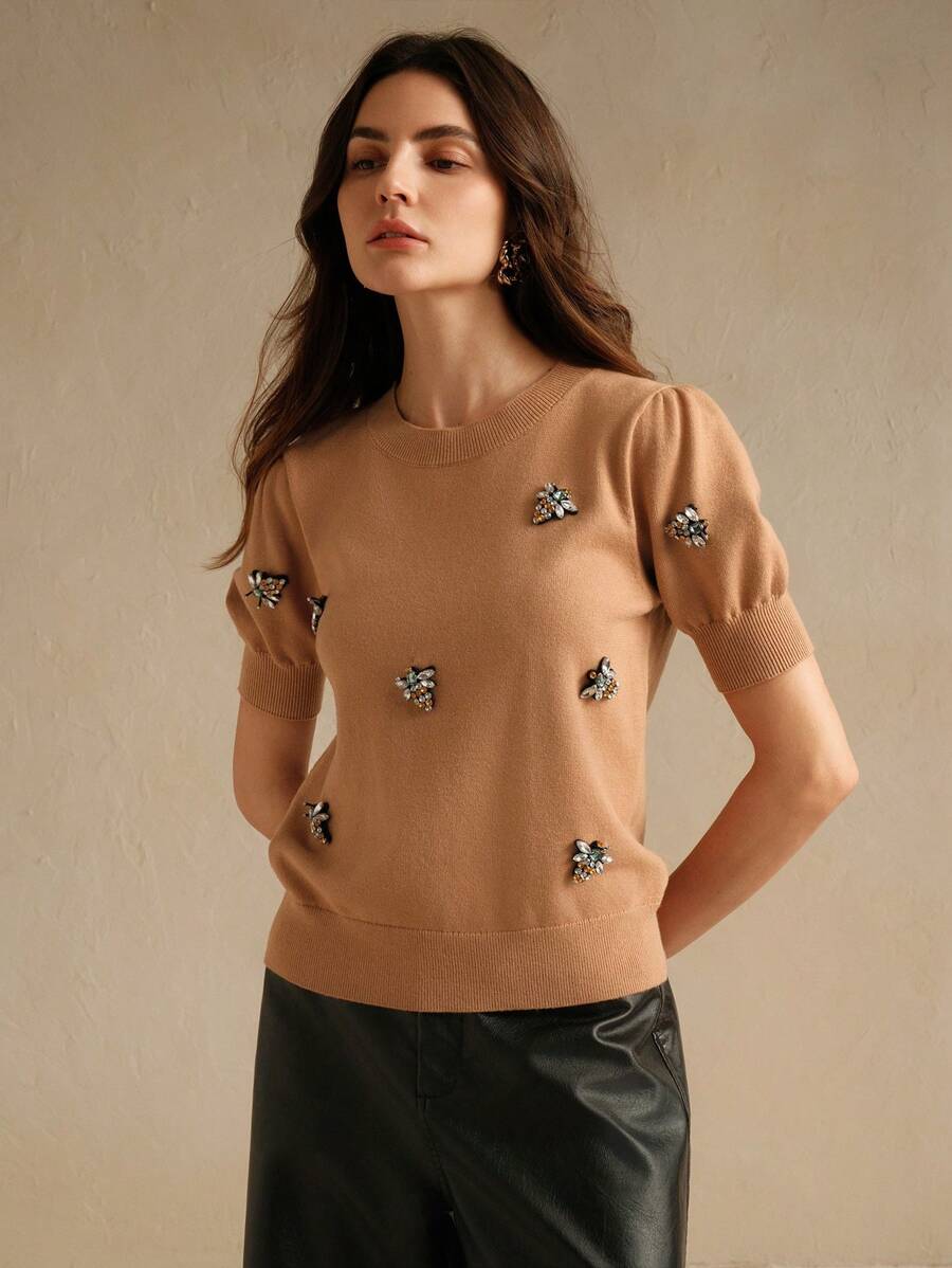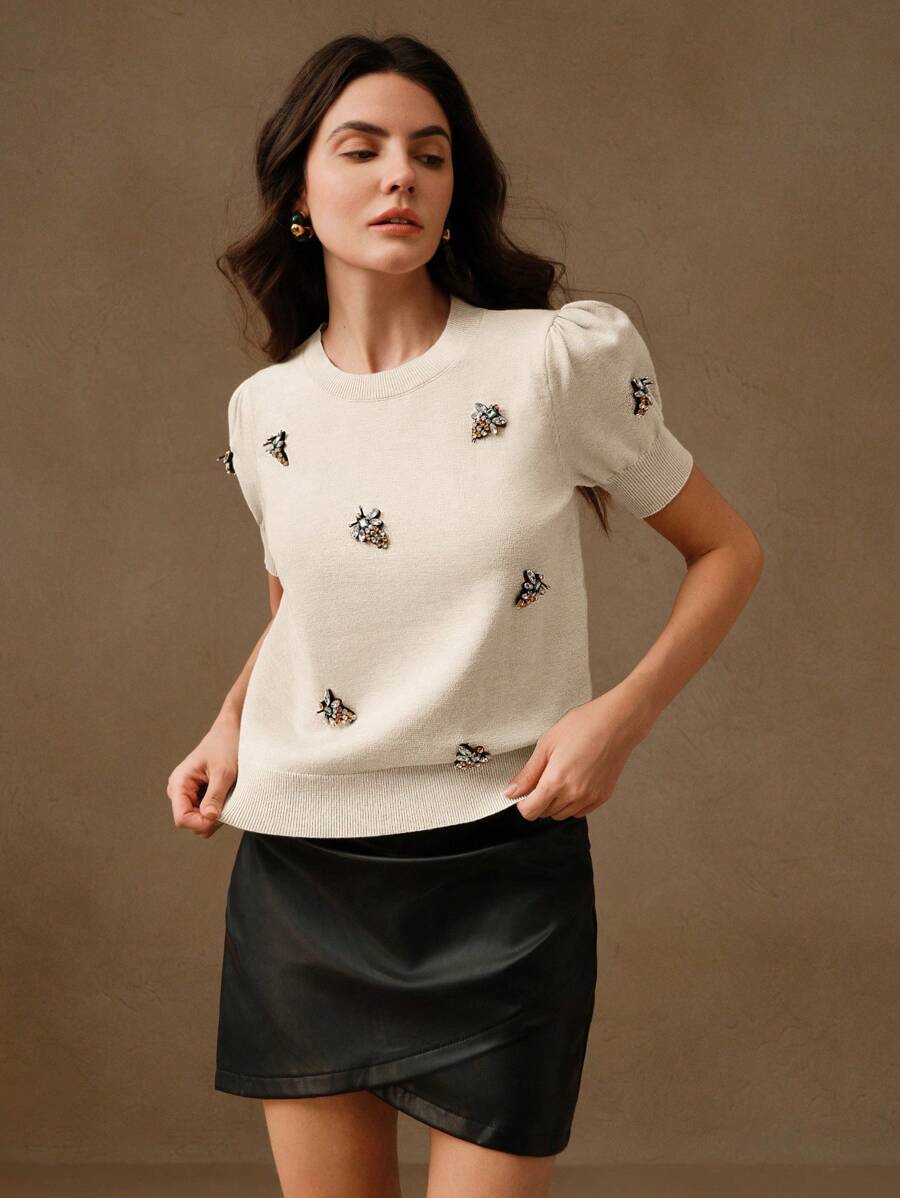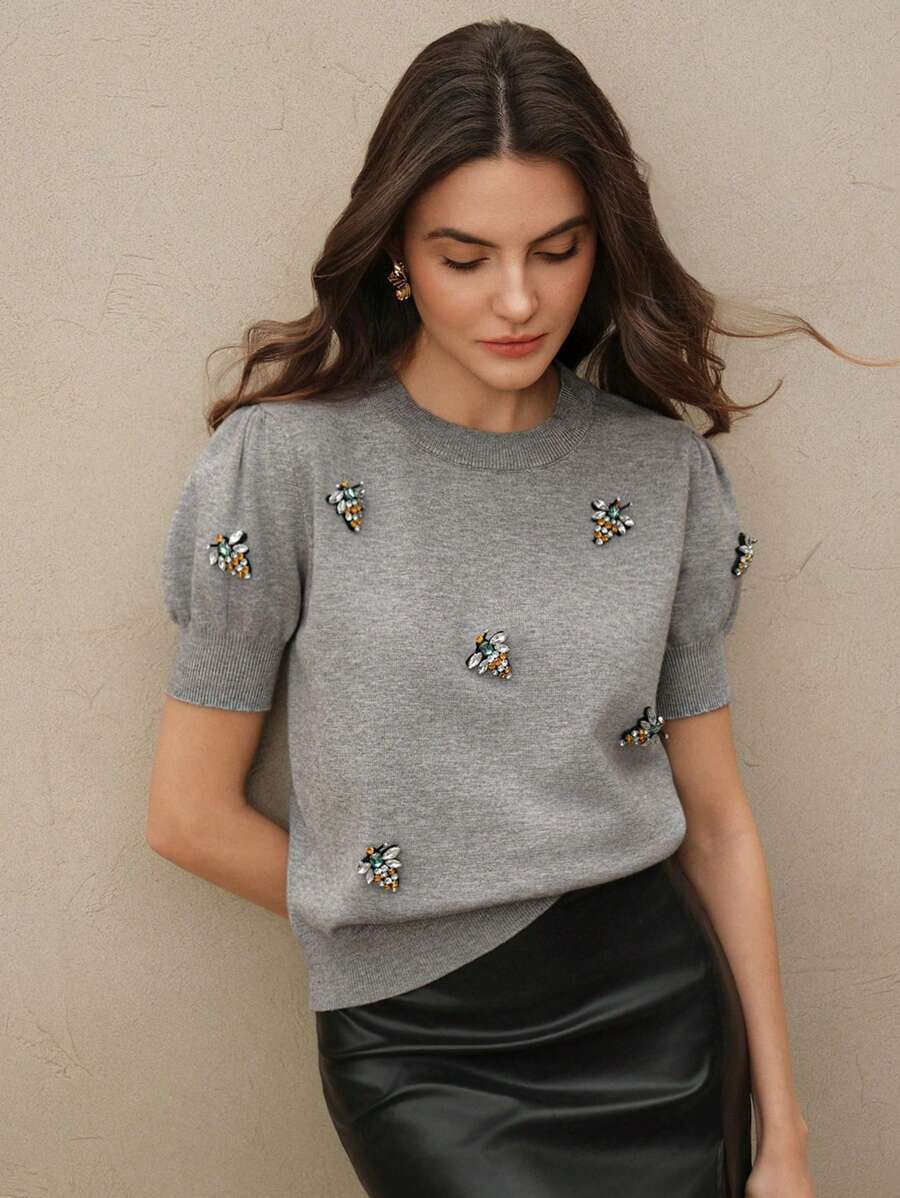 MIU Women's Elegant Modern Embellished Colorful Rhinestone Puff Sleeve Solid Color Knit Sweater Top, Suitable For Valentine's Day, New Year's Outfit