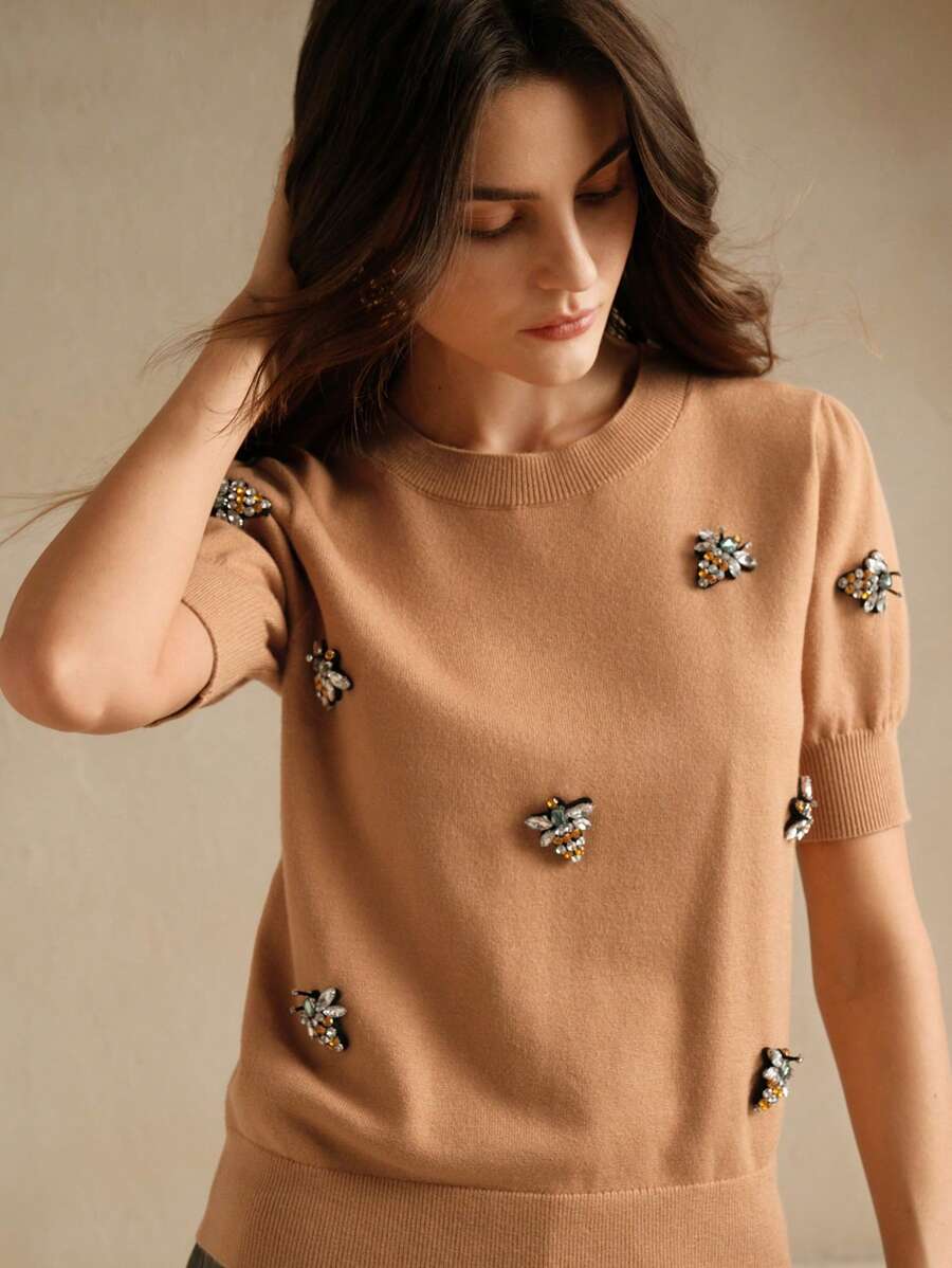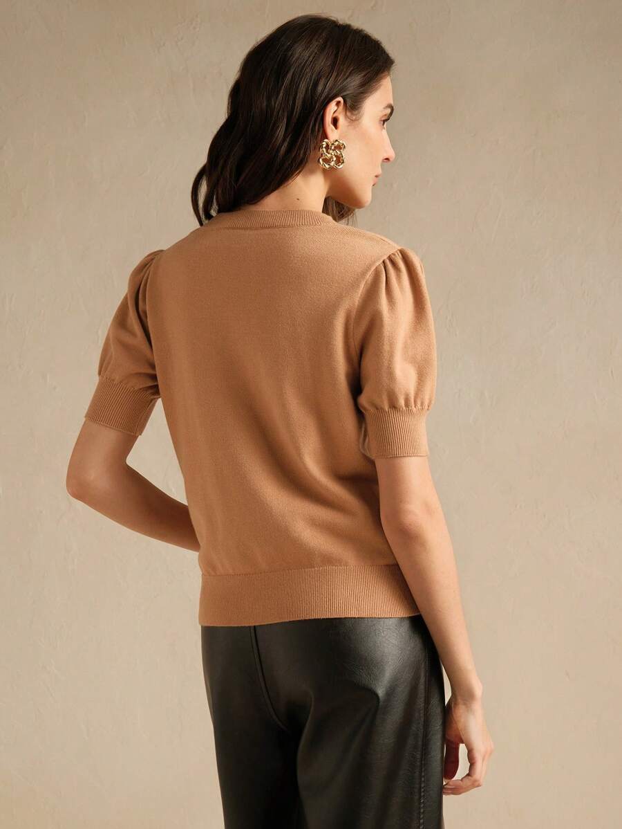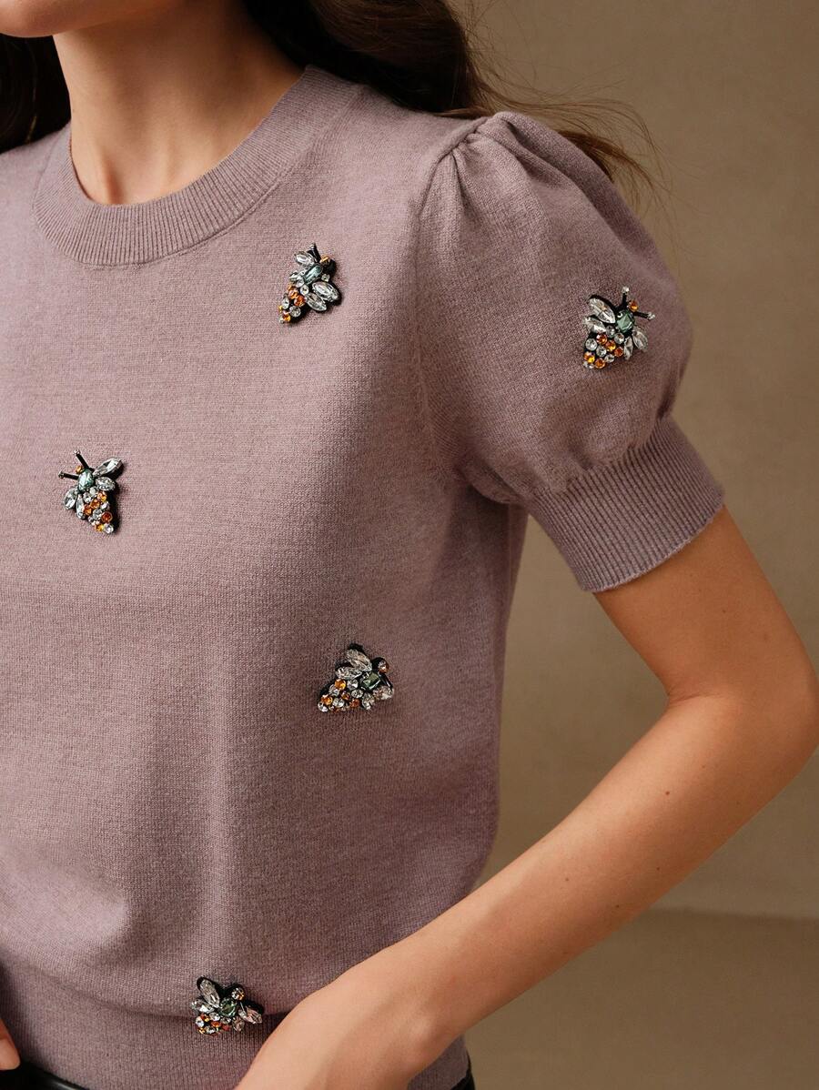 MIU Women's Elegant Modern Embellished Colorful Rhinestone Puff Sleeve Solid Color Knit Sweater Top, Suitable For Valentine's Day, New Year's Outfit
