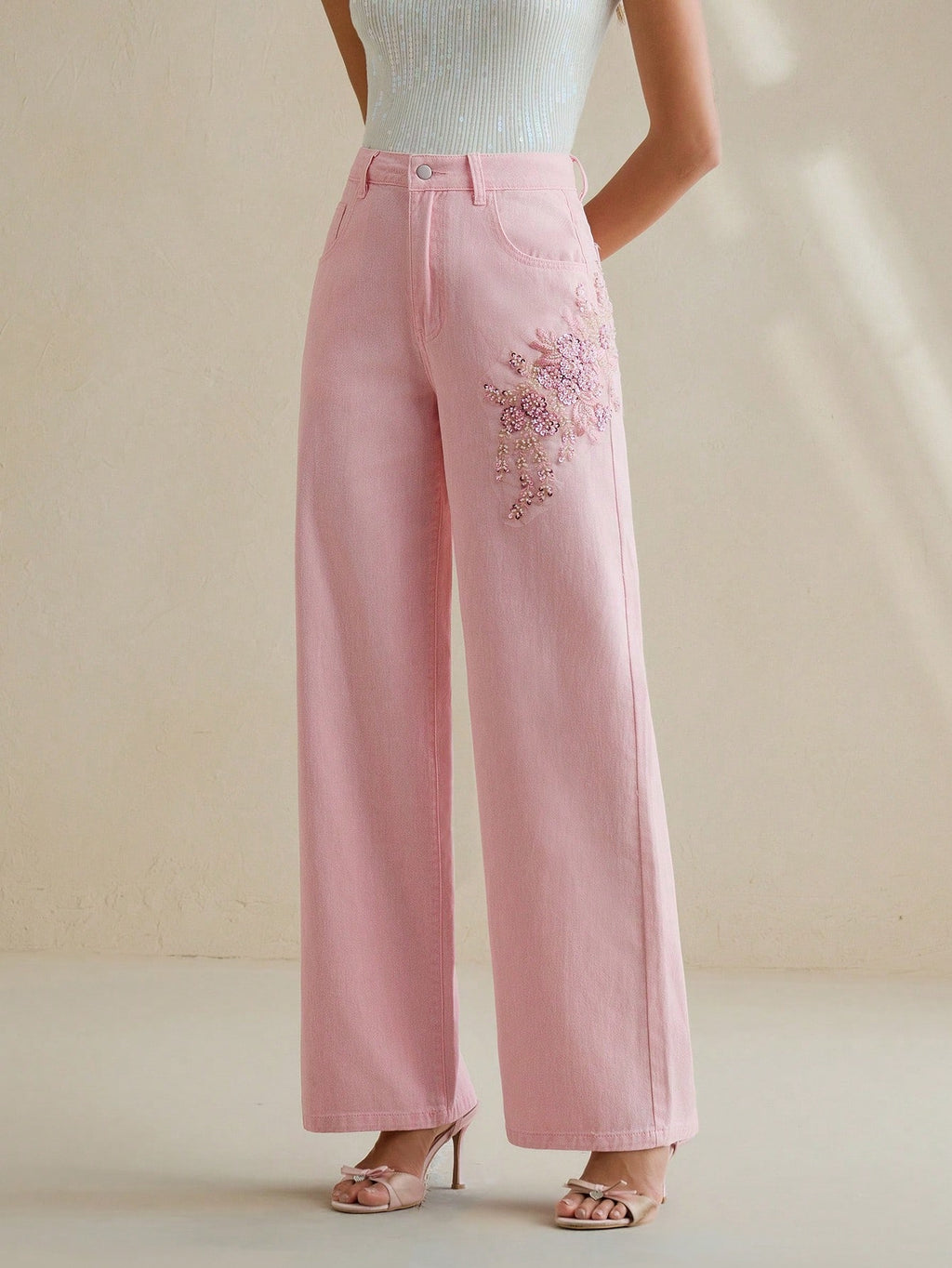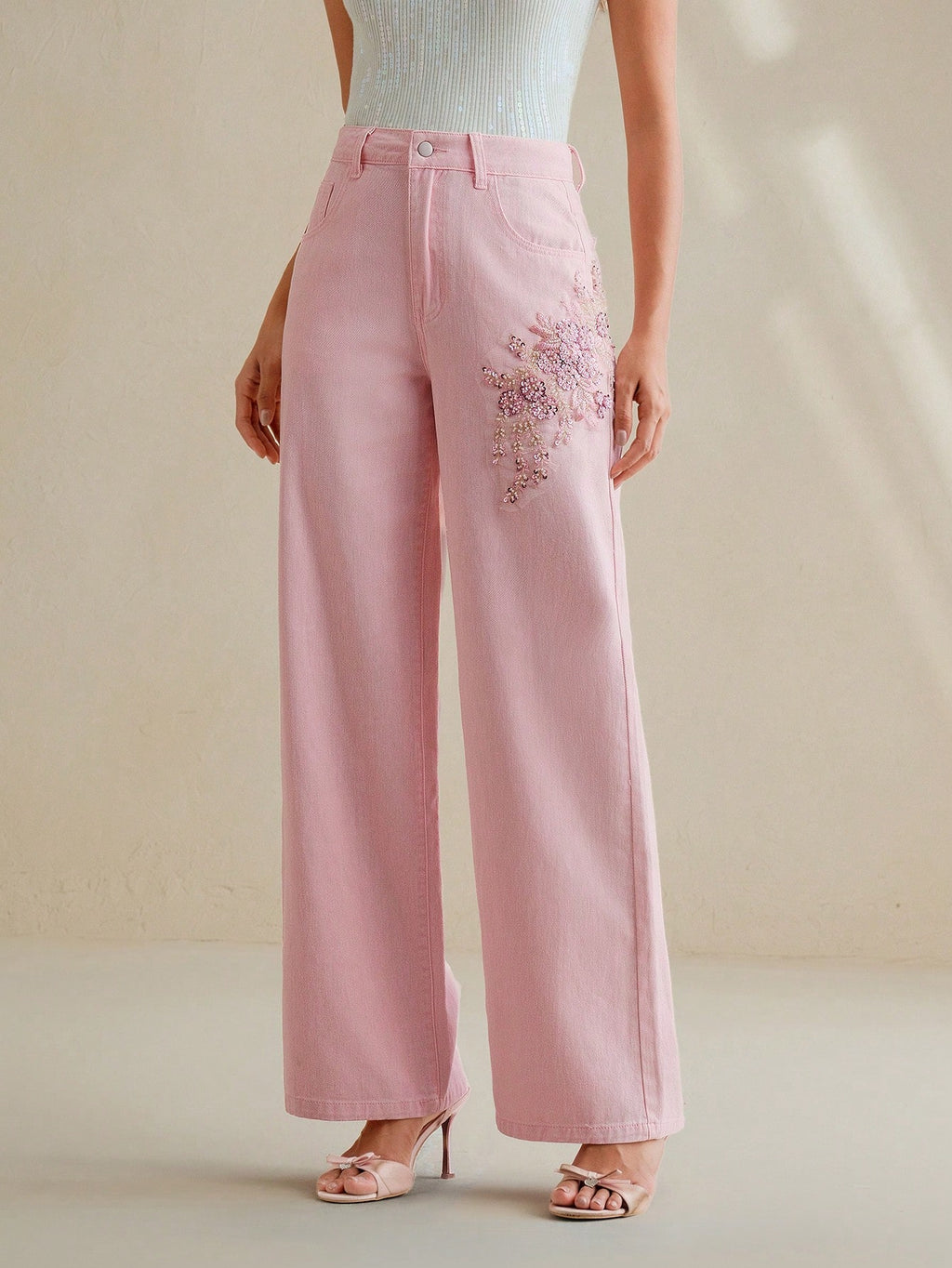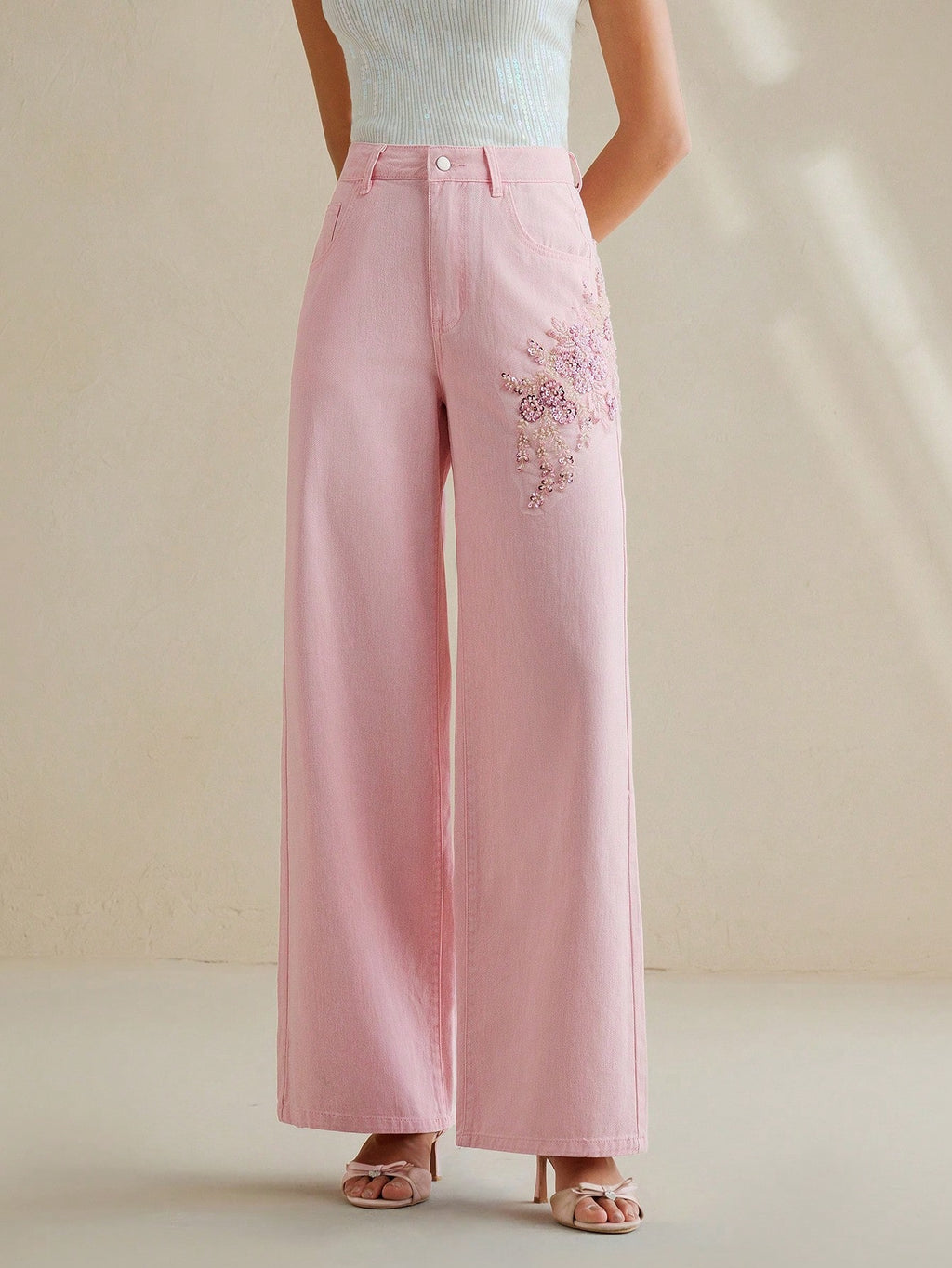MIU Women's Elegant Pink Denim Long Jeans With Floral Embroidery Detail And Zipper Closure