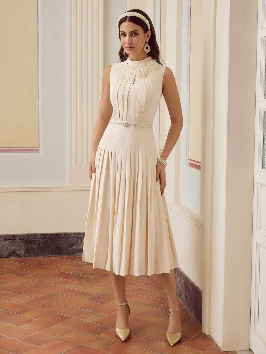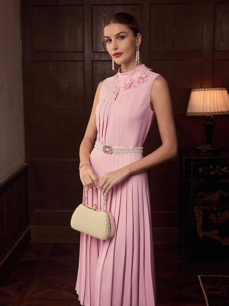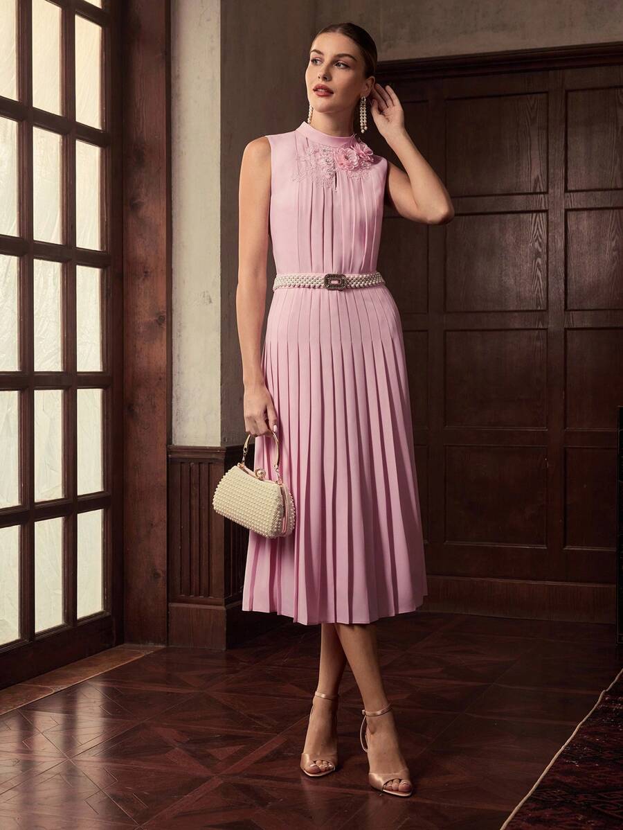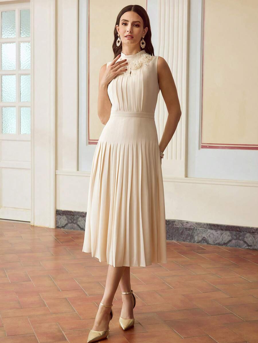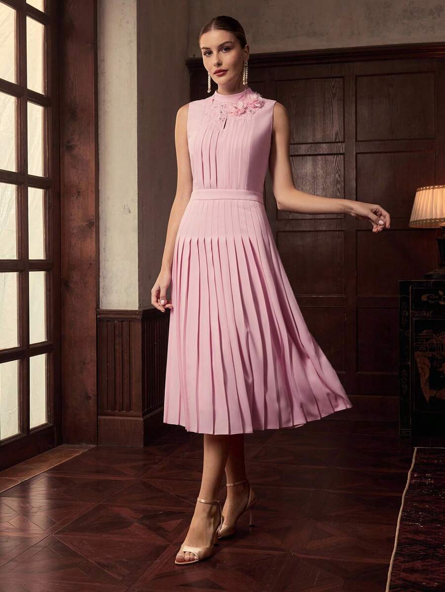 MIU Women's Elegant Pleated Floral Midi Dress,Graduation Dresses