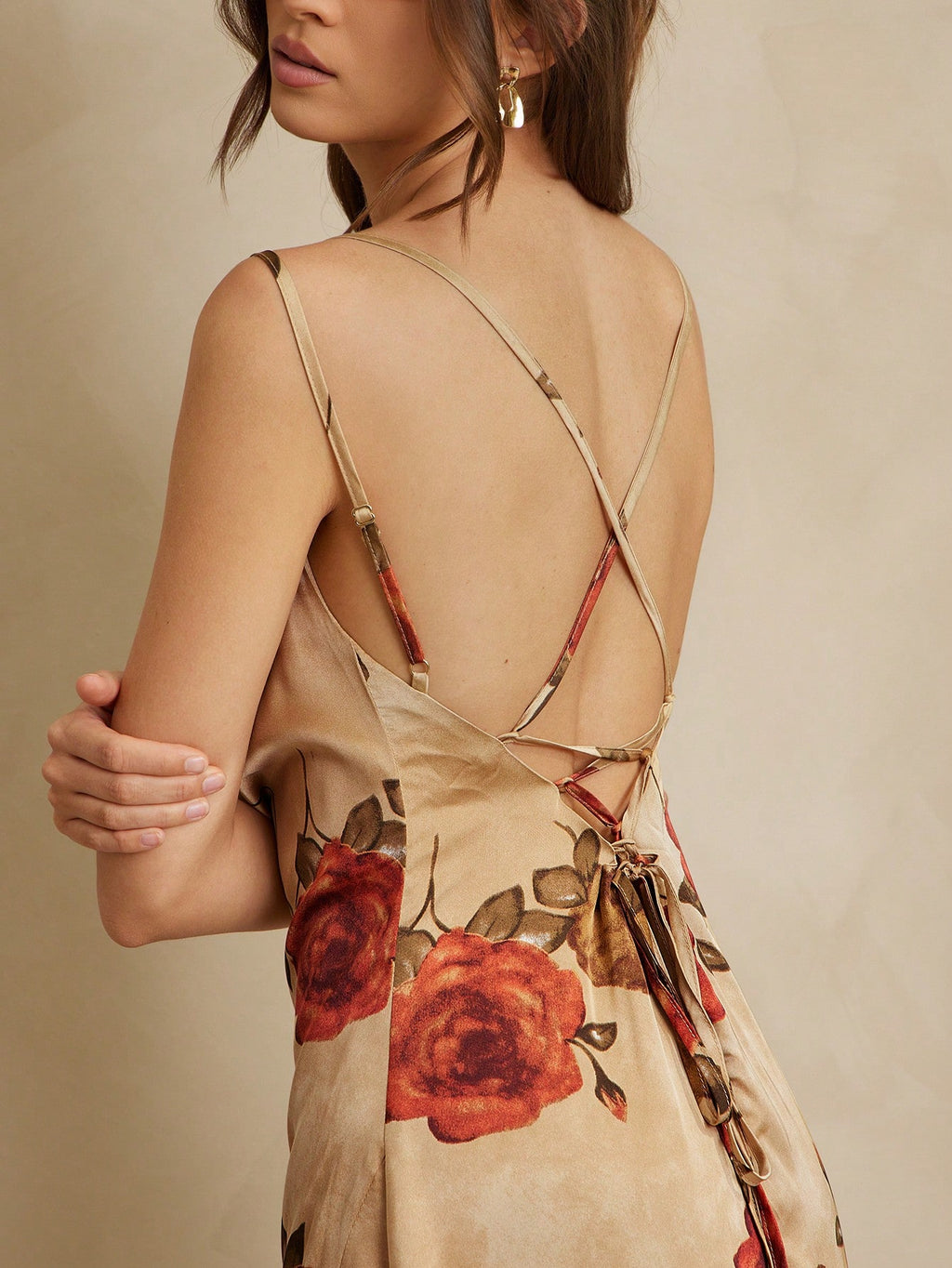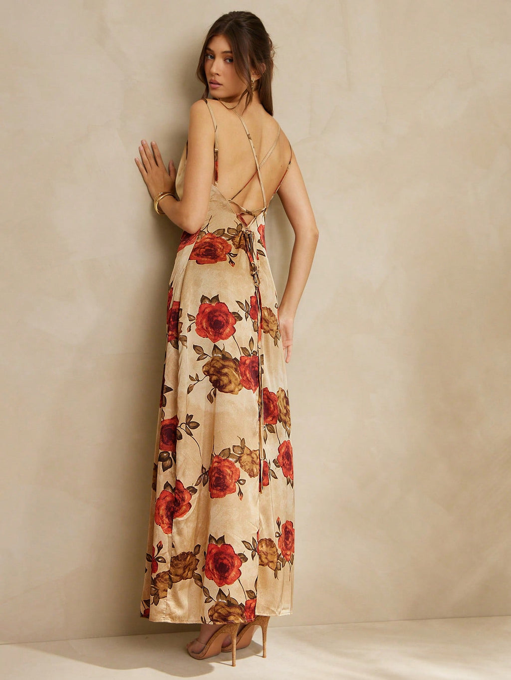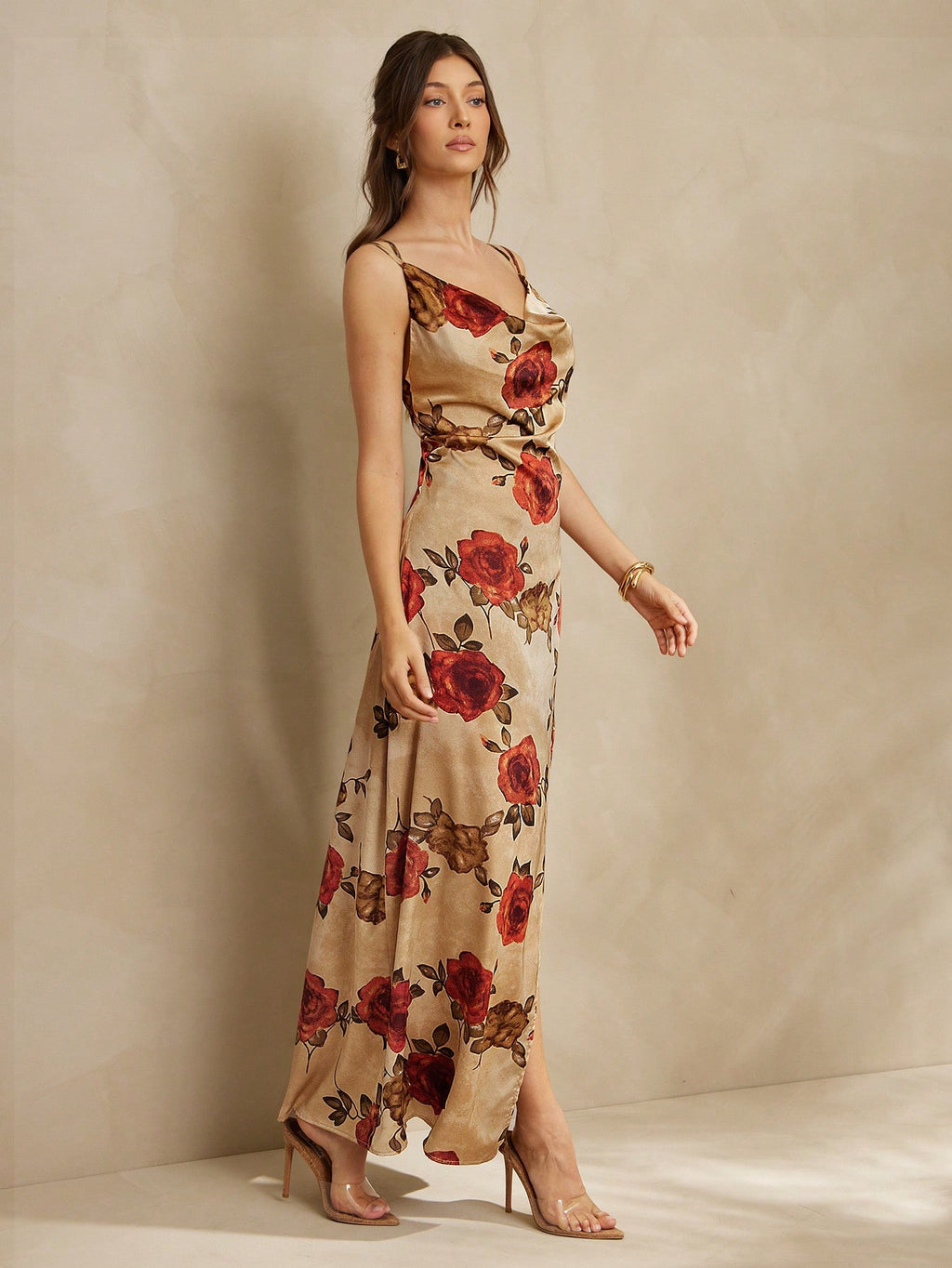 MIU Women's Elegant Sexy Floral Print Satin Sleeveless Cowl Neck Strappy Back Formal Summer Vacation Maxi Dress With Side Slit, Summer Outfits For Women, Vacation Outfits, 4th Of July Outffits, Beach Outfits For Woman