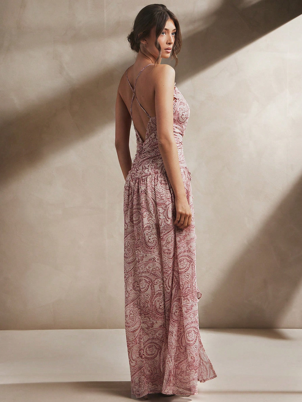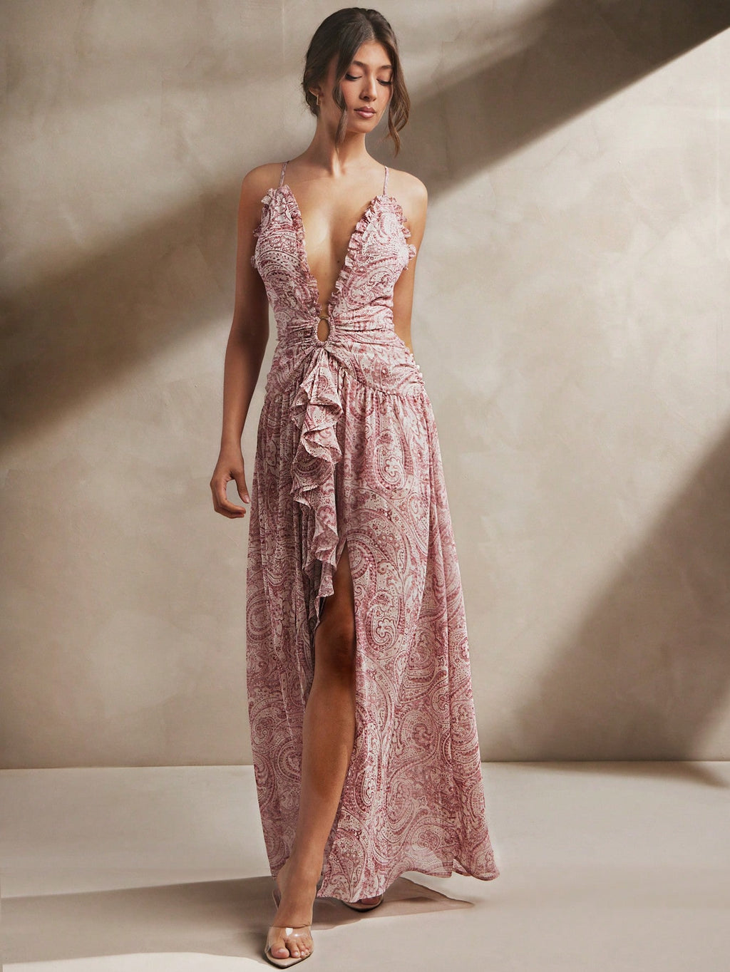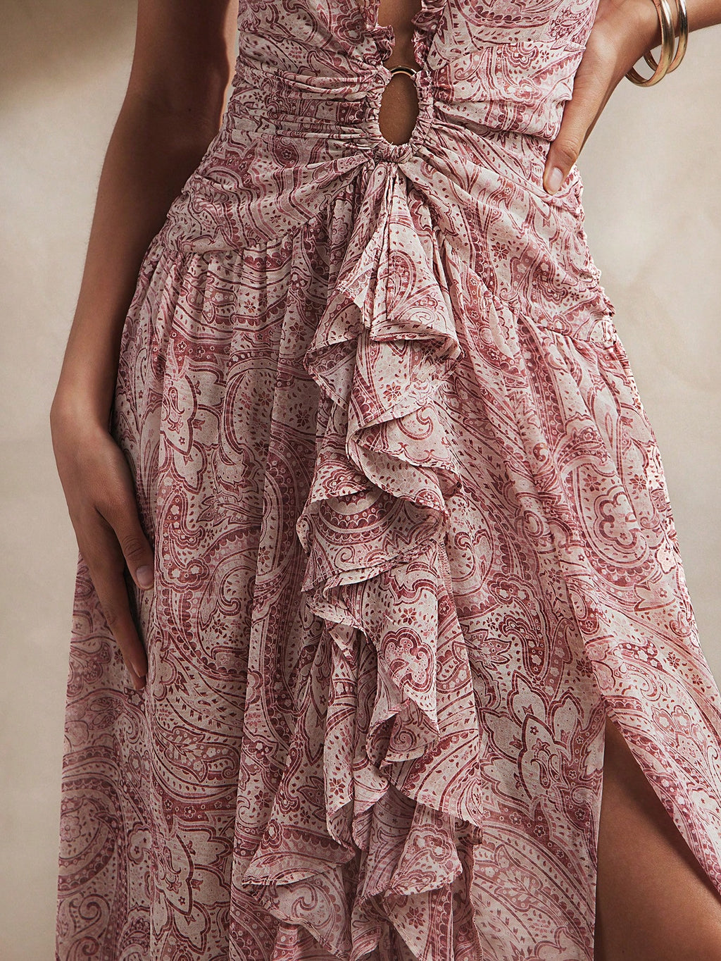MIU Women's Elegant Sexy Sleeveless Low Neckline Ruffle Detail Paisley Print Chiffon Boho Style Side Slit Maxi Dress, Summer Outfits For Women, Beach Outfits For Women, 4th Of July Outfits