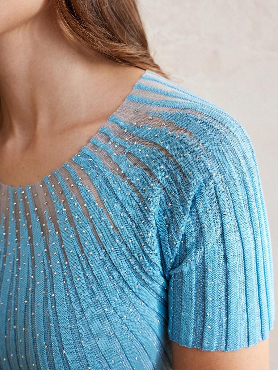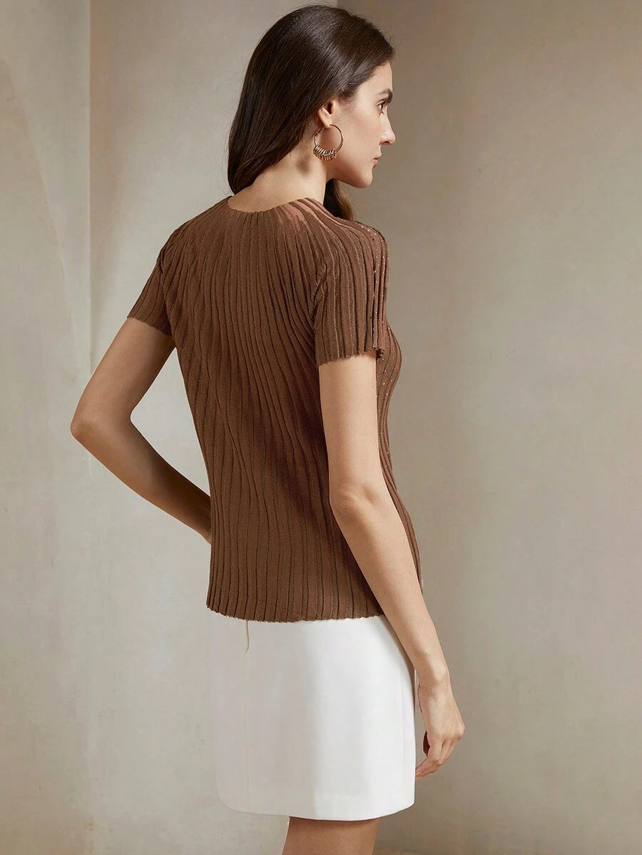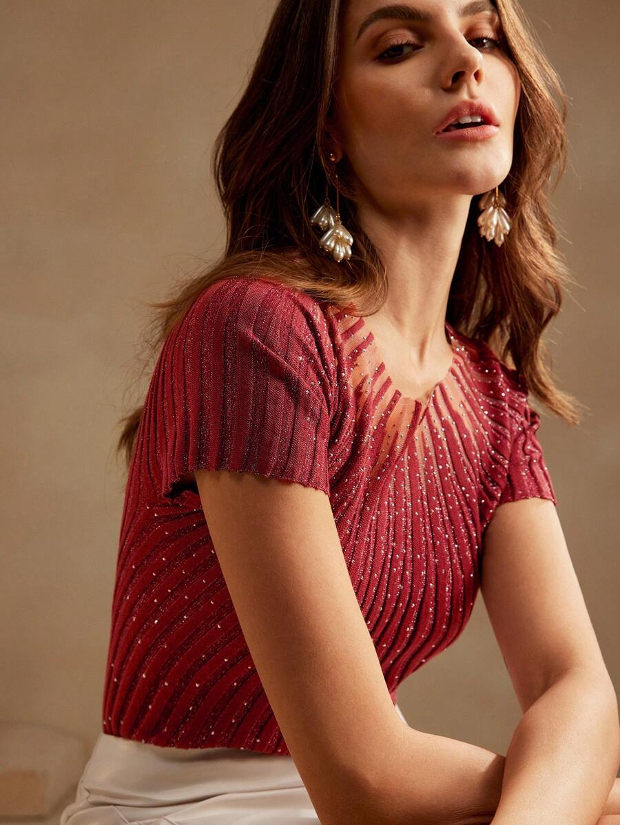 MIU Women's Elegant Short Sleeve Rhinestone Decor Semi-Sheer Knit Top