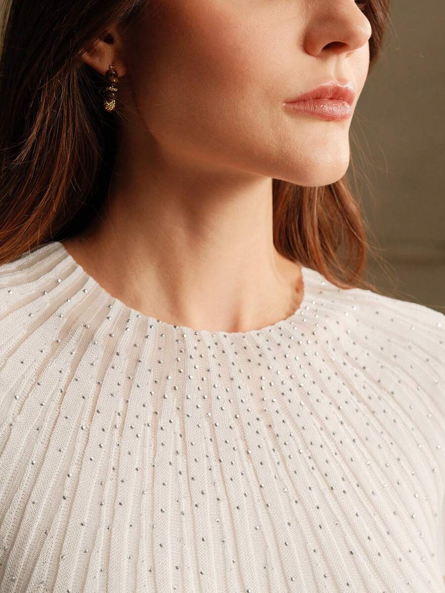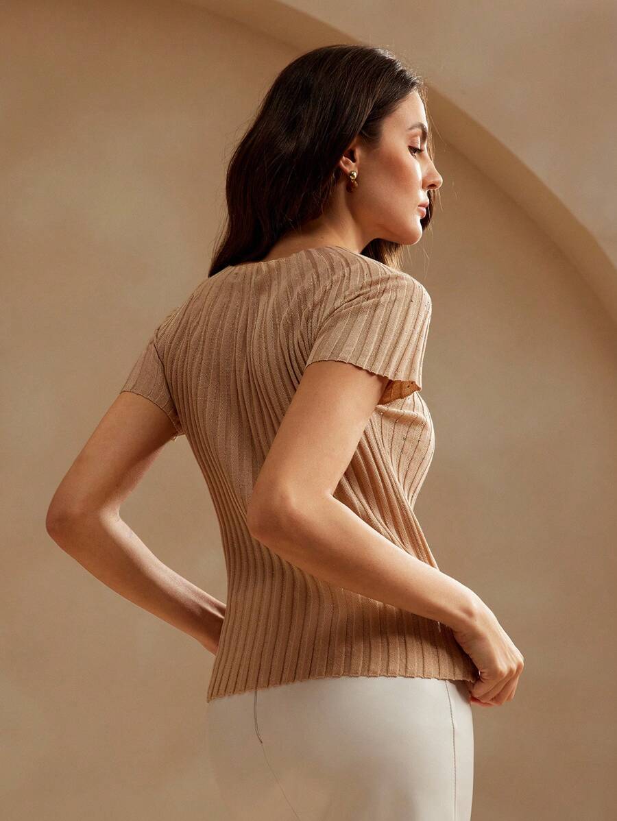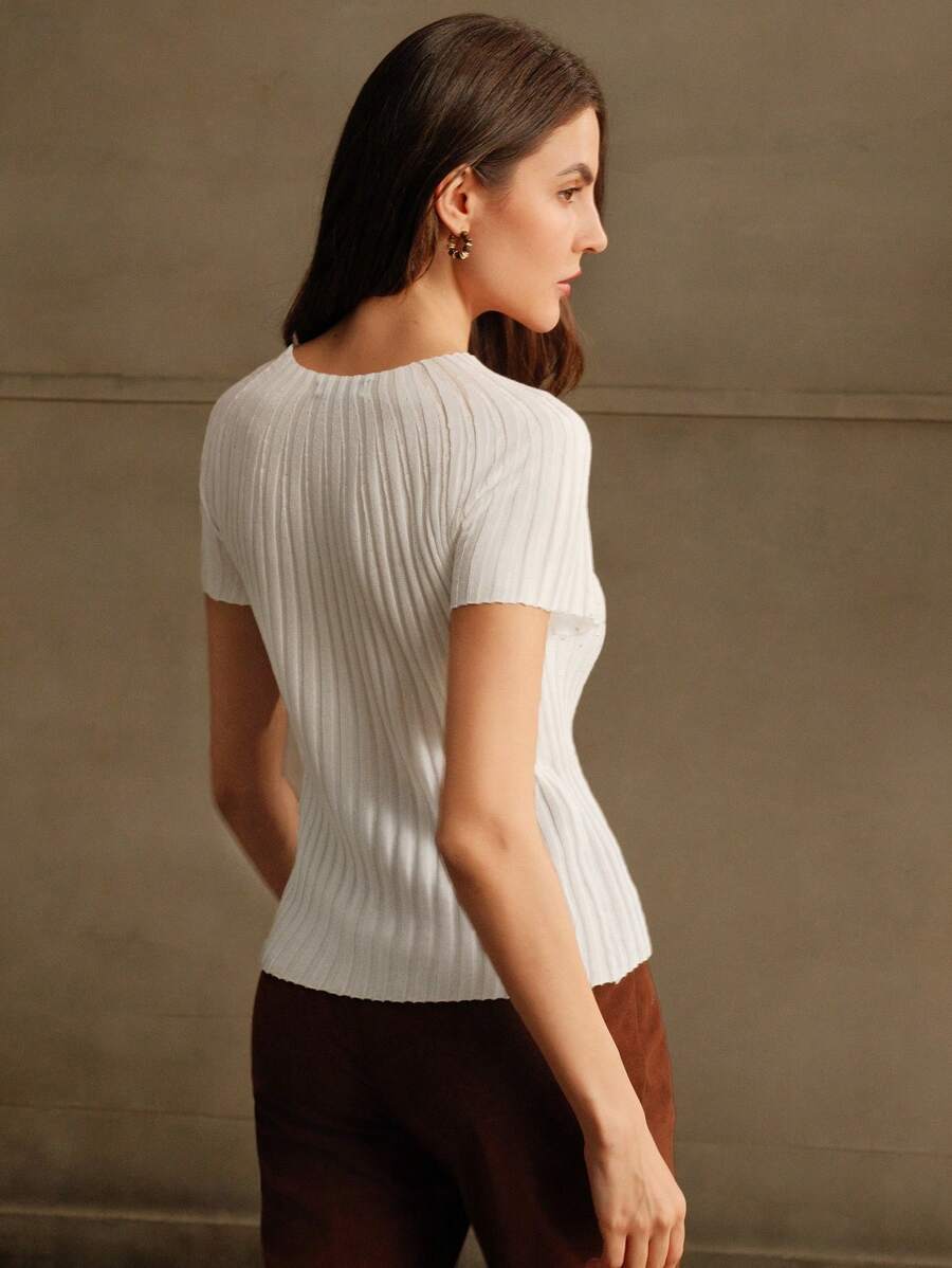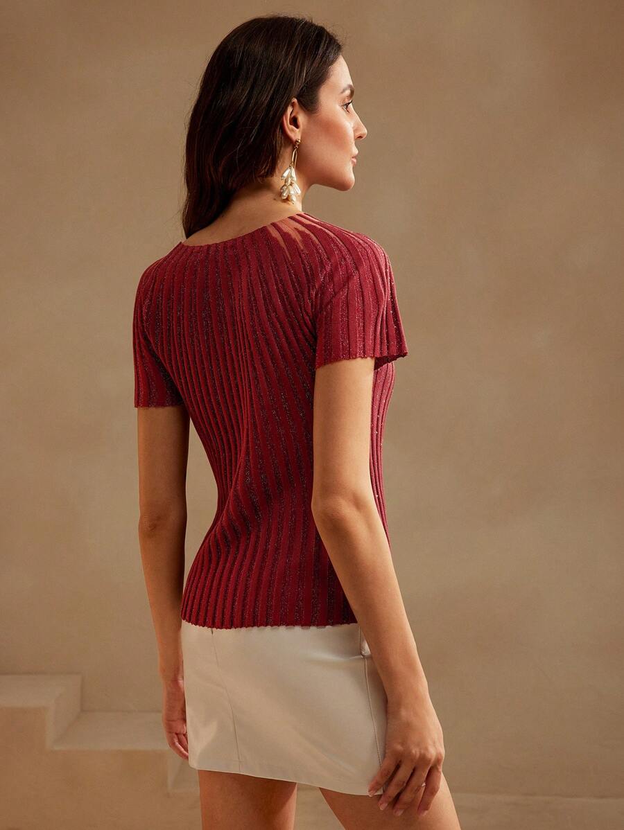 MIU Women's Elegant Short Sleeve Rhinestone Decor Semi-Sheer Knit Top