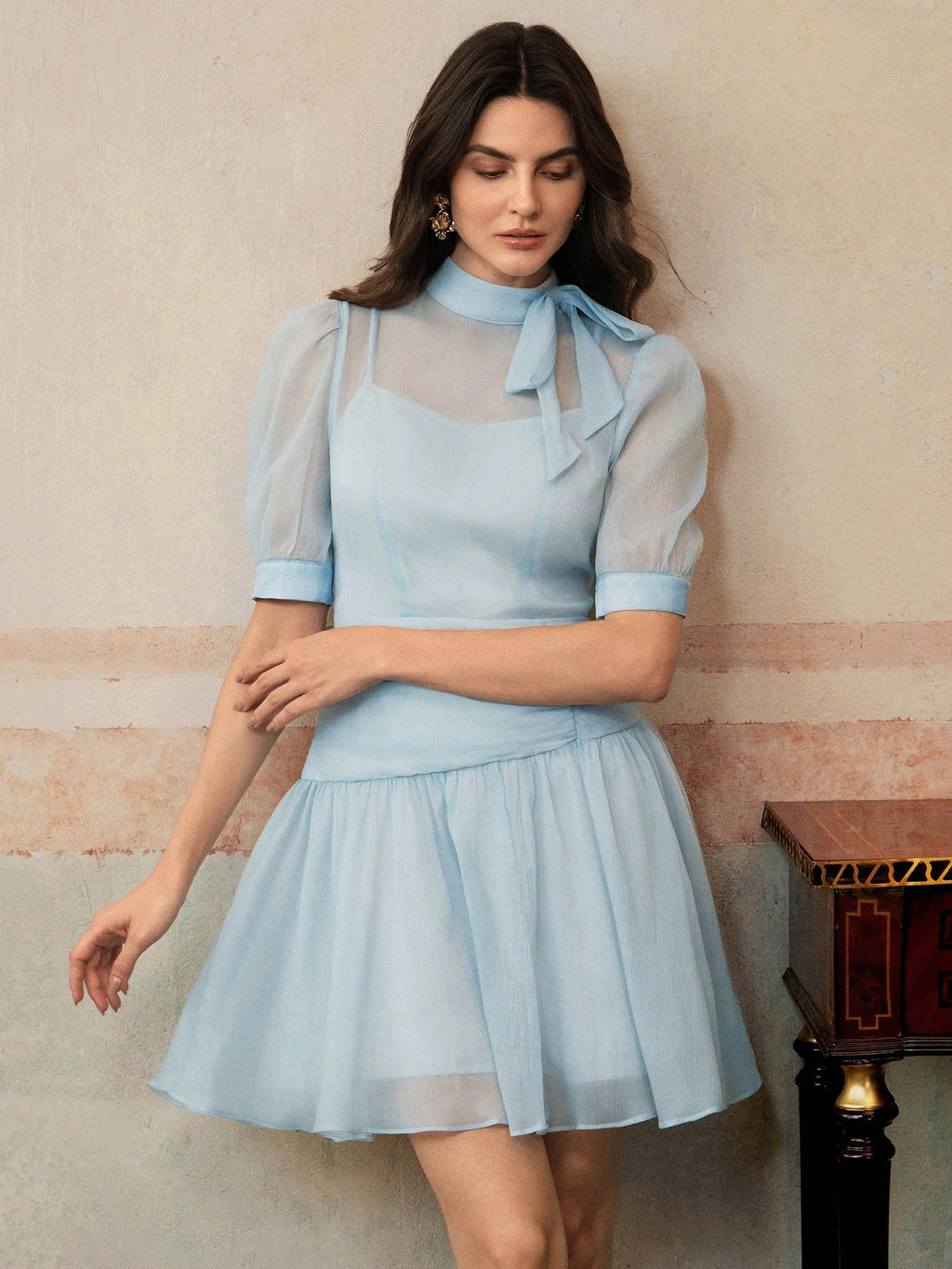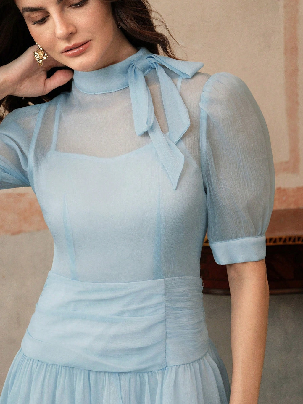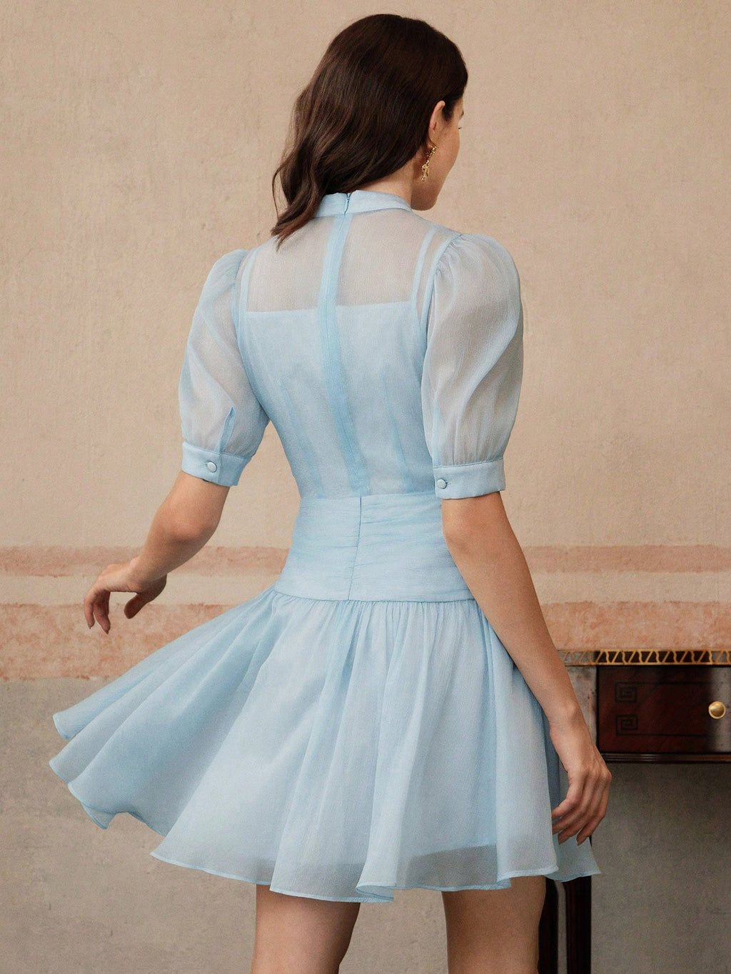 MIU AZRA Ženska Crna Crep Haljina sa Nabranom Ovratnikom i Rukavima u Zvonu