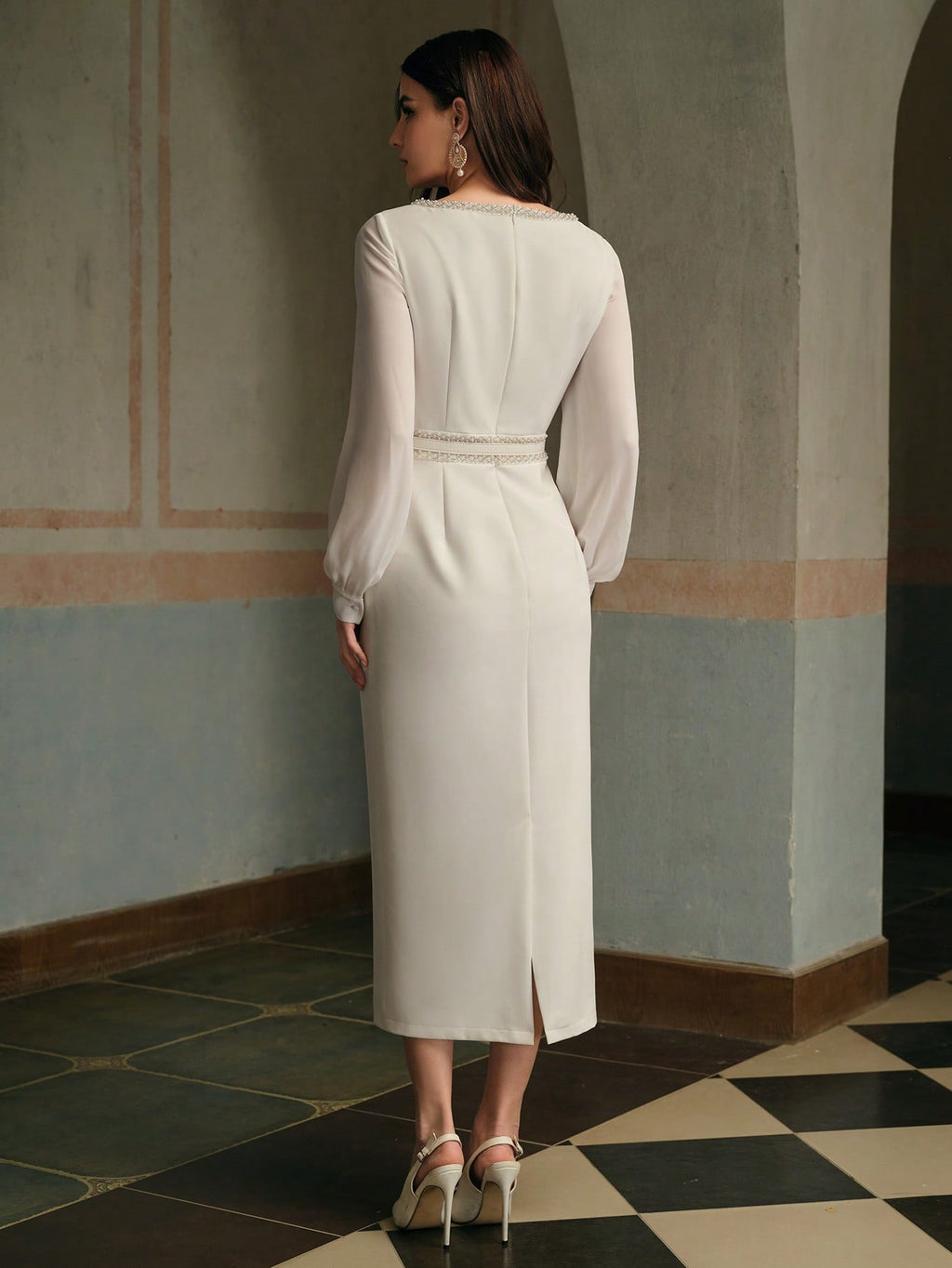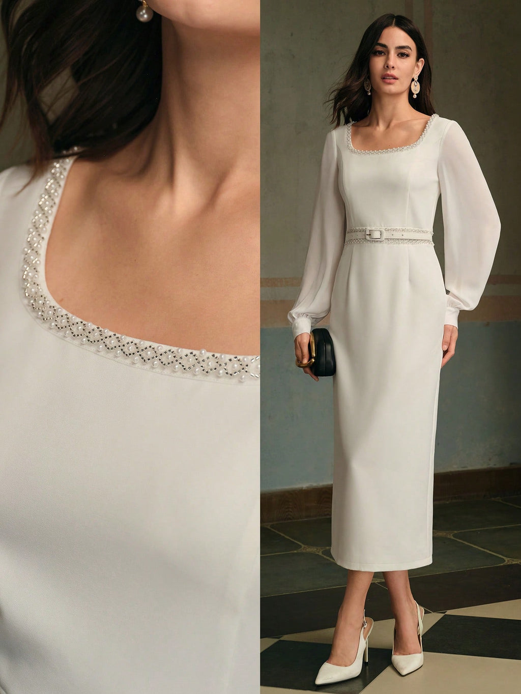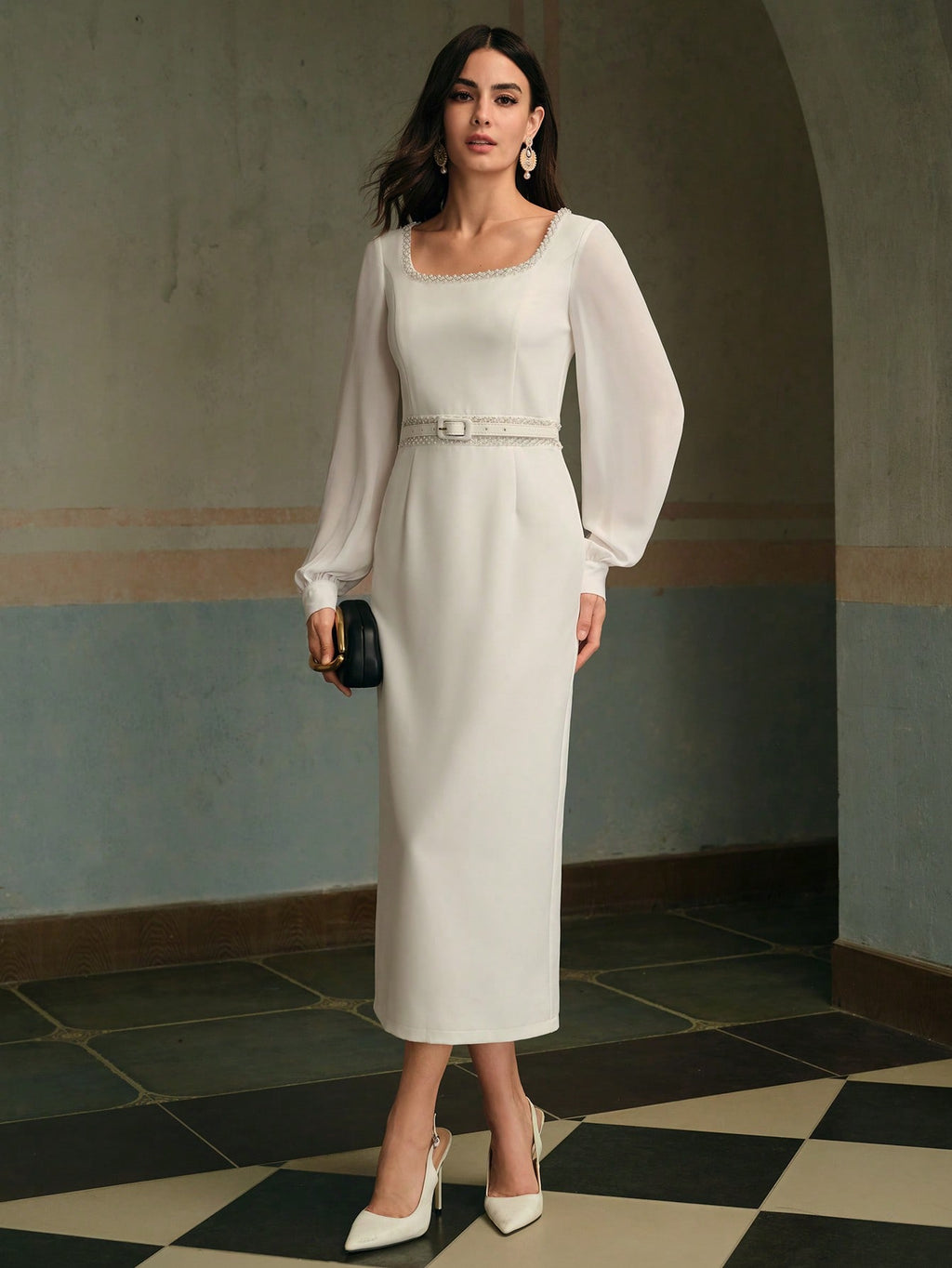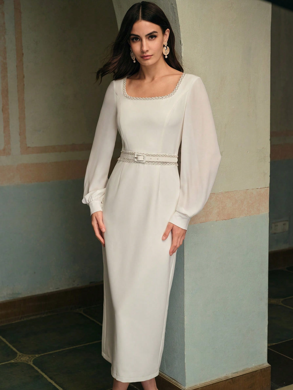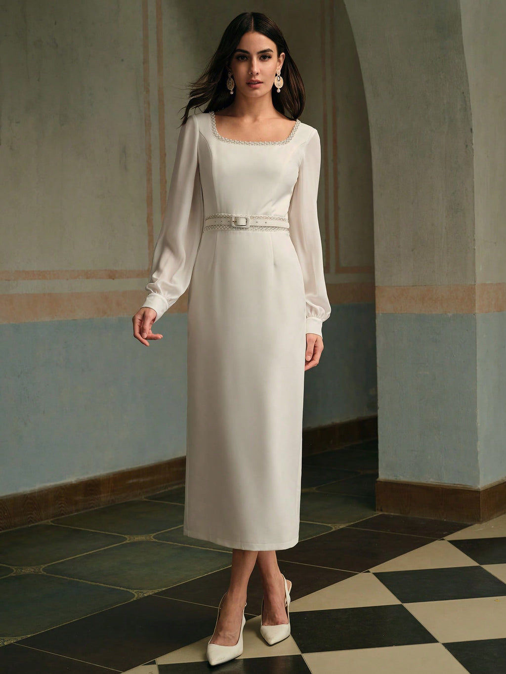 MIU Women's Elegant U-Neck Long Sleeve Belted Midi Dress, Summer White Dress