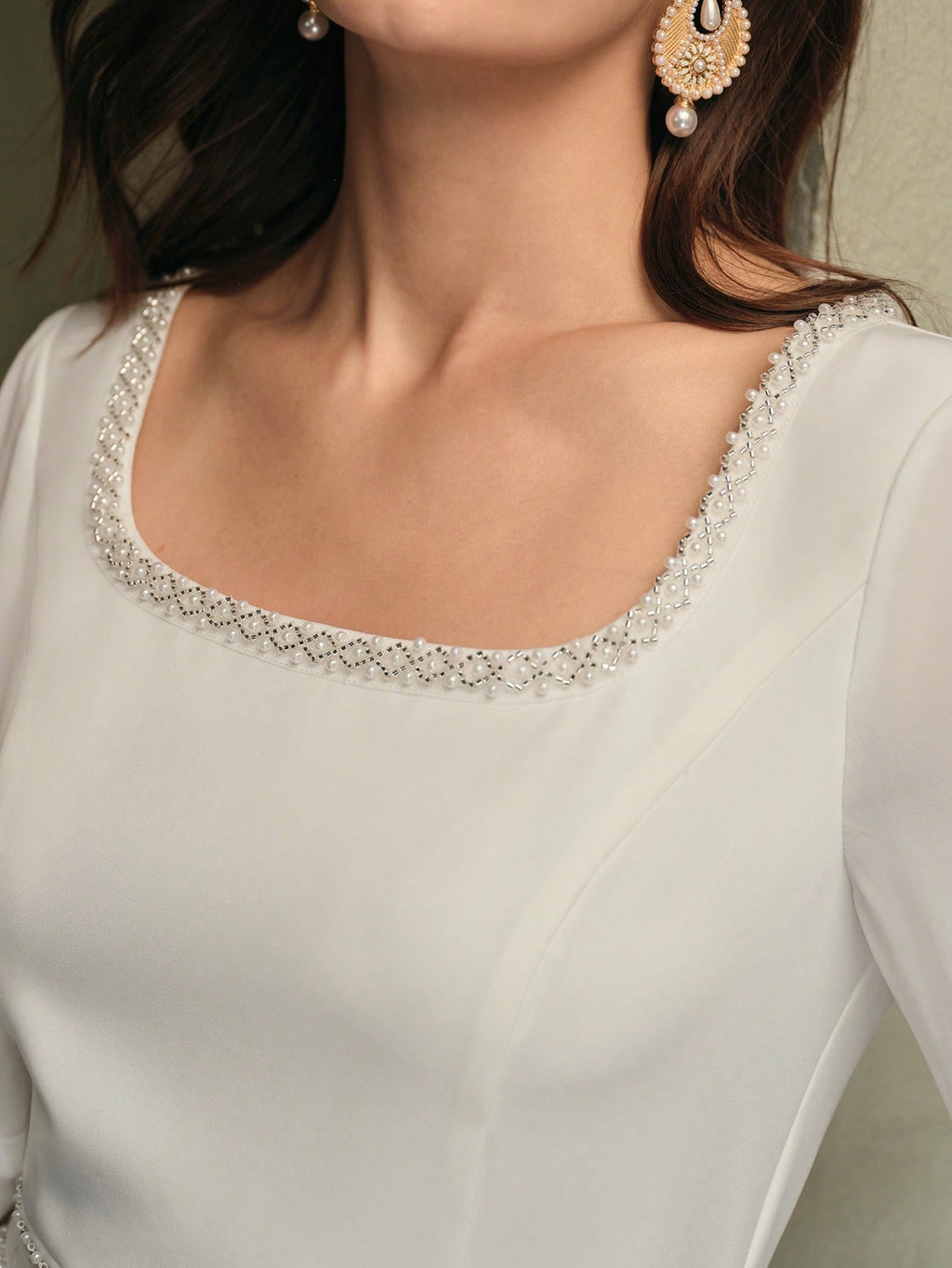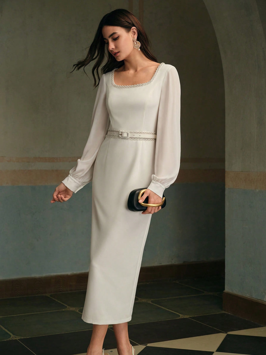 MIU Women's Elegant U-Neck Long Sleeve Belted Midi Dress, Summer White Dress