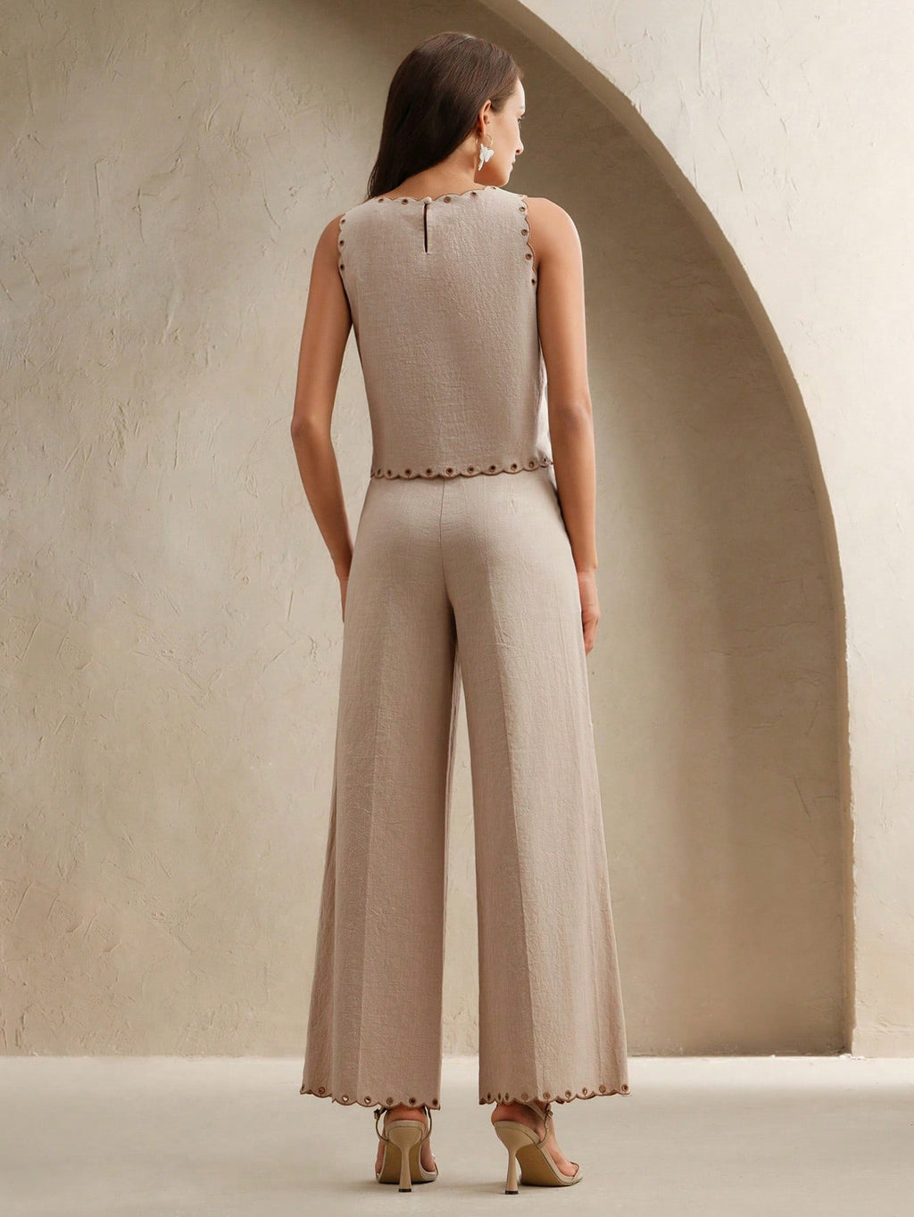 MIU Women's Elegant Vacation Solid Color Hollow Embroidered Blouse T-Shirt And Wide Leg Pants/Trousers 2 Pieces Set, Spring/Summer, Suitable For Festival, Graduation