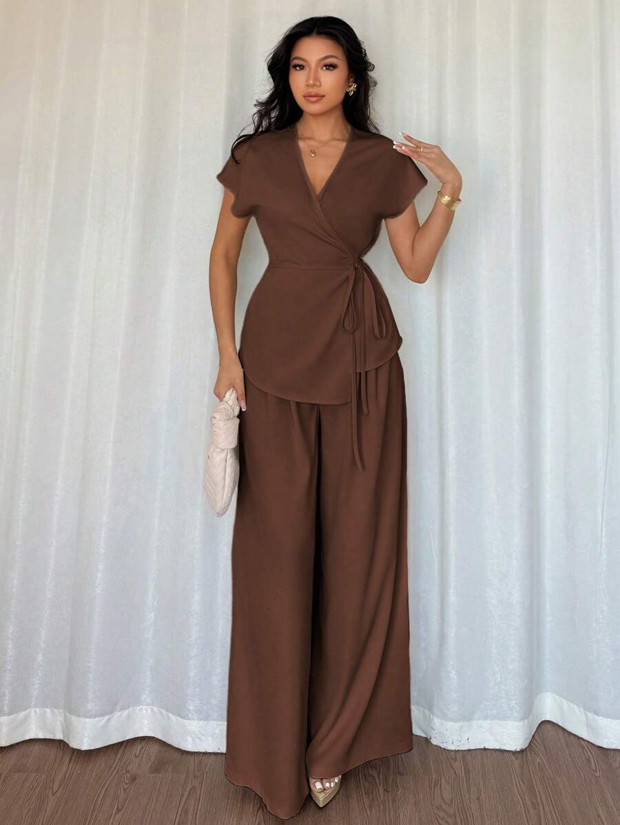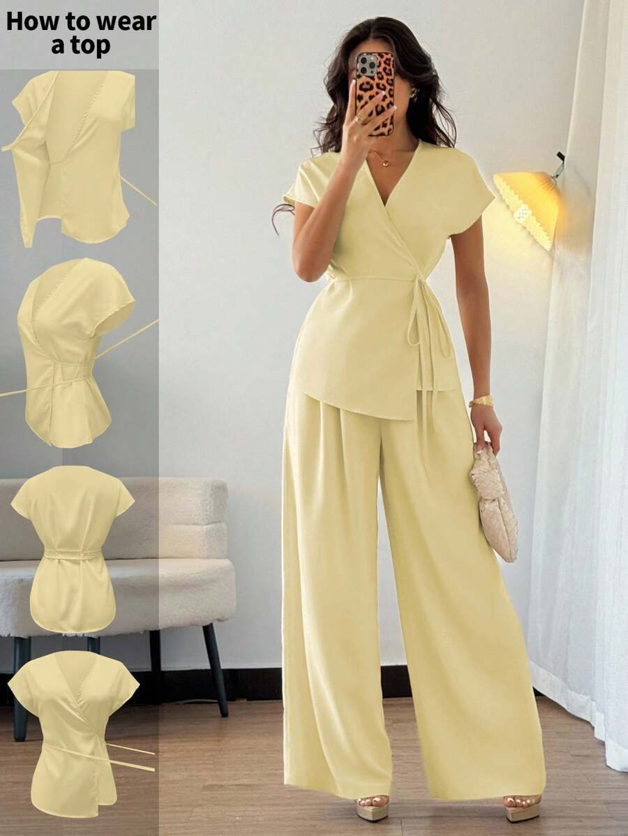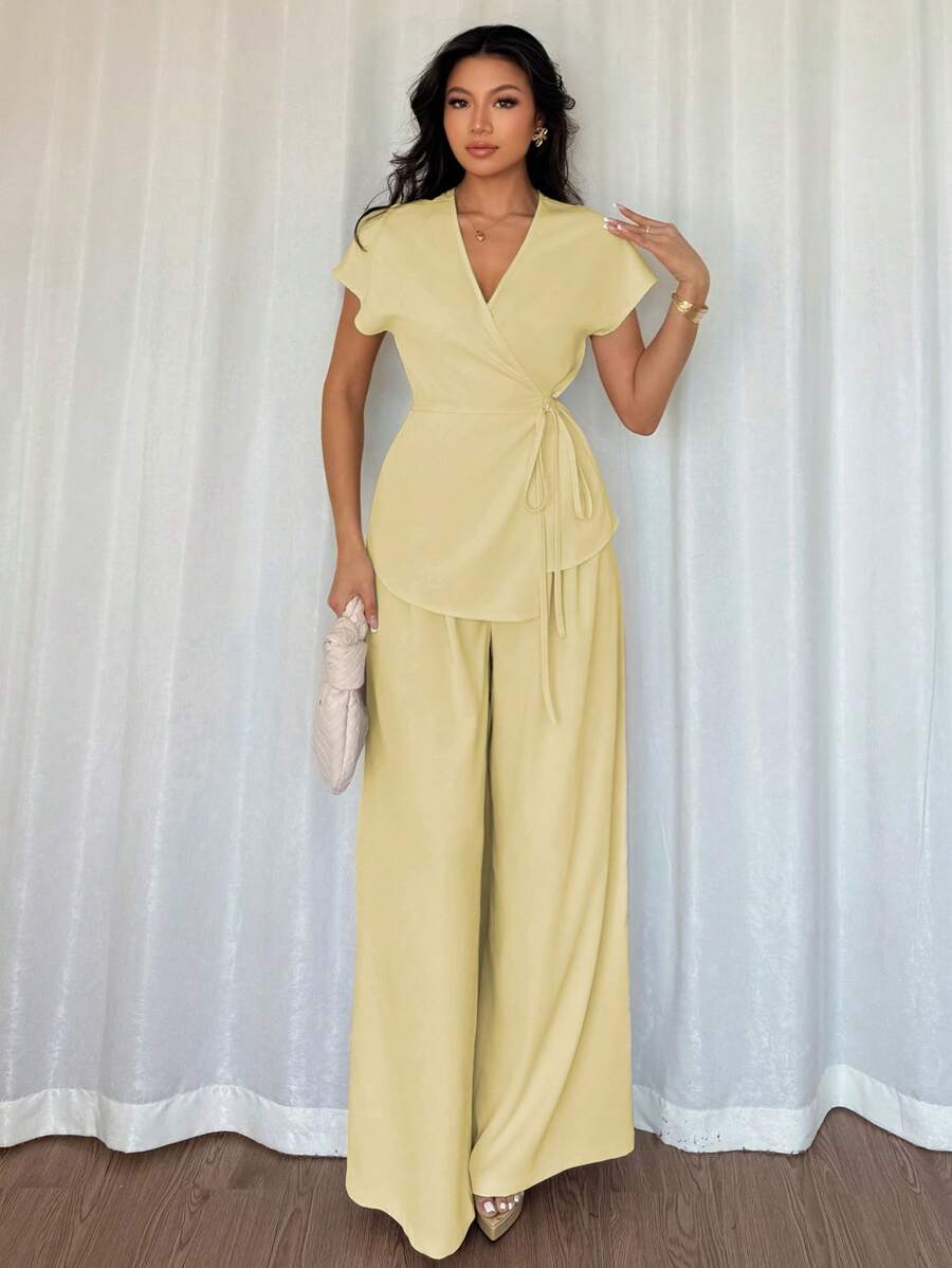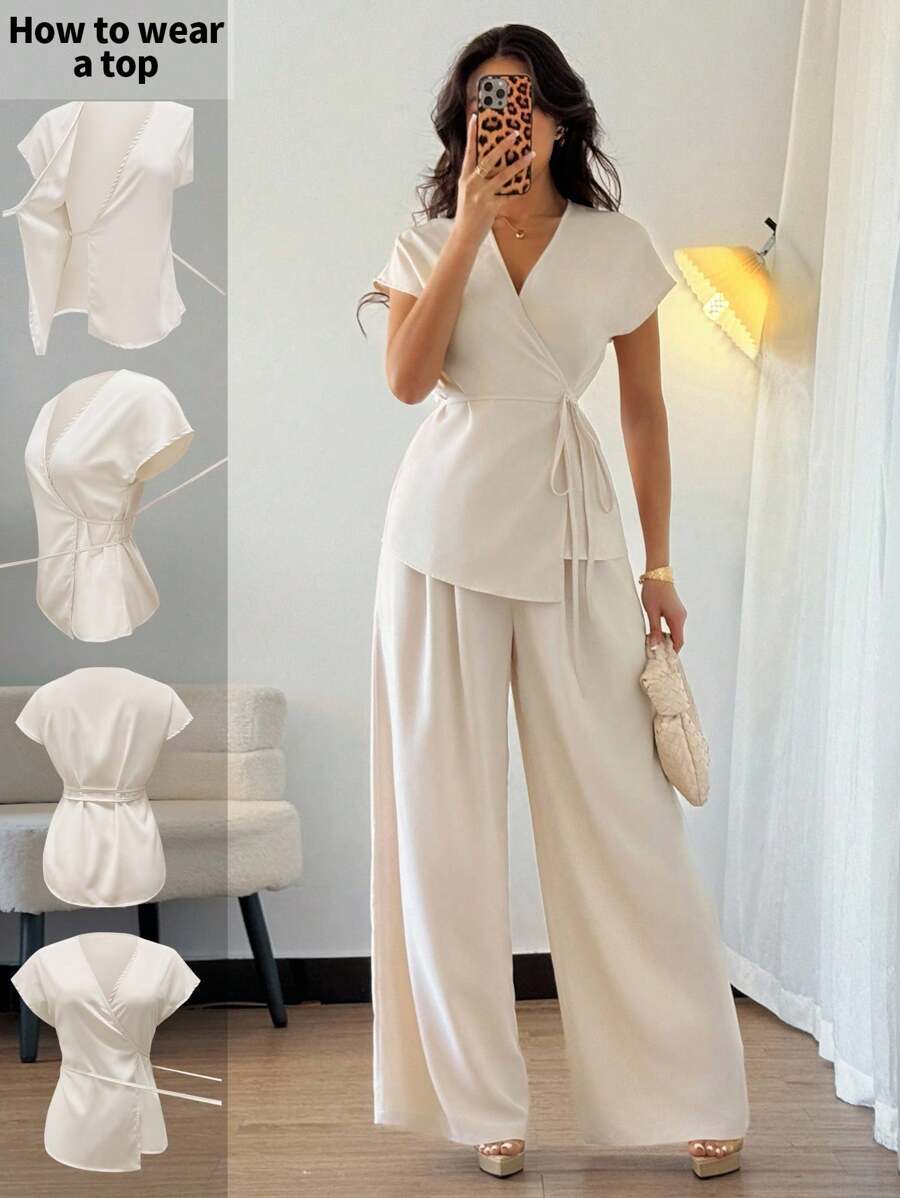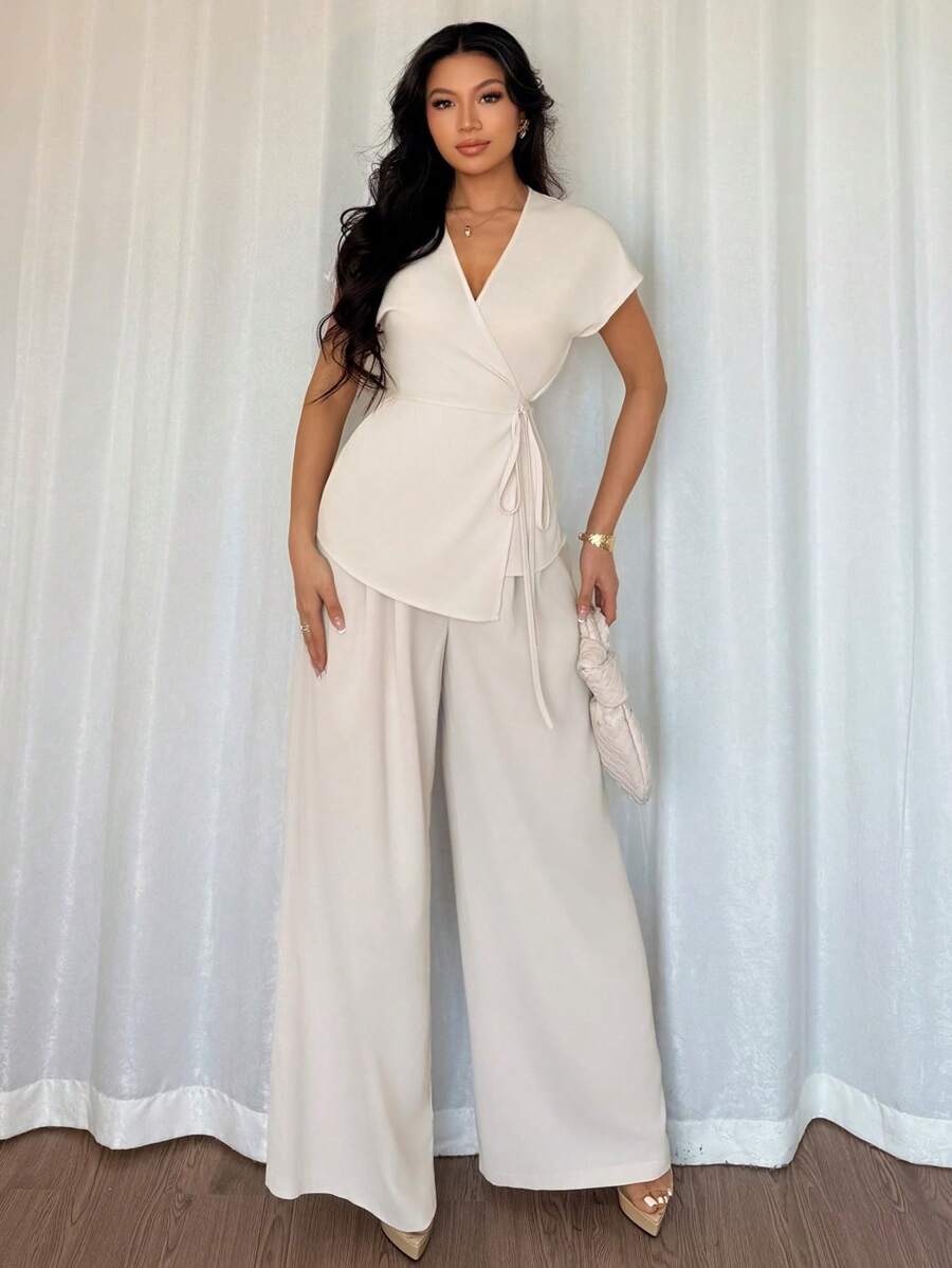 MIU Women's Elegant Wrap Around Batwing Sleeve Blouse Wide Leg Loose Pants 2 Pieces Set, Lightweight For Summer Outing, Date, Vacation, Beige Color