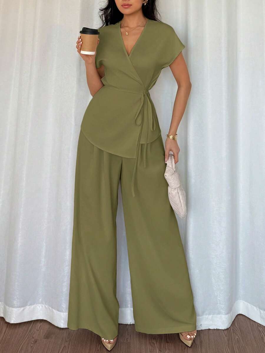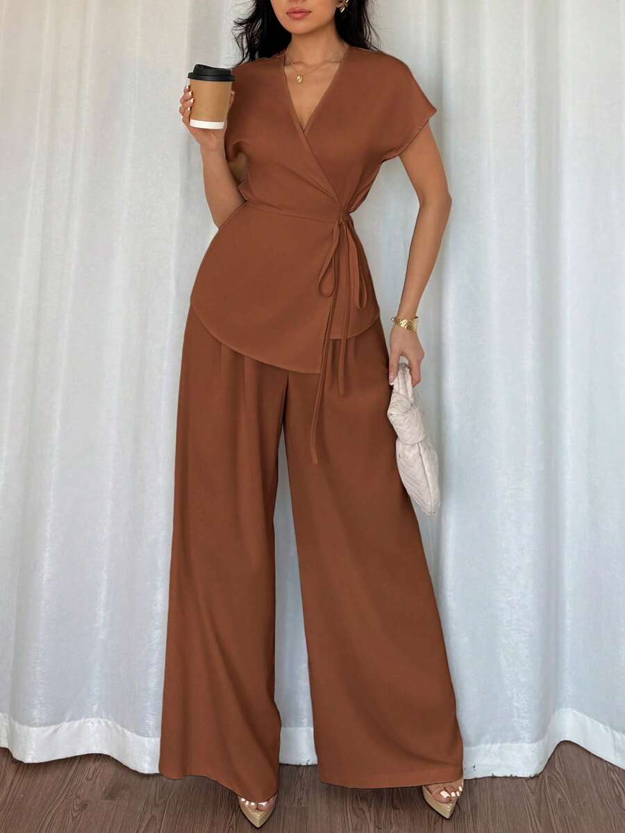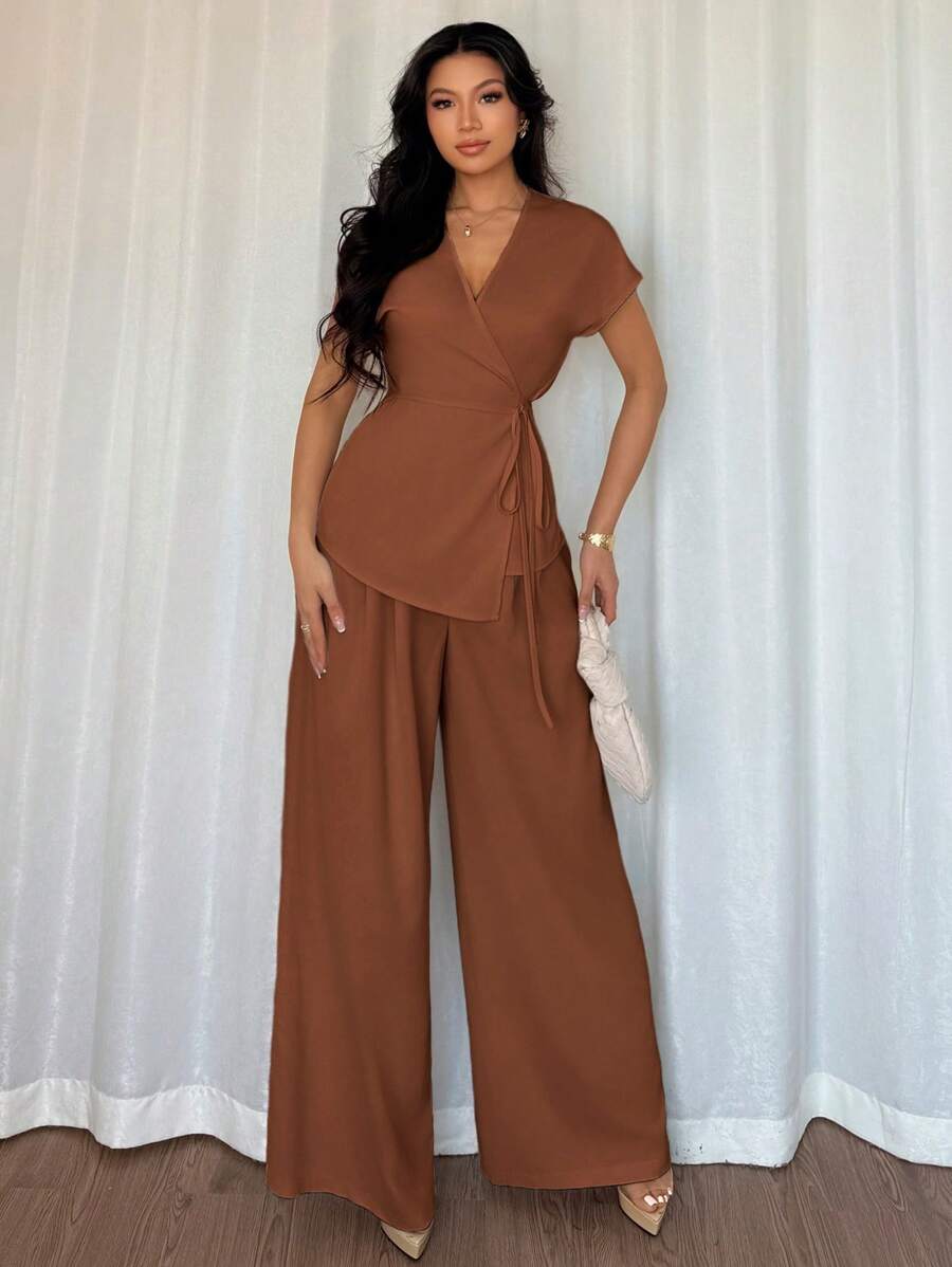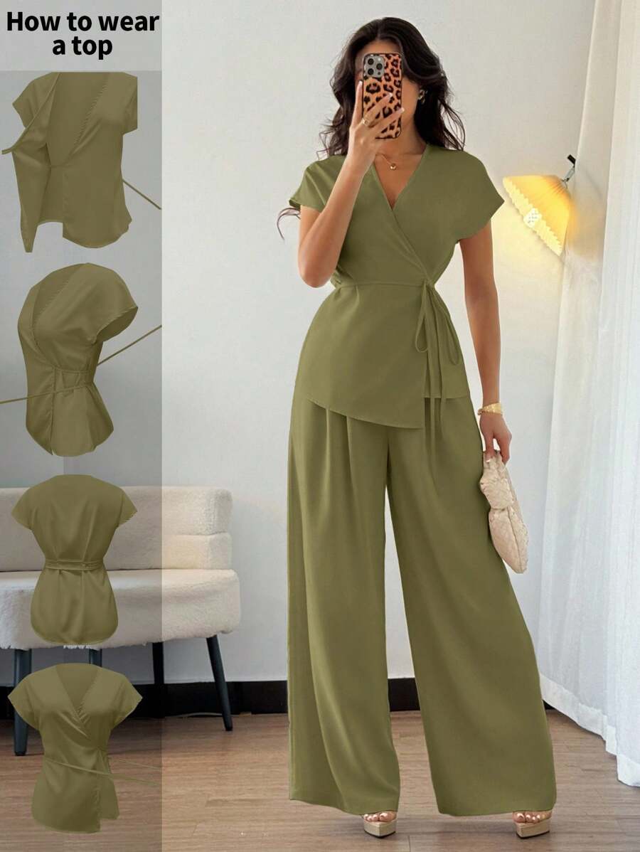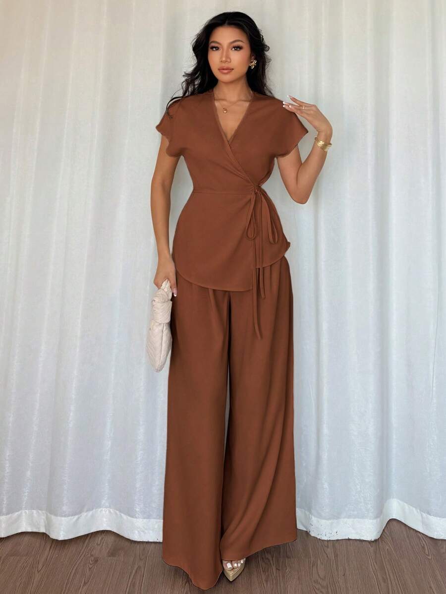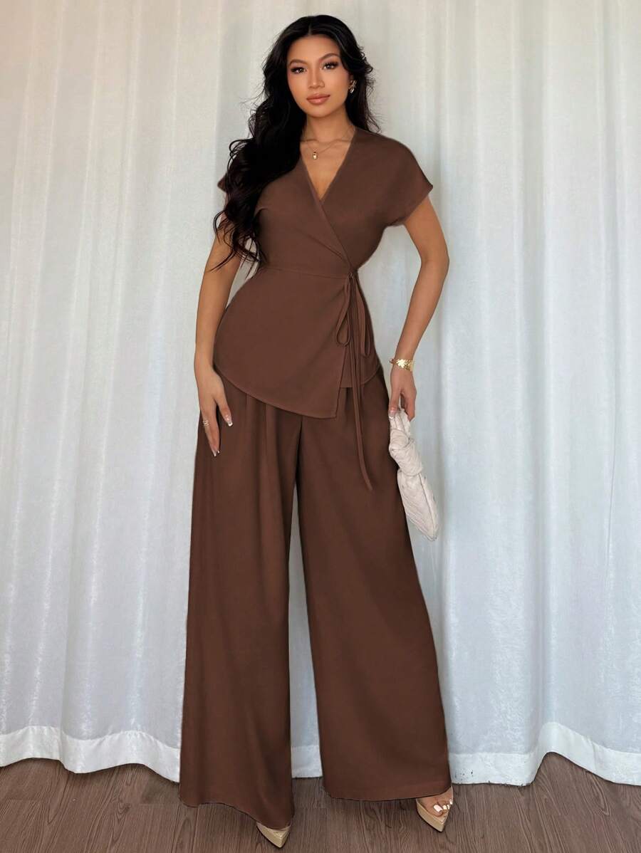 MIU Women's Elegant Wrap Around Batwing Sleeve Blouse Wide Leg Loose Pants 2 Pieces Set, Lightweight For Summer Outing, Date, Vacation, Beige Color