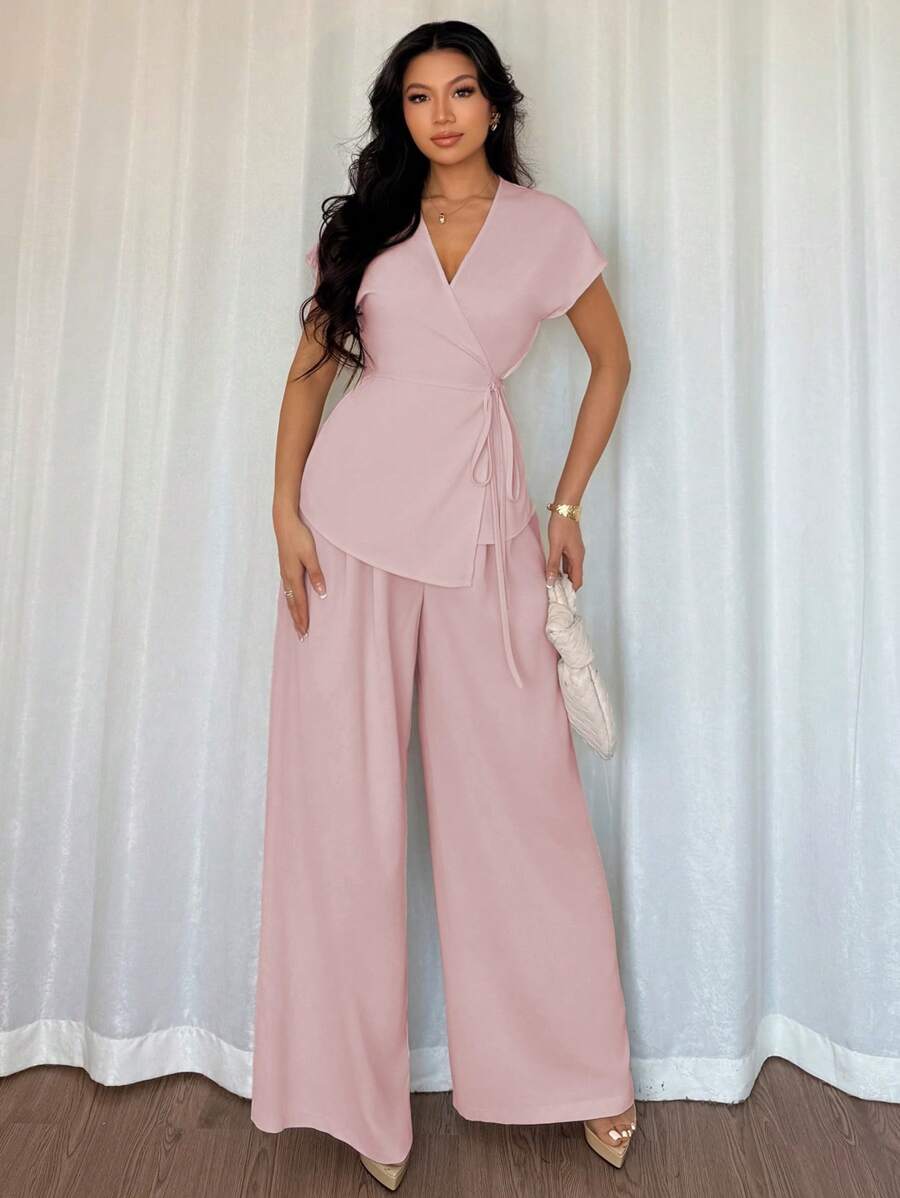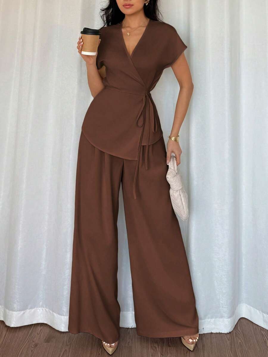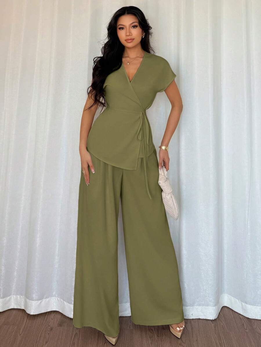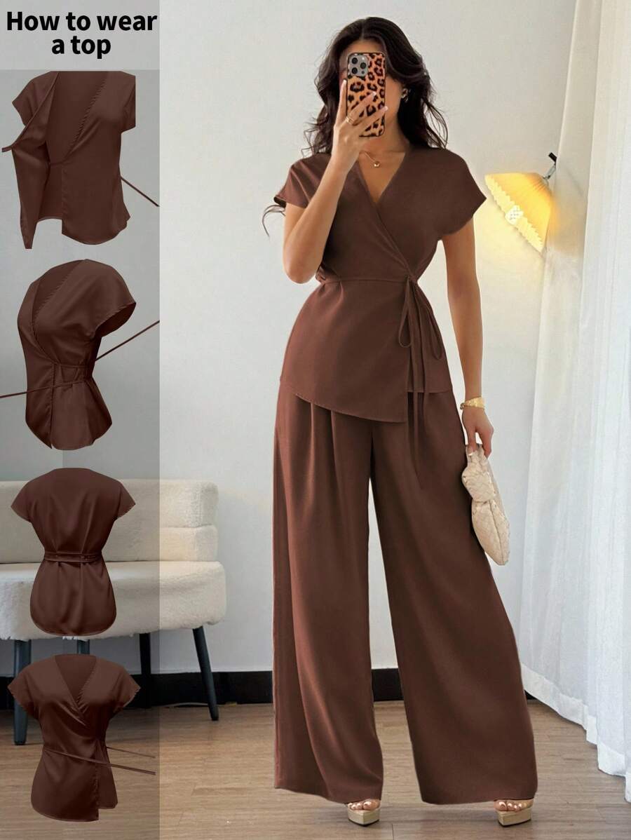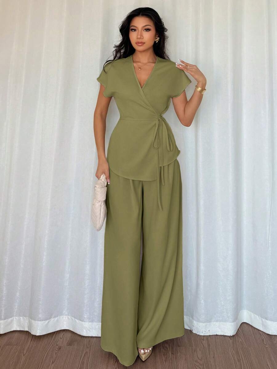 MIU Women's Elegant Wrap Around Batwing Sleeve Blouse Wide Leg Loose Pants 2 Pieces Set, Lightweight For Summer Outing, Date, Vacation, Beige Color