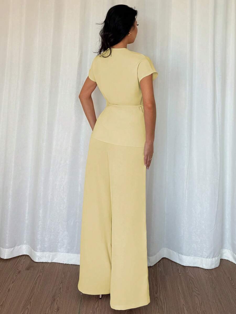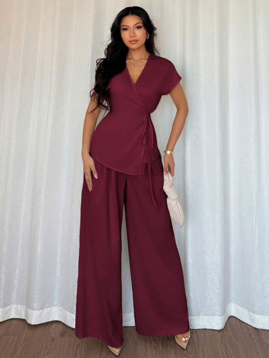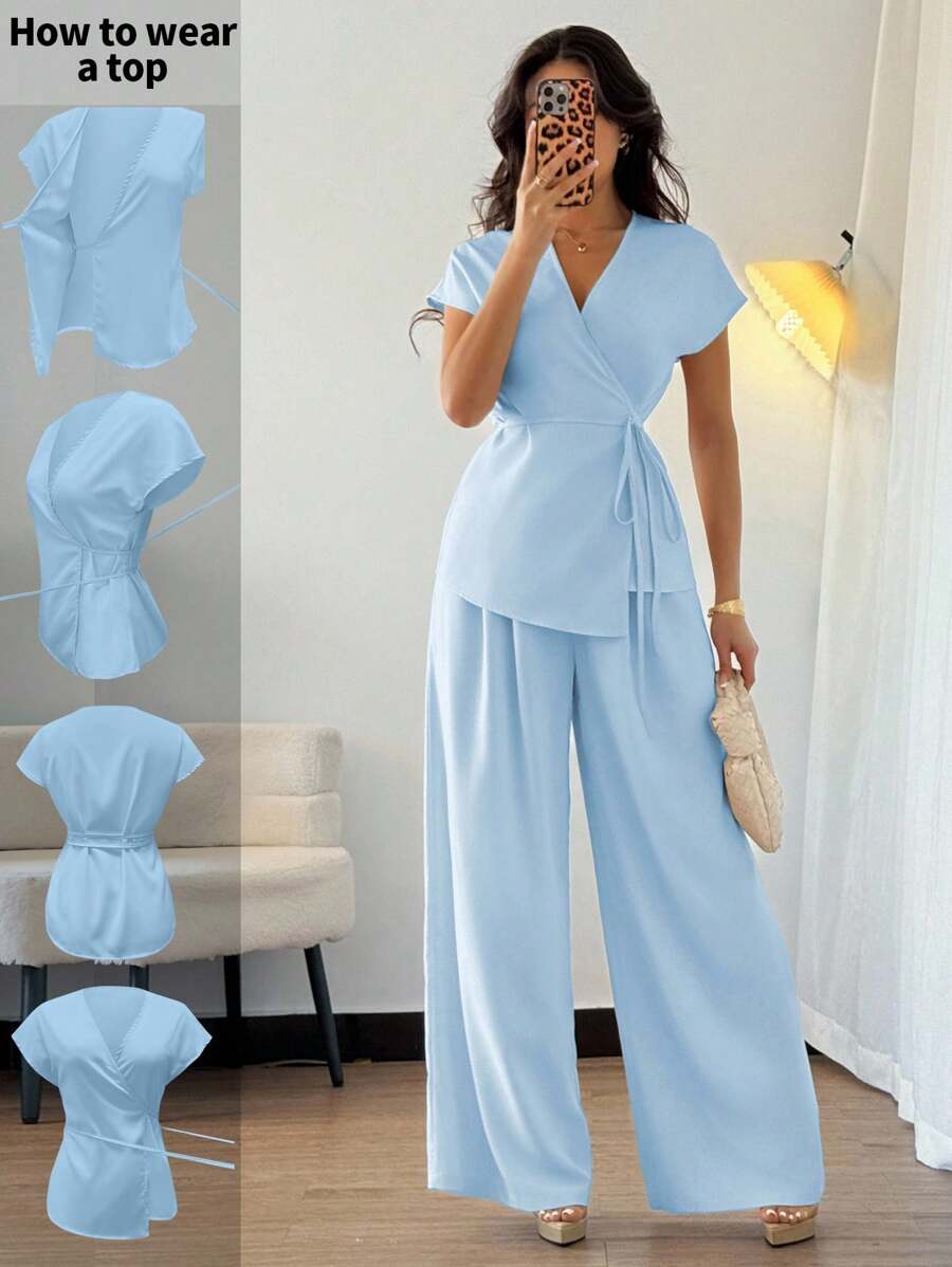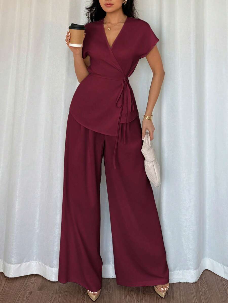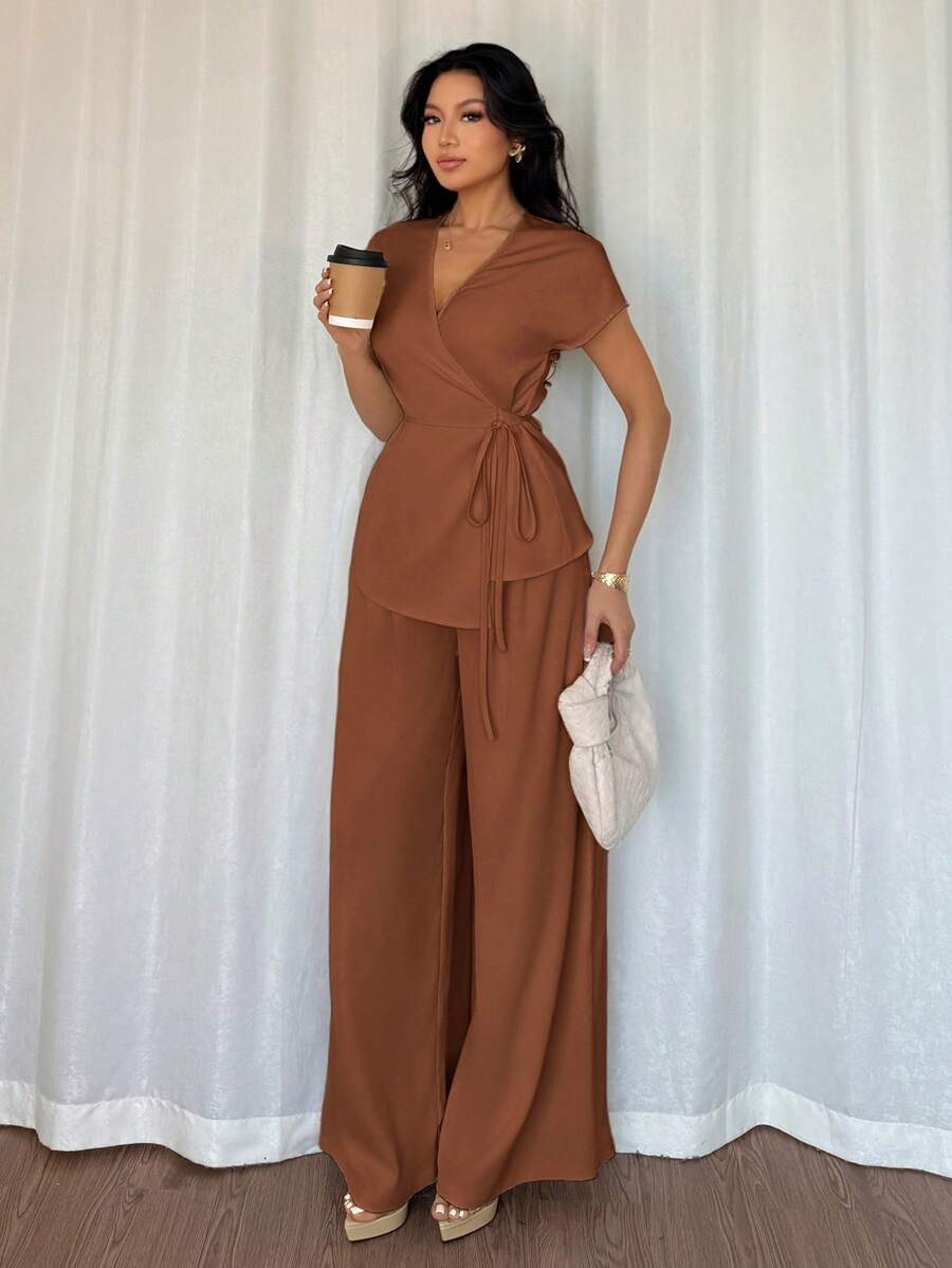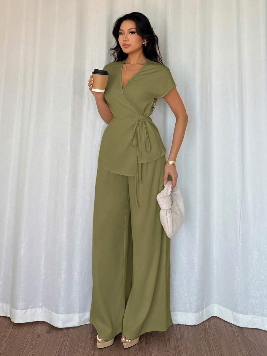 MIU Women's Elegant Wrap Around Batwing Sleeve Blouse Wide Leg Loose Pants 2 Pieces Set, Lightweight For Summer Outing, Date, Vacation, Beige Color