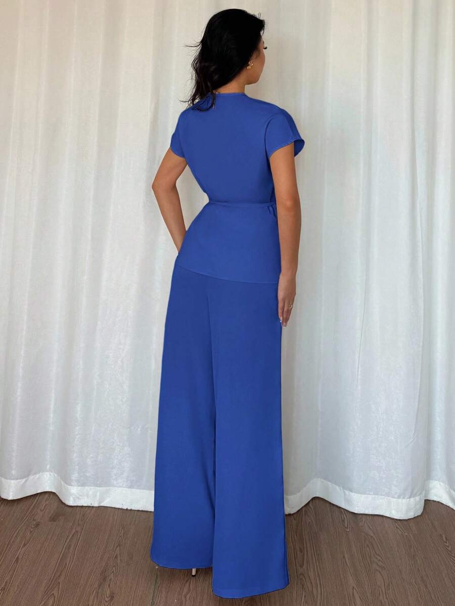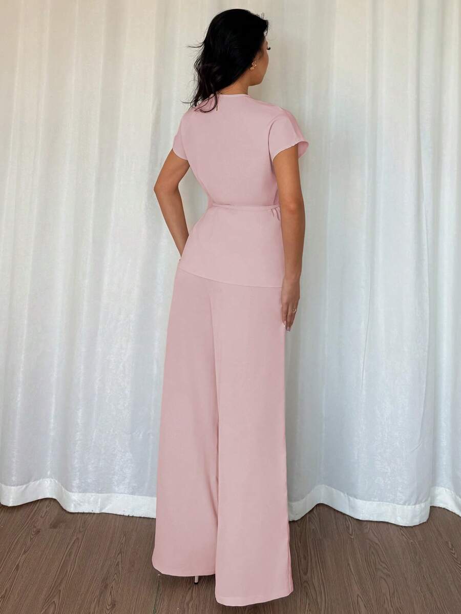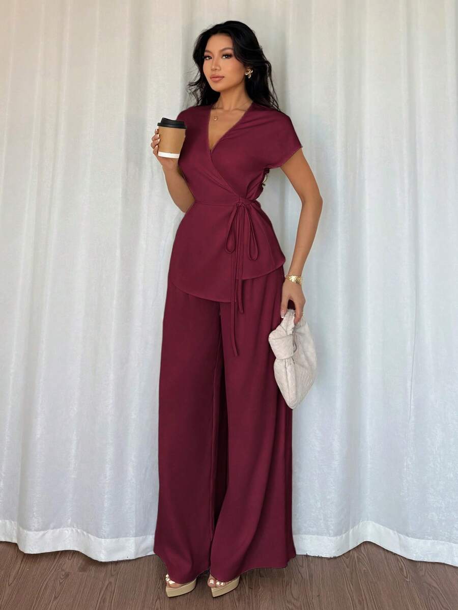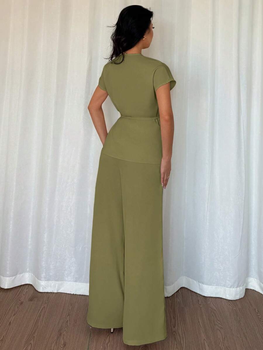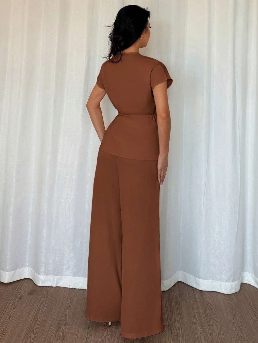 MIU Women's Elegant Wrap Around Batwing Sleeve Blouse Wide Leg Loose Pants 2 Pieces Set, Lightweight For Summer Outing, Date, Vacation, Beige Color