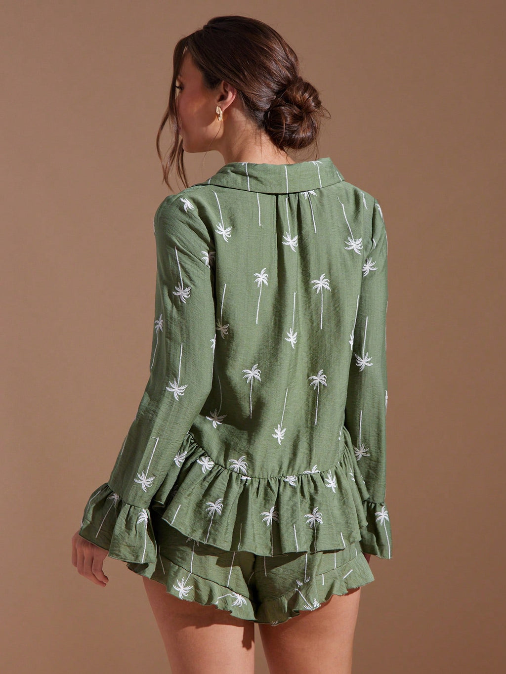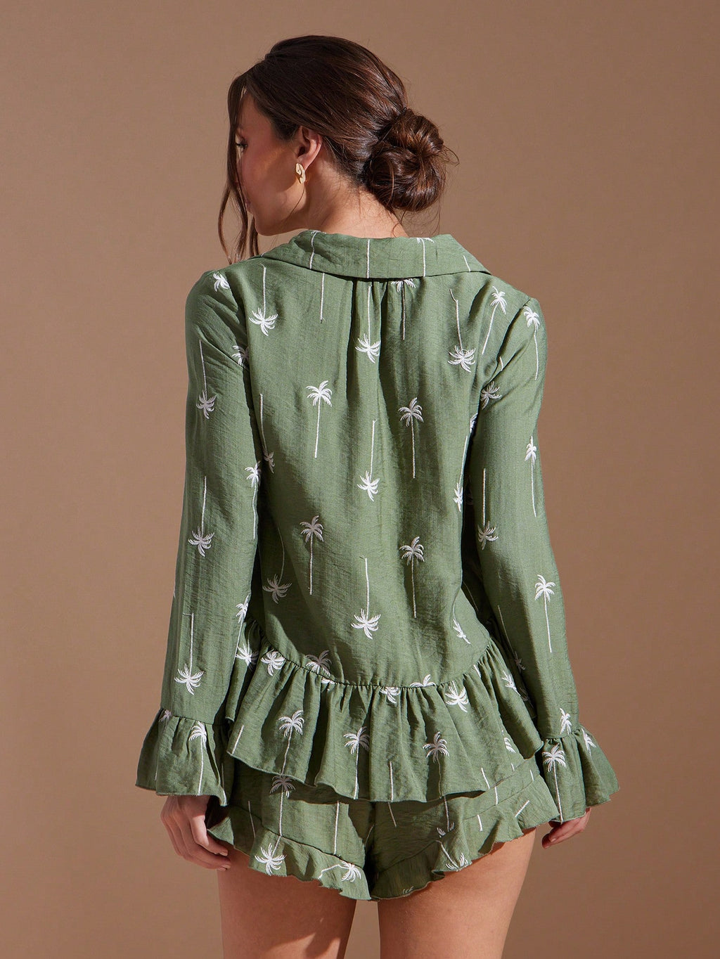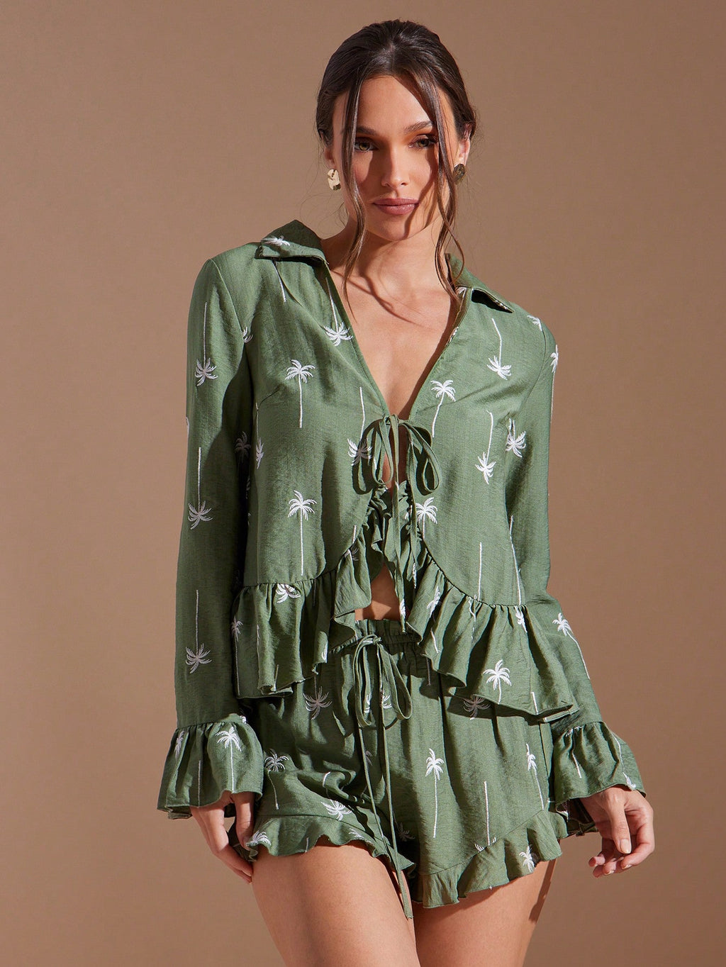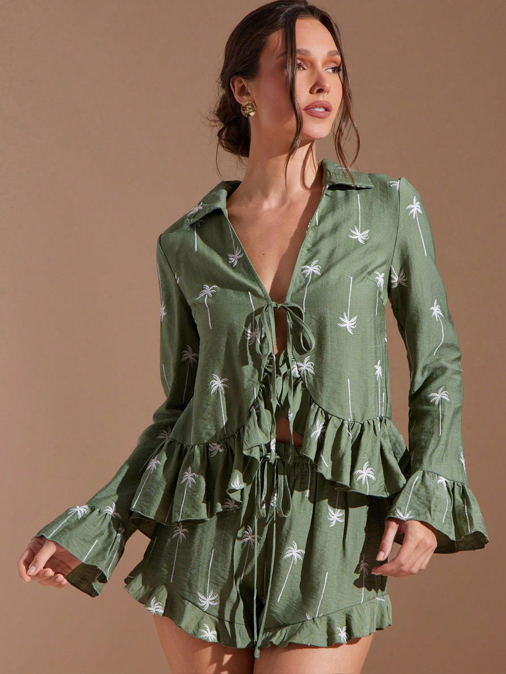 MIU Women's Embroidered Palm Tree Tie Front Flared Sleeve Ruffle Hem Green Summer Top, Summer Outfits For Women, Brunch Outfits For Women, Vacation Outfits Woman, 4th Of July Outfits Women, Vacation Outfit