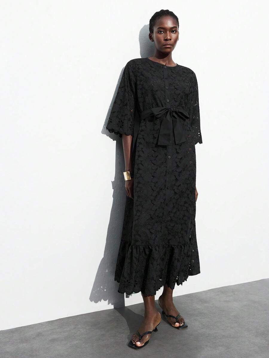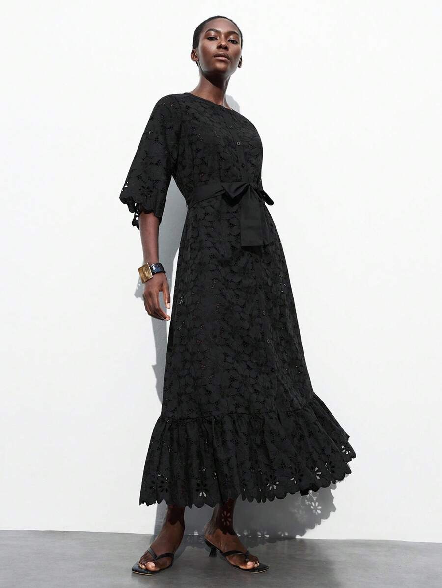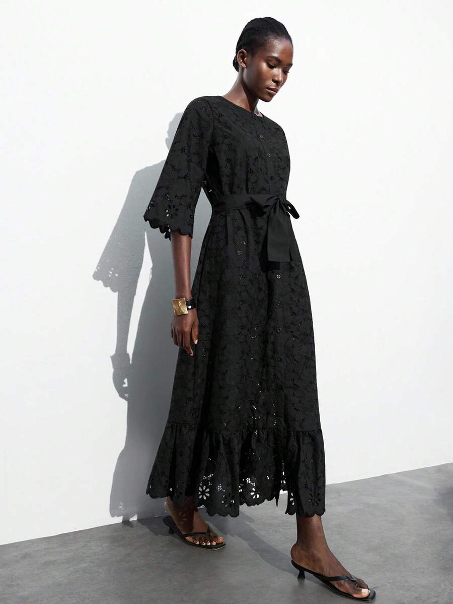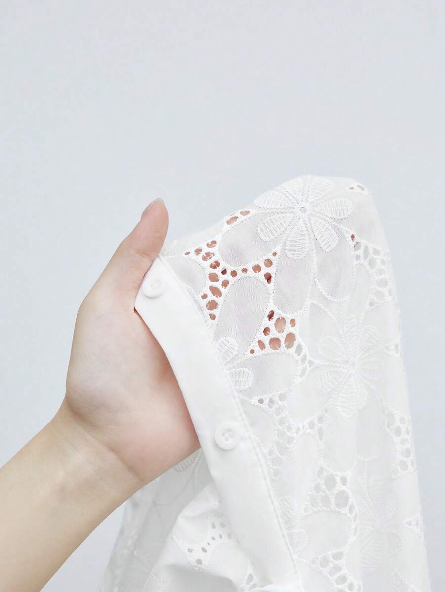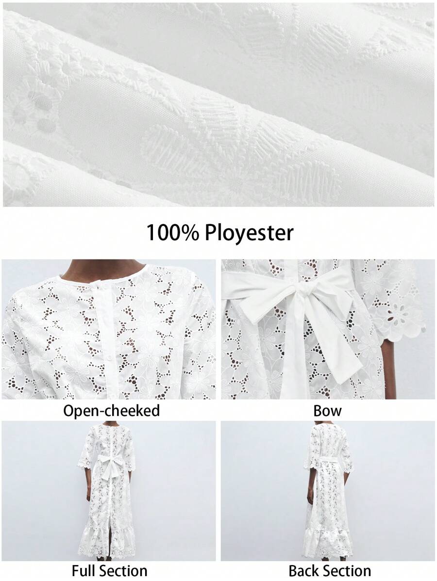 MIU Women's Embroidery Hollow Out Waist Tie Long Sleeve Dress, Loose Summer Vacation Dress, Casual Style