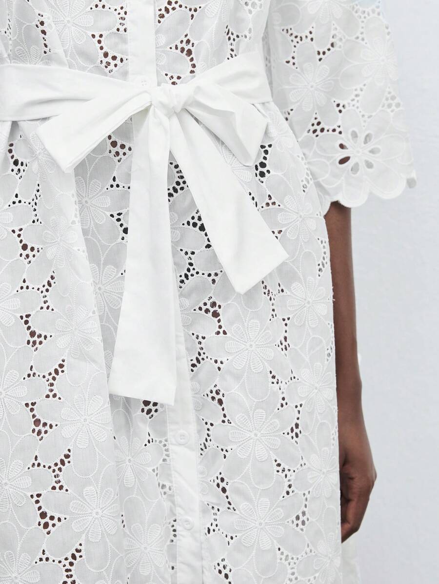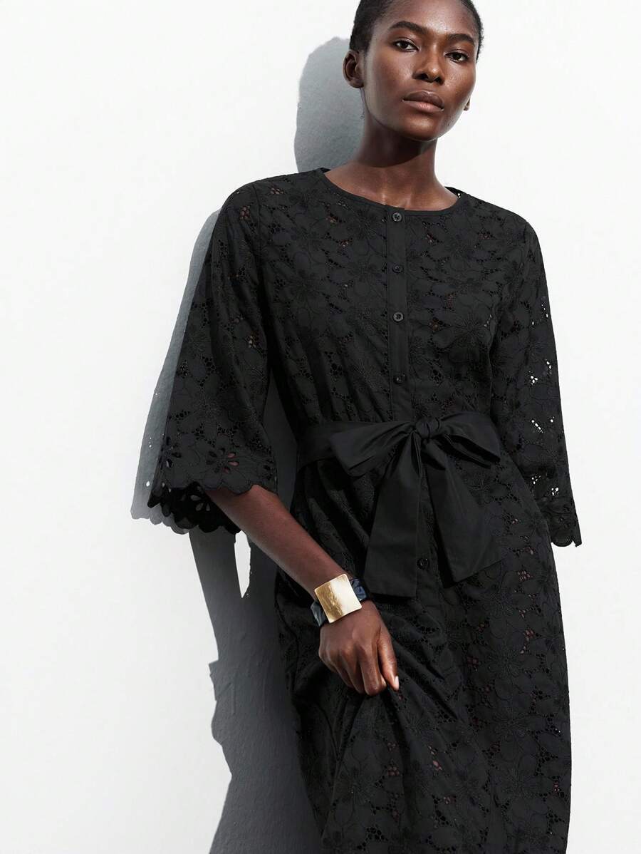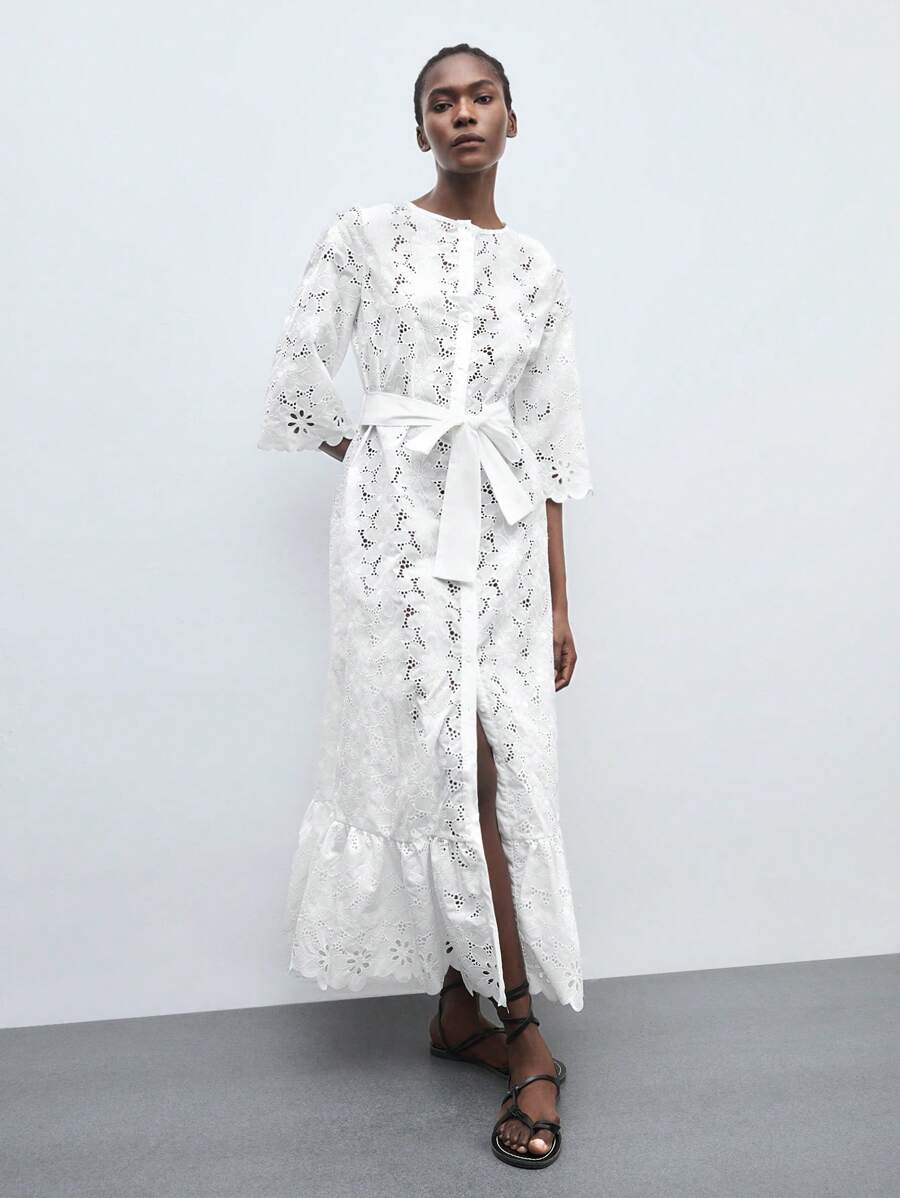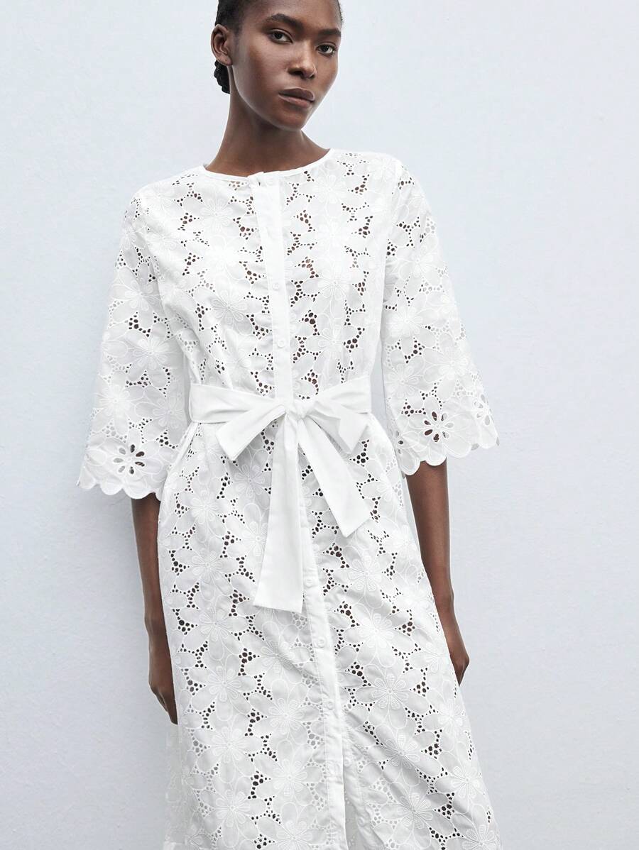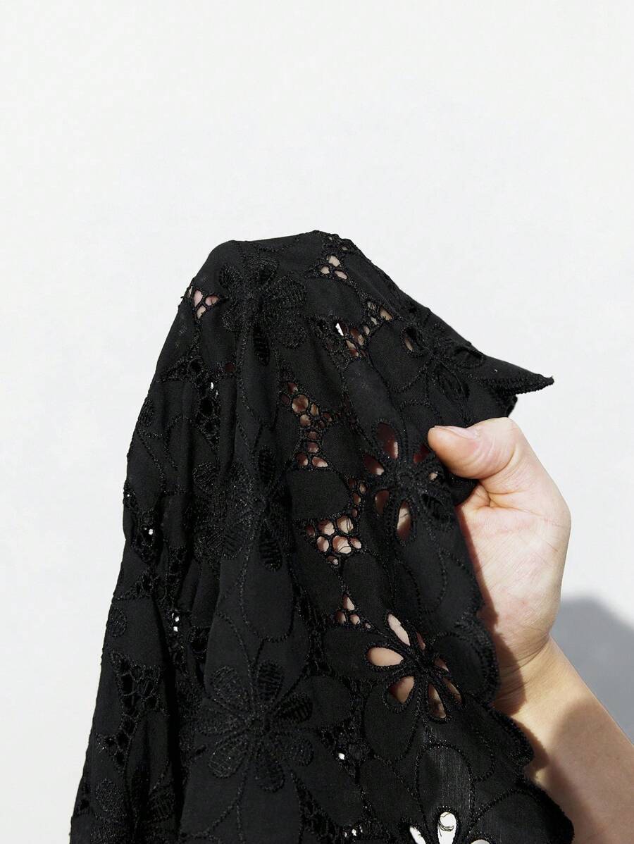 MIU Women's Embroidery Hollow Out Waist Tie Long Sleeve Dress, Loose Summer Vacation Dress, Casual Style