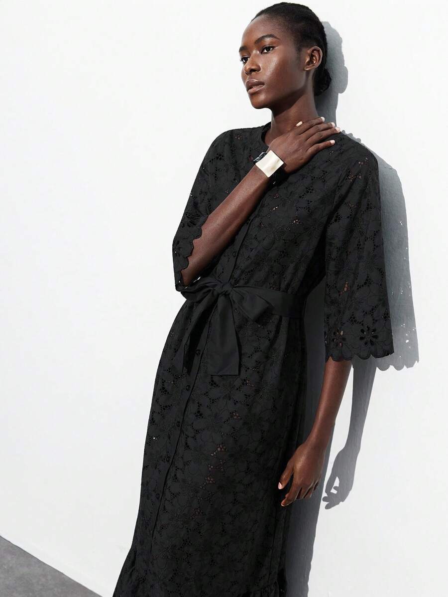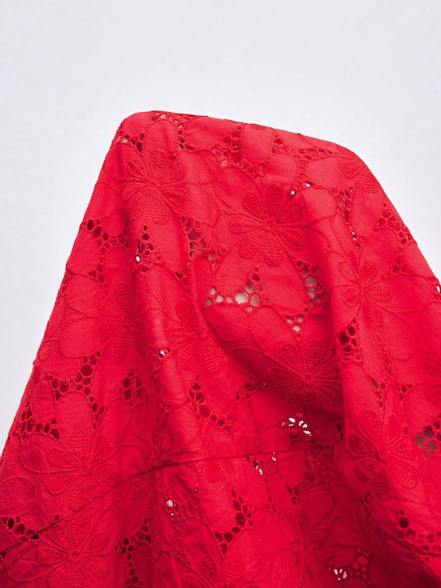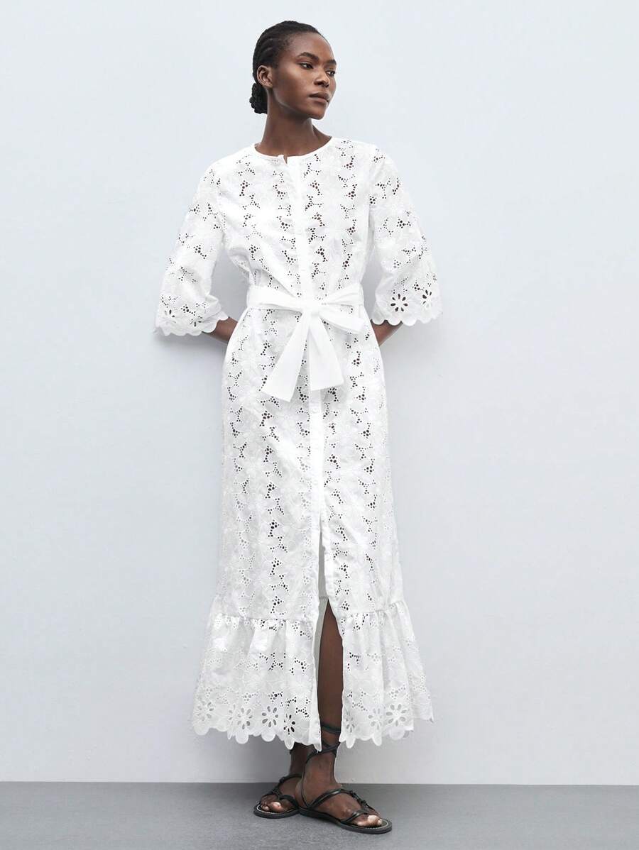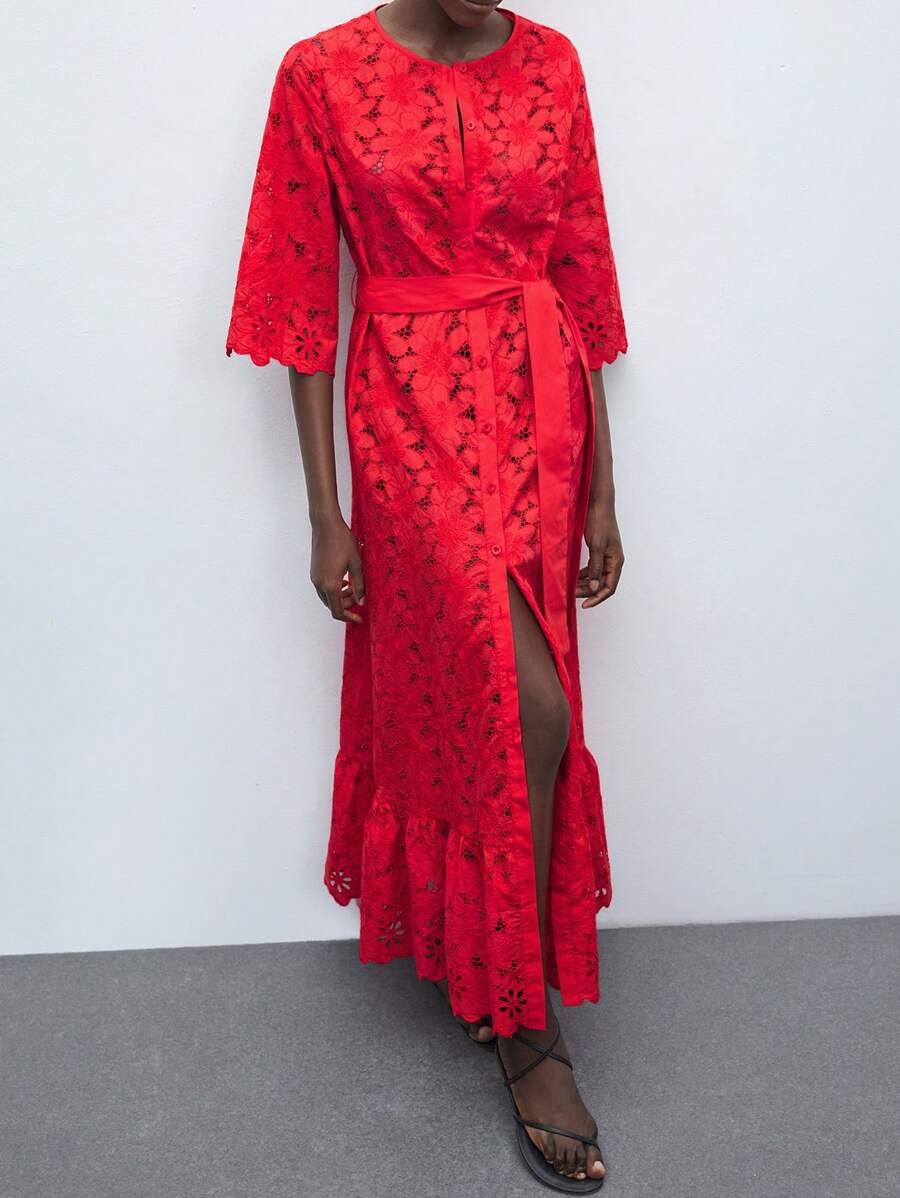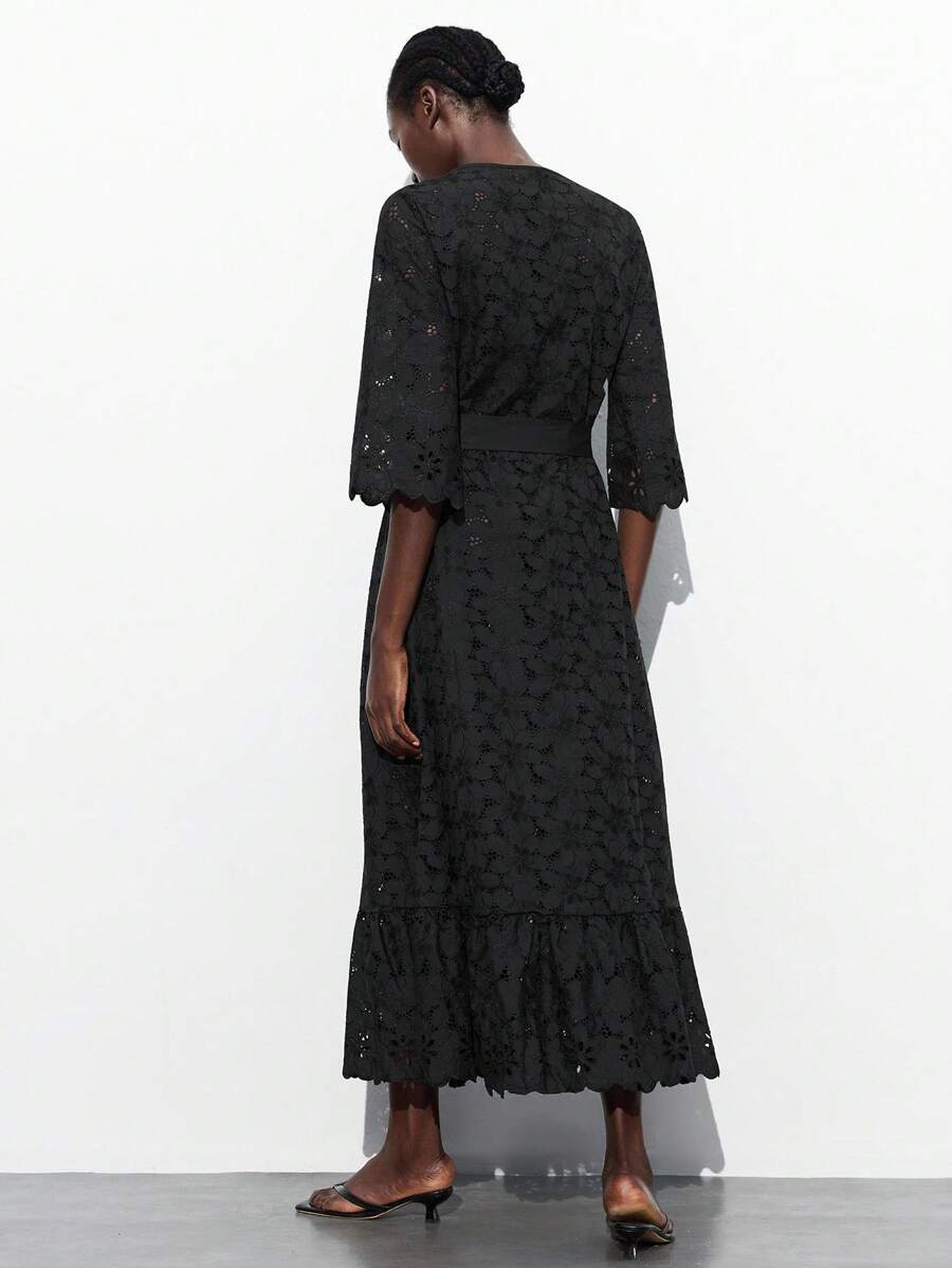 MIU Women's Embroidery Hollow Out Waist Tie Long Sleeve Dress, Loose Summer Vacation Dress, Casual Style