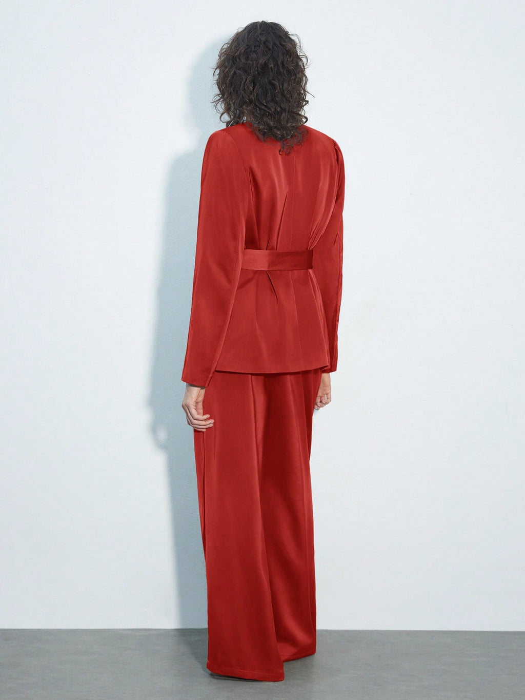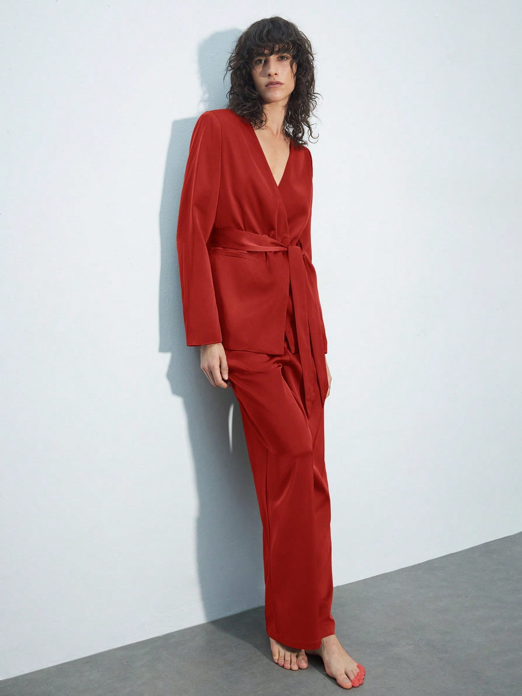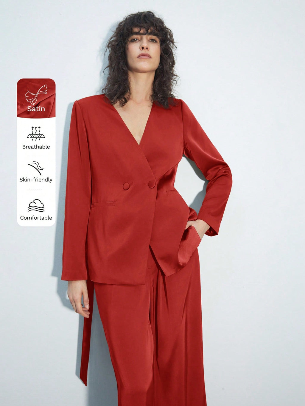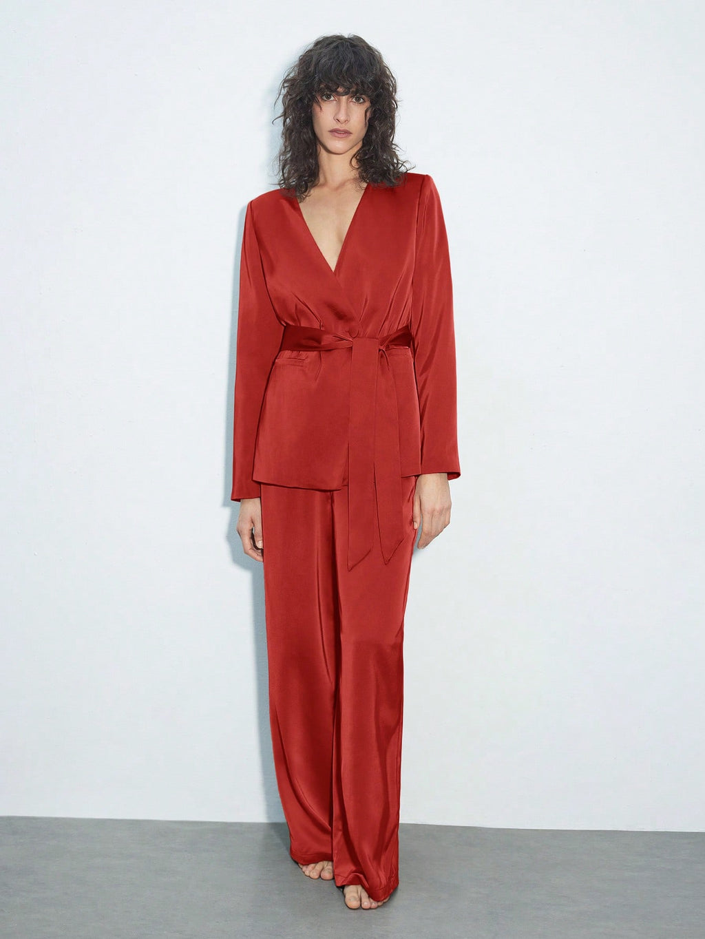 MIU Women's Fashion Versatile Green Satin V-Neck Tie-Up Jacket And Pants 2 Pieces Suit Set Valentine's Day,Festival