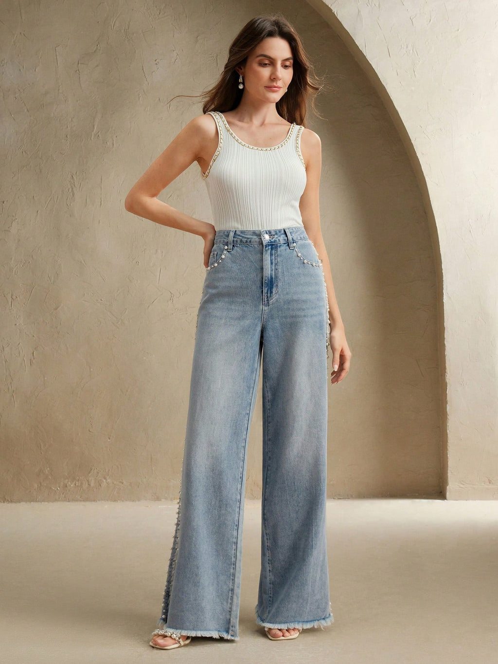 MIU Women's Fashionable Blue Denim Jeans With Pearls And Pockets, Straight Leg