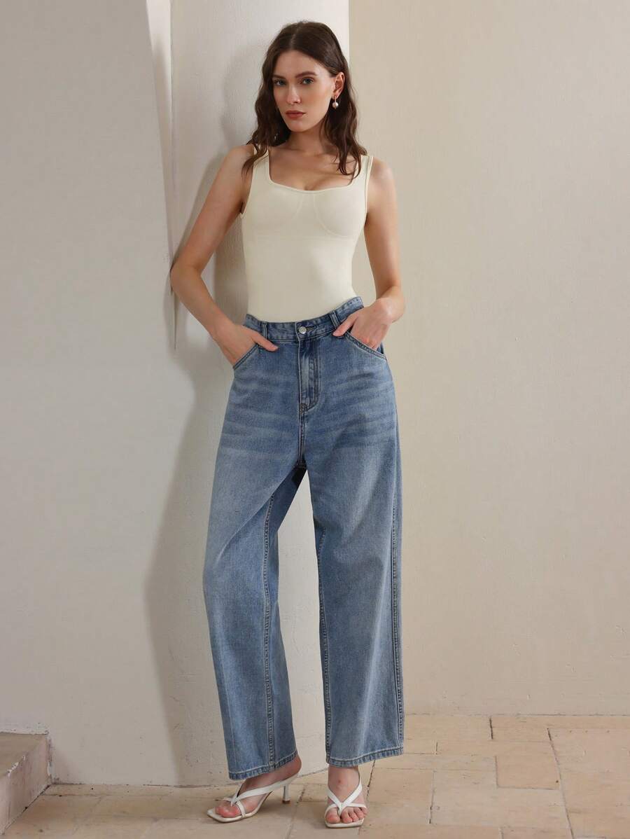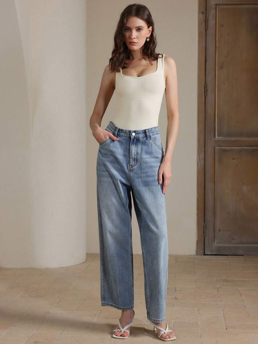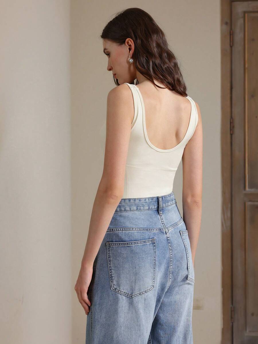 MIU Women's Fashionable Elegant Square Neck Knitted Vest, Sand-Washed T-Shirt Bodysuit, Autumn
