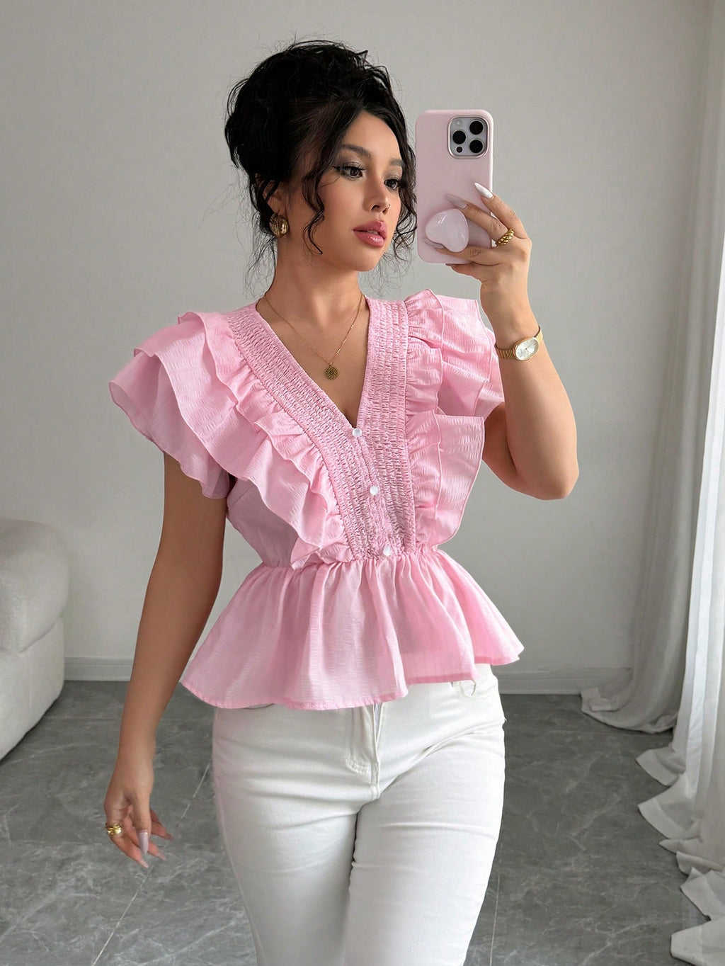 MIU Women's Fashionable Elegant V-Neck Ruffle Trim Sleeveless Textured Blouse, Spring/Summer
