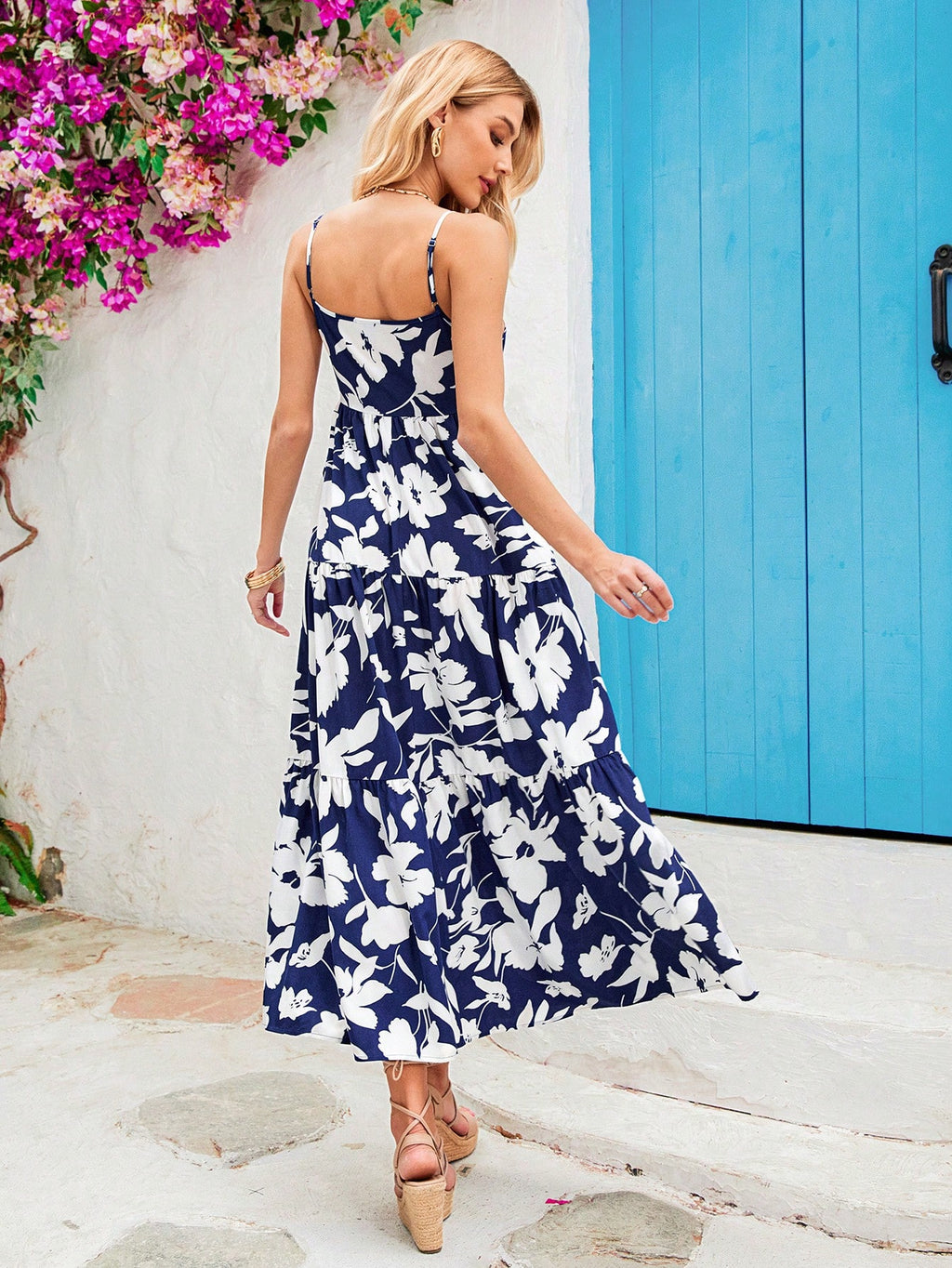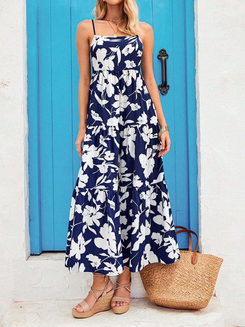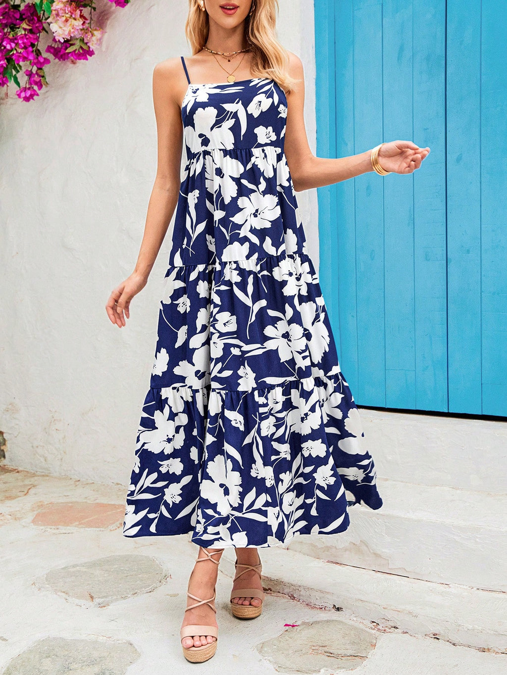 MIU Women's Fitted Long Dress With Vacation Floral Print, Spaghetti Strap,Vacation Outfits For Women