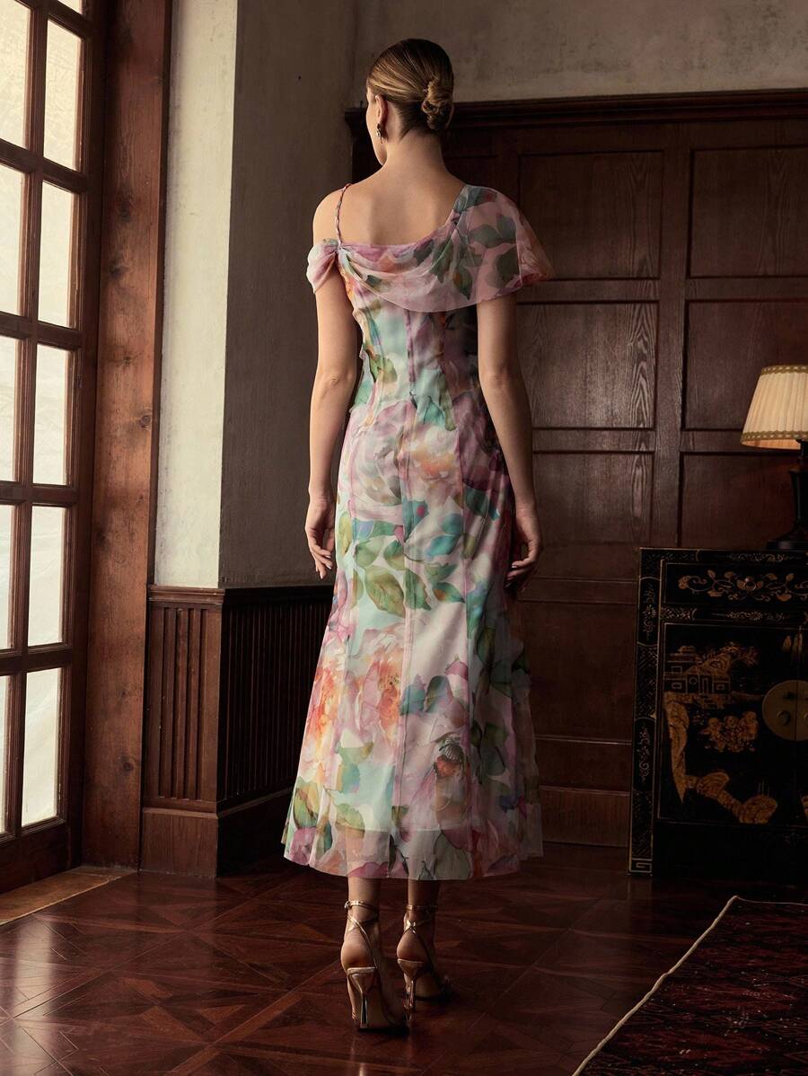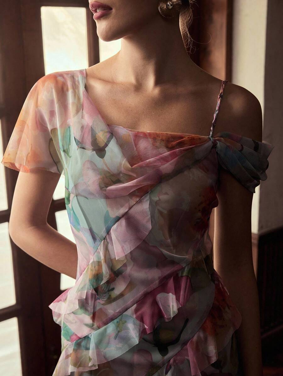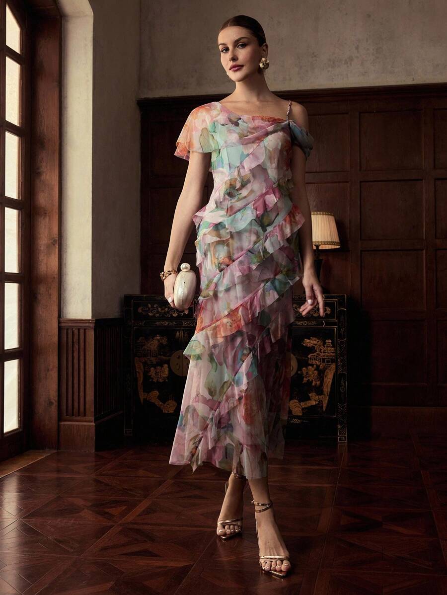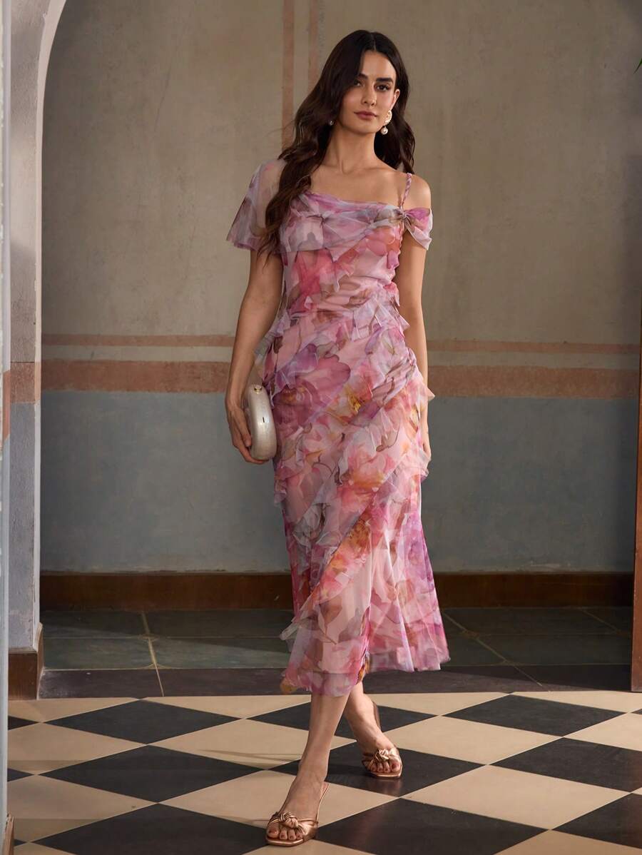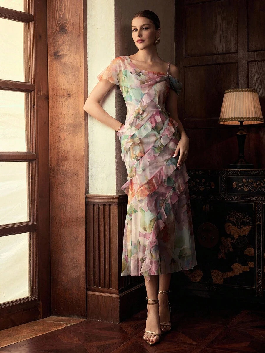 MIU Women's Floral Print Asymmetrical Shoulder Ruffle Hem Elegant Dress