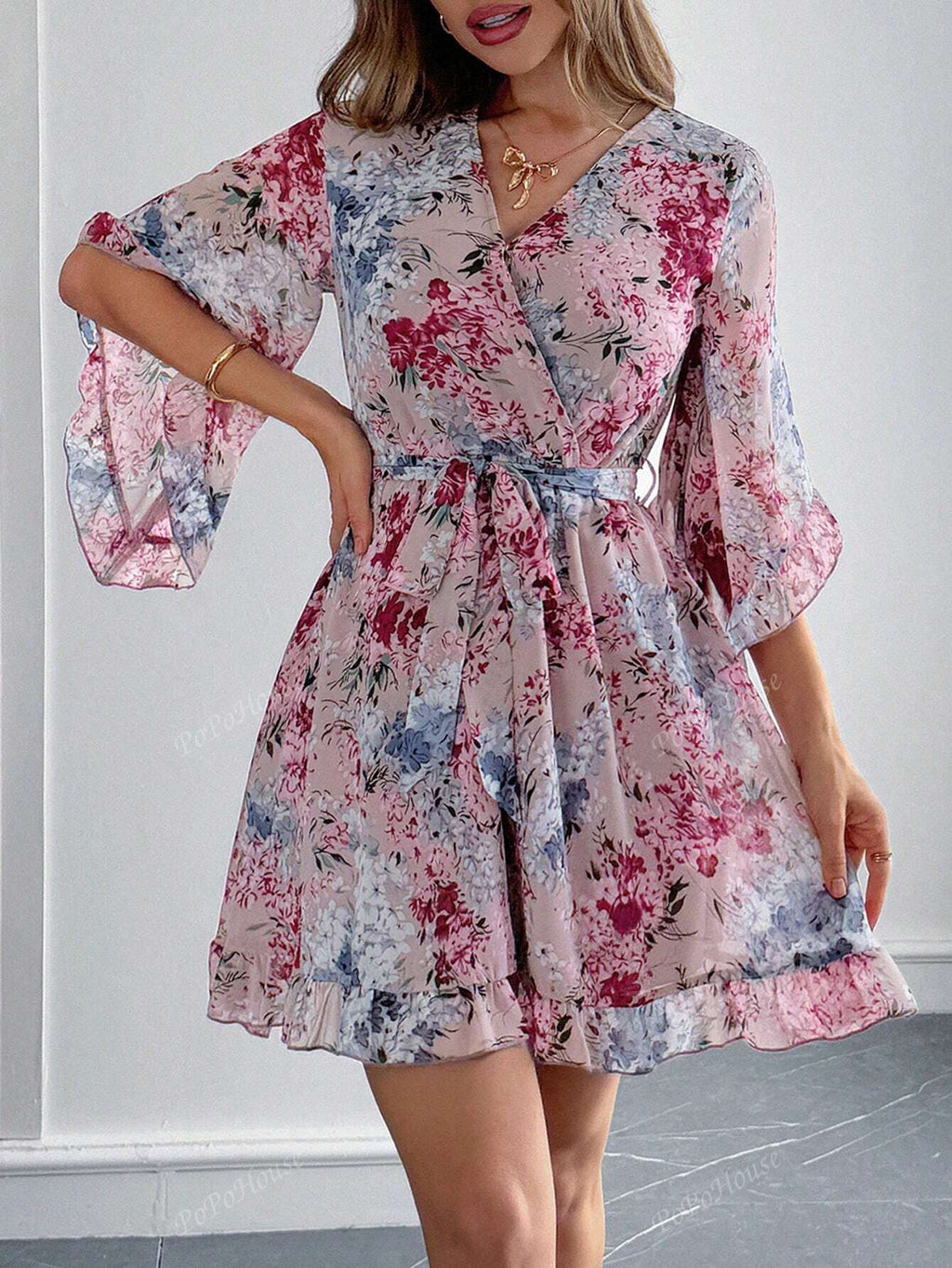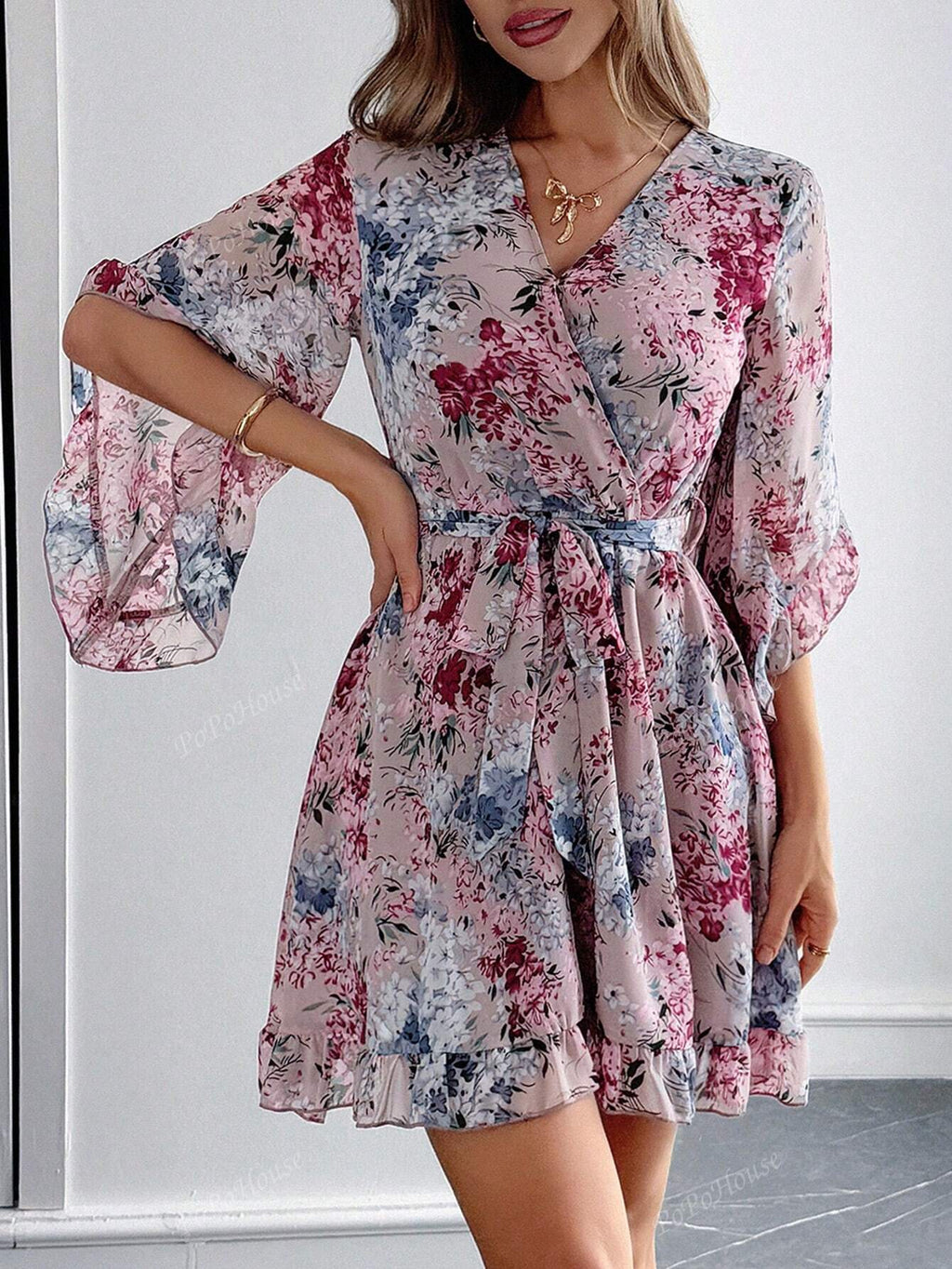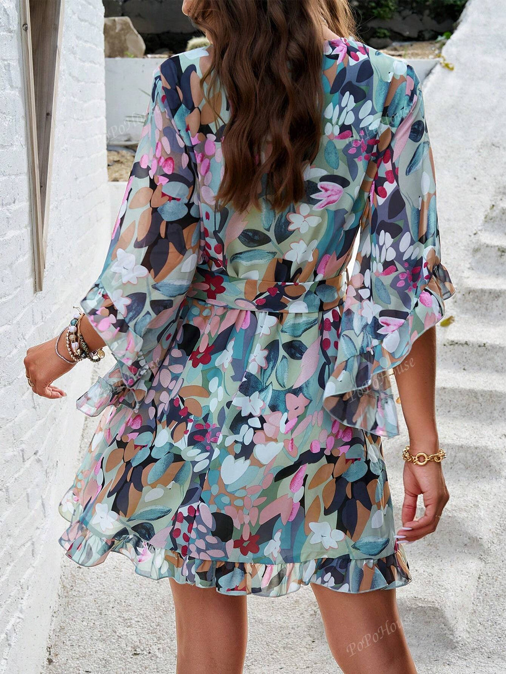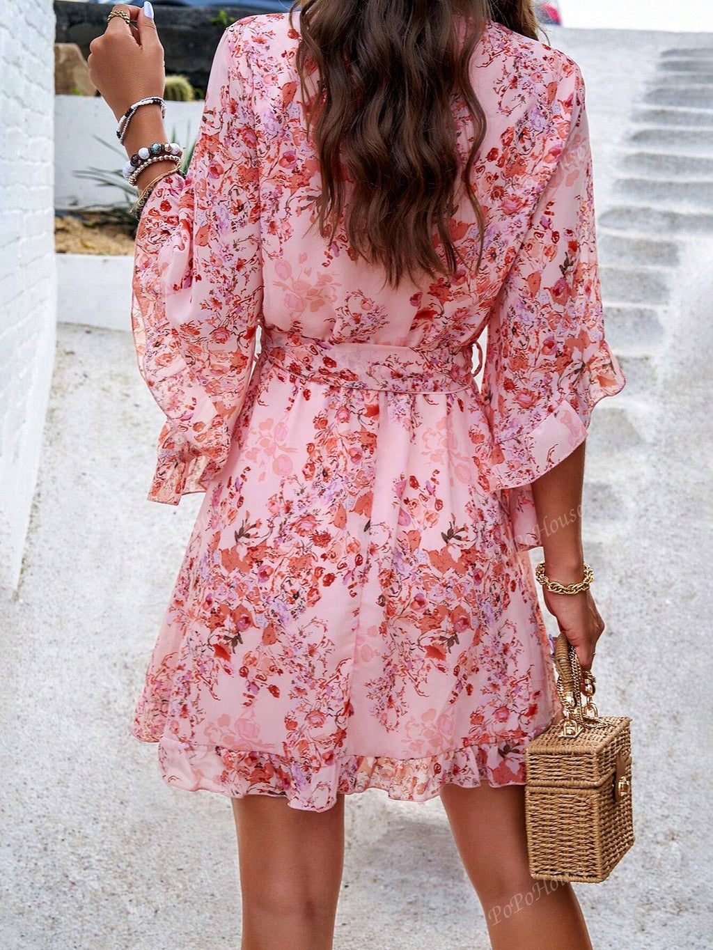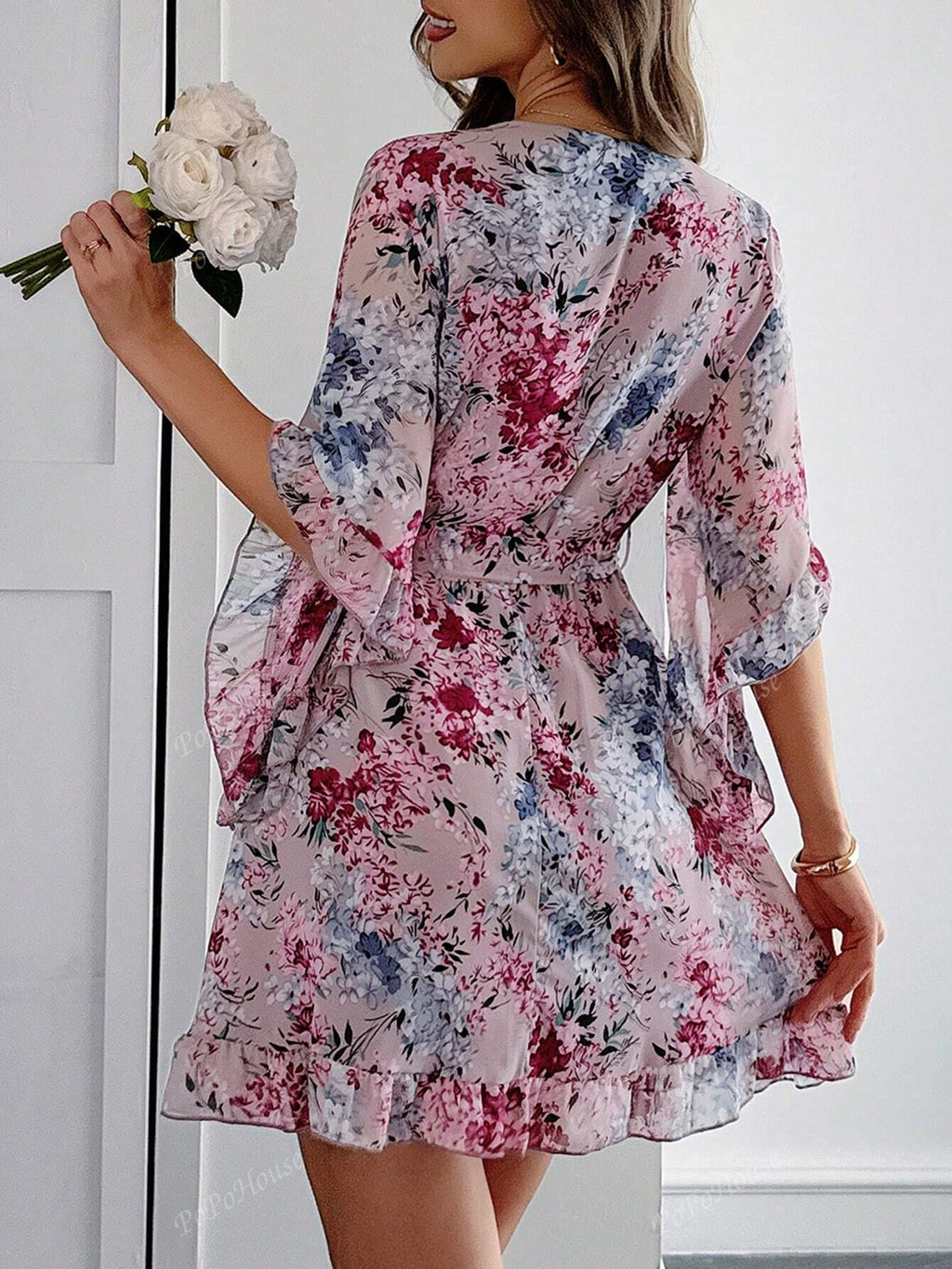 MIU Women's Floral Print Ruffled Flared Sleeve Tie-Waist Dress.