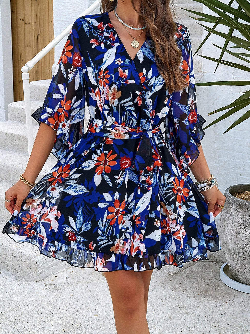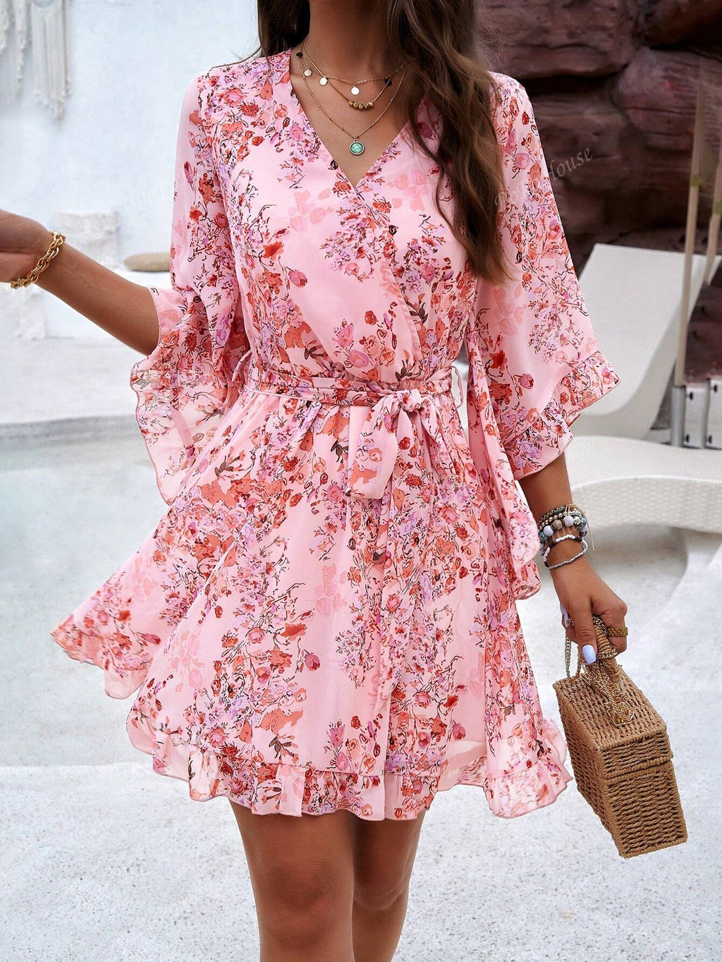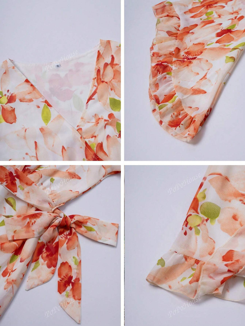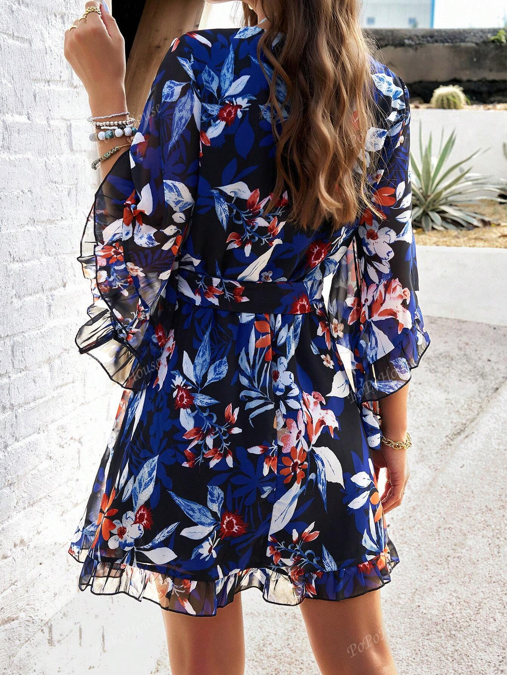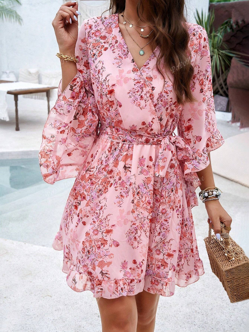 MIU Women's Floral Print Ruffled Flared Sleeve Tie-Waist Dress.
