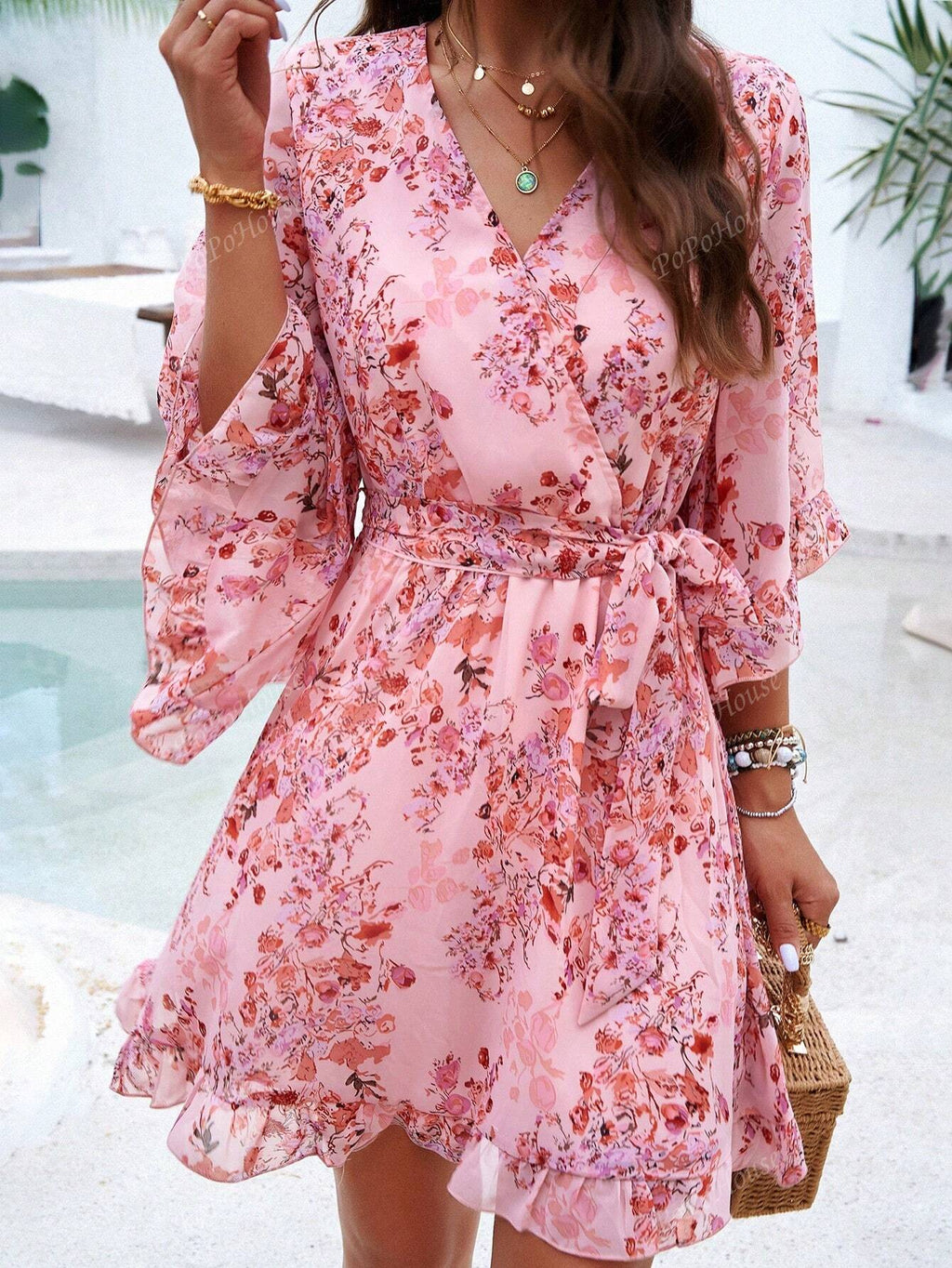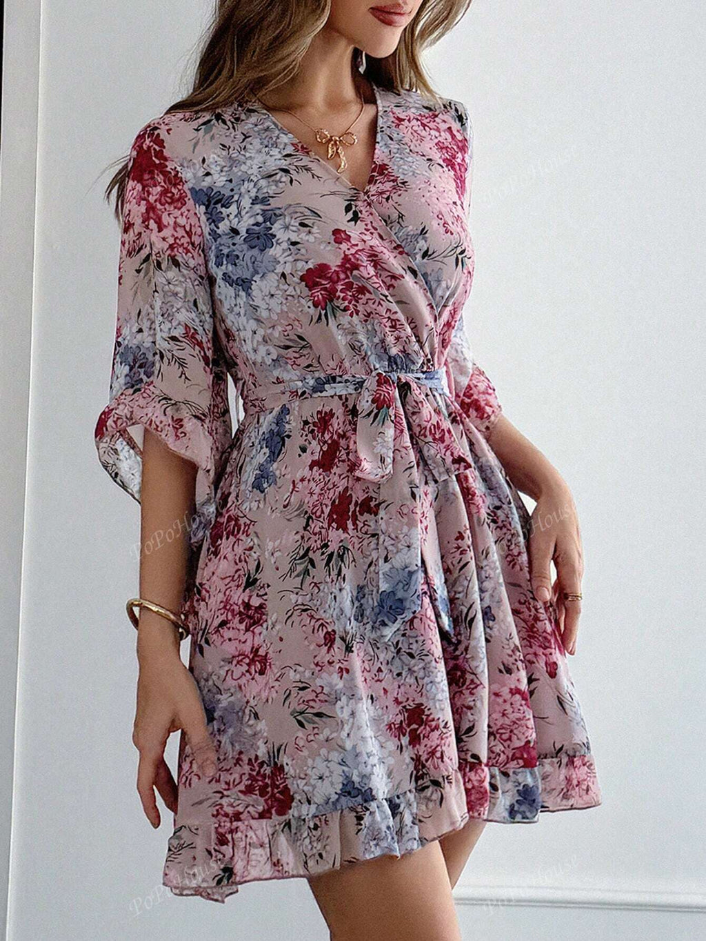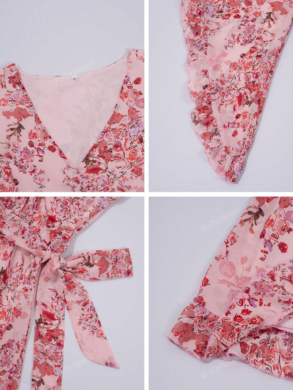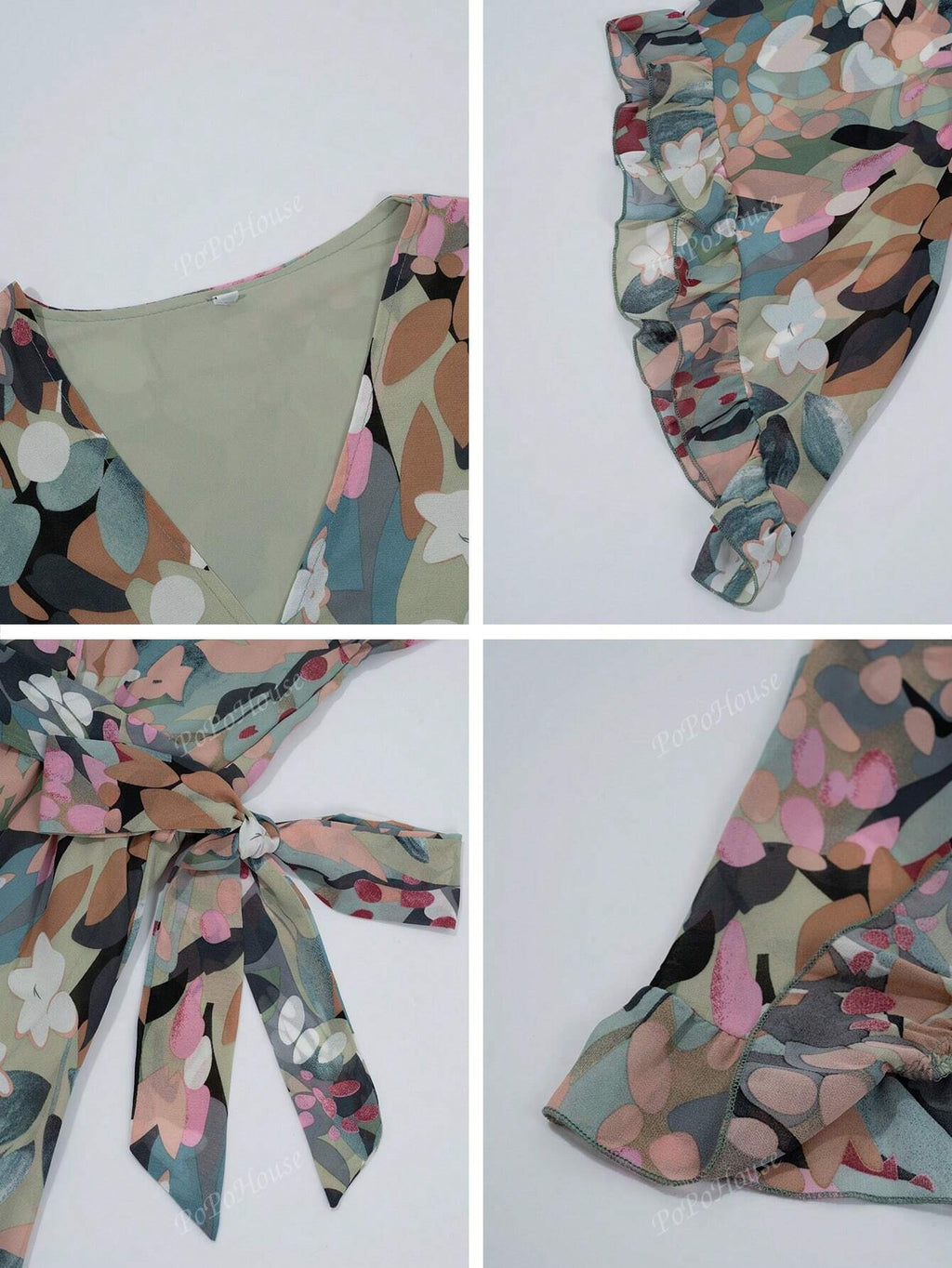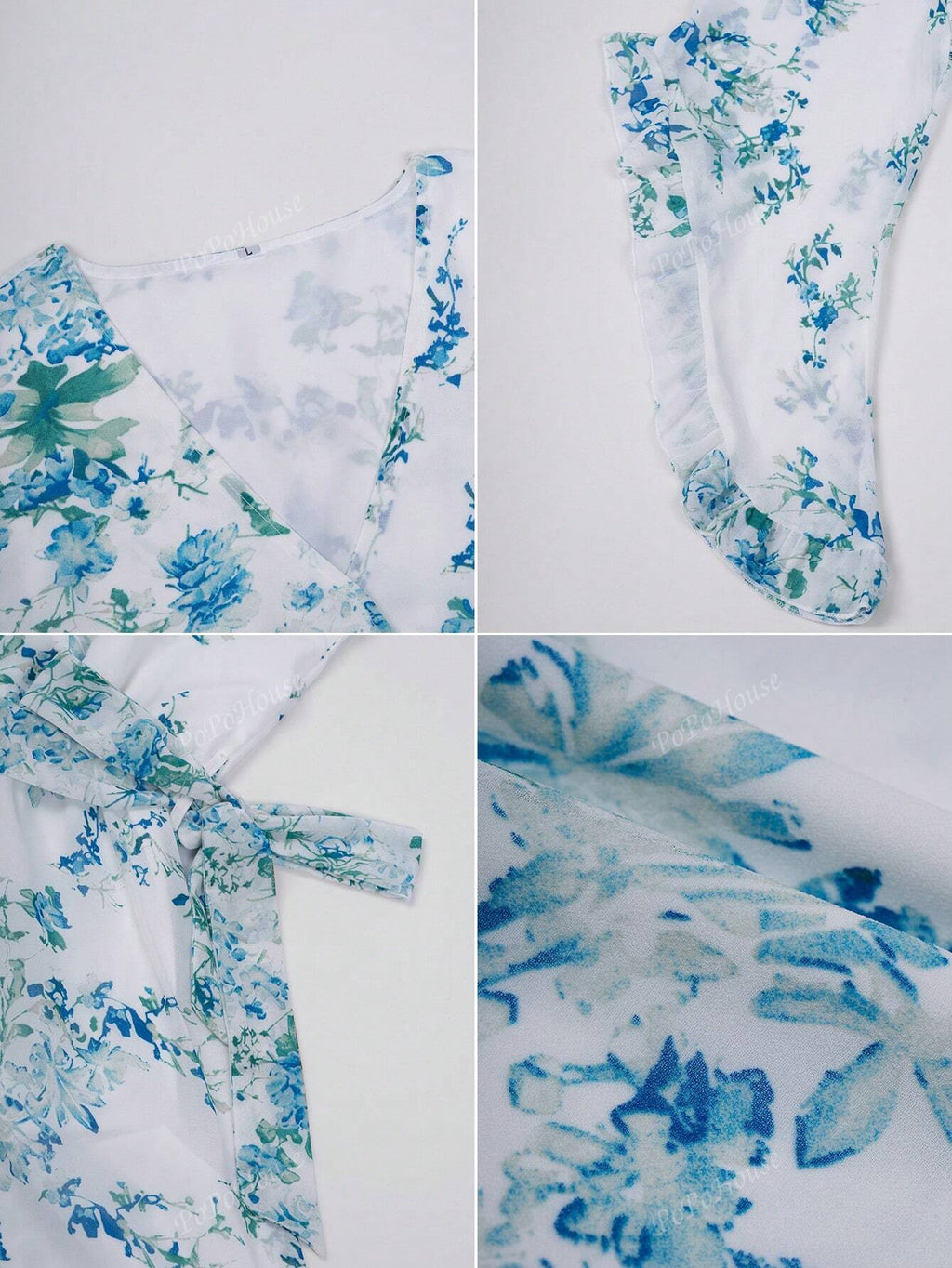 MIU Women's Floral Print Ruffled Flared Sleeve Tie-Waist Dress.