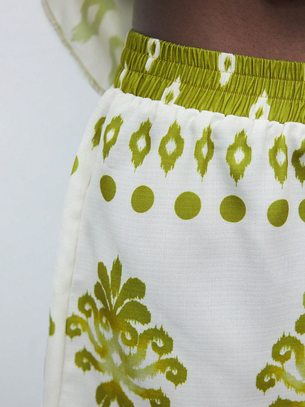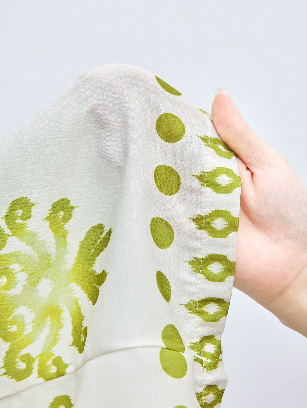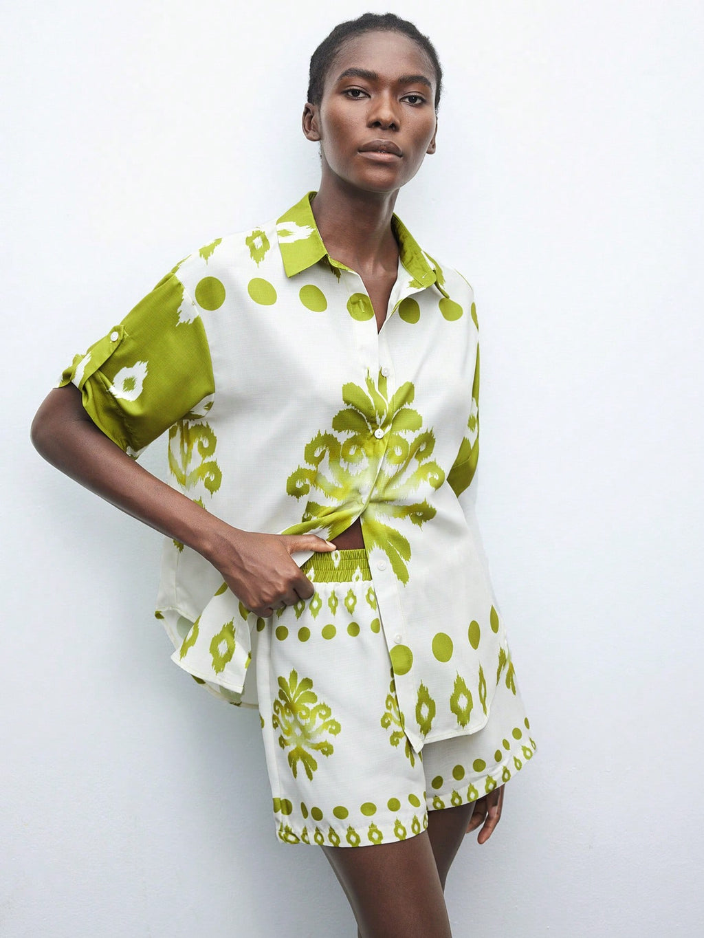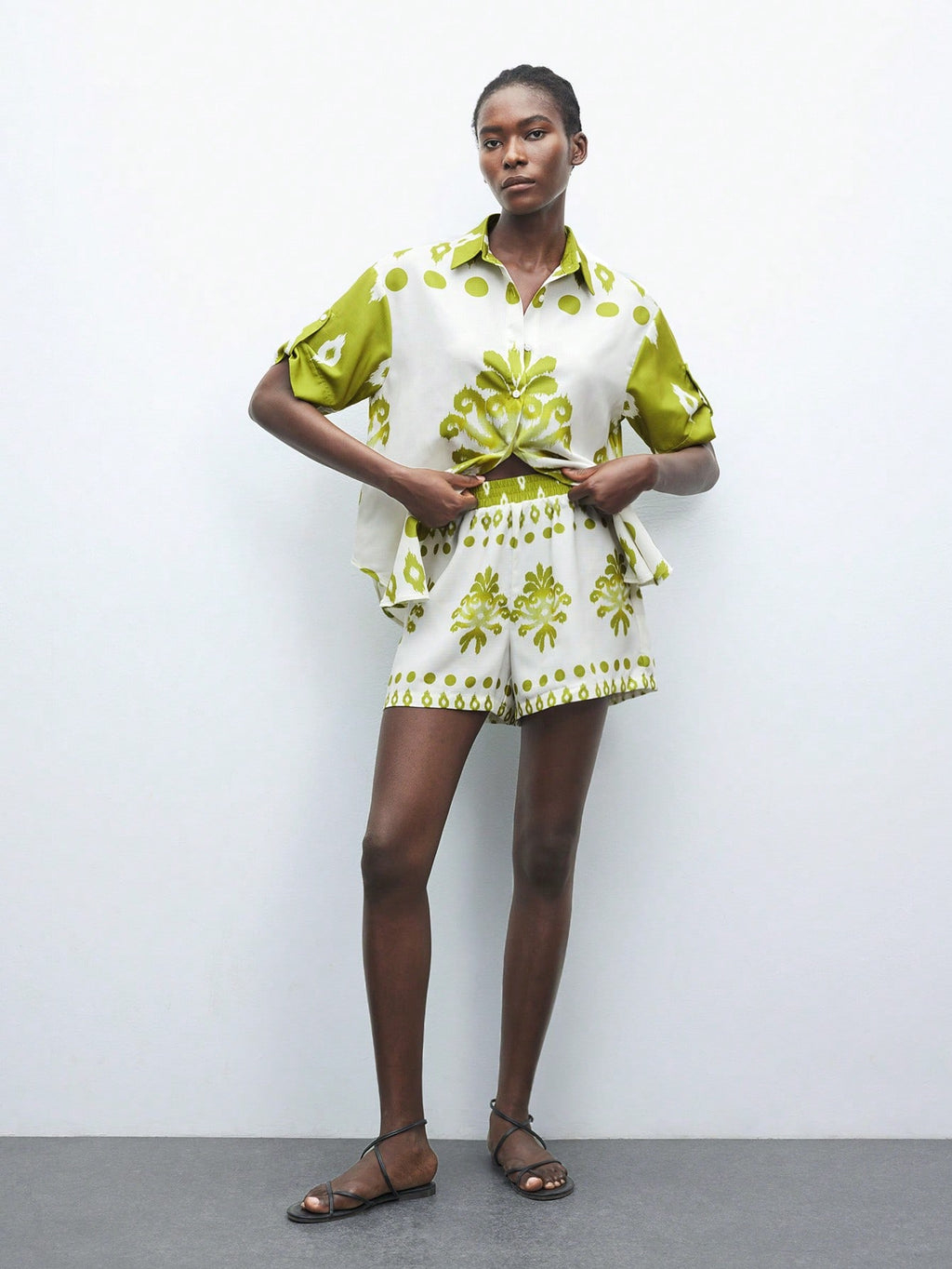 MIU Women's Green Summer Outfit, Front Button Short Sleeve Loose Blouse Top With Elastic Waist Contrast Print Shorts, Casual/Vacation Women S Summer Shorts Beach Shorts For Women