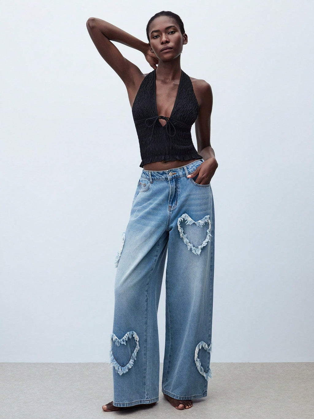 MIU Women's Heart Shaped Blue Jeans Low Rise Straight Leg Wide Leg Pants For Summer Y2K Casual Wear