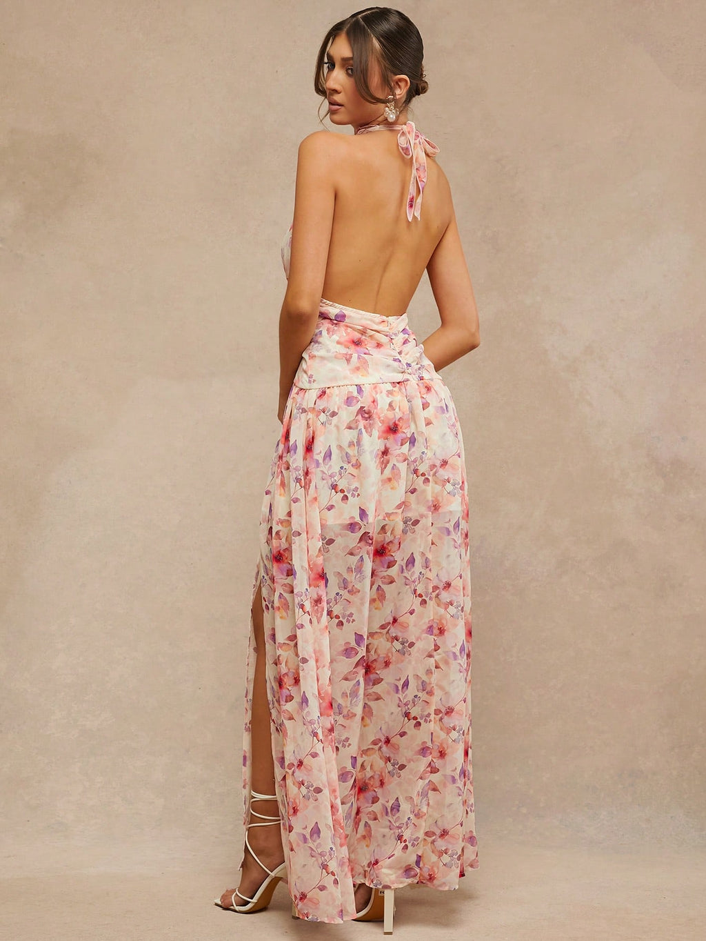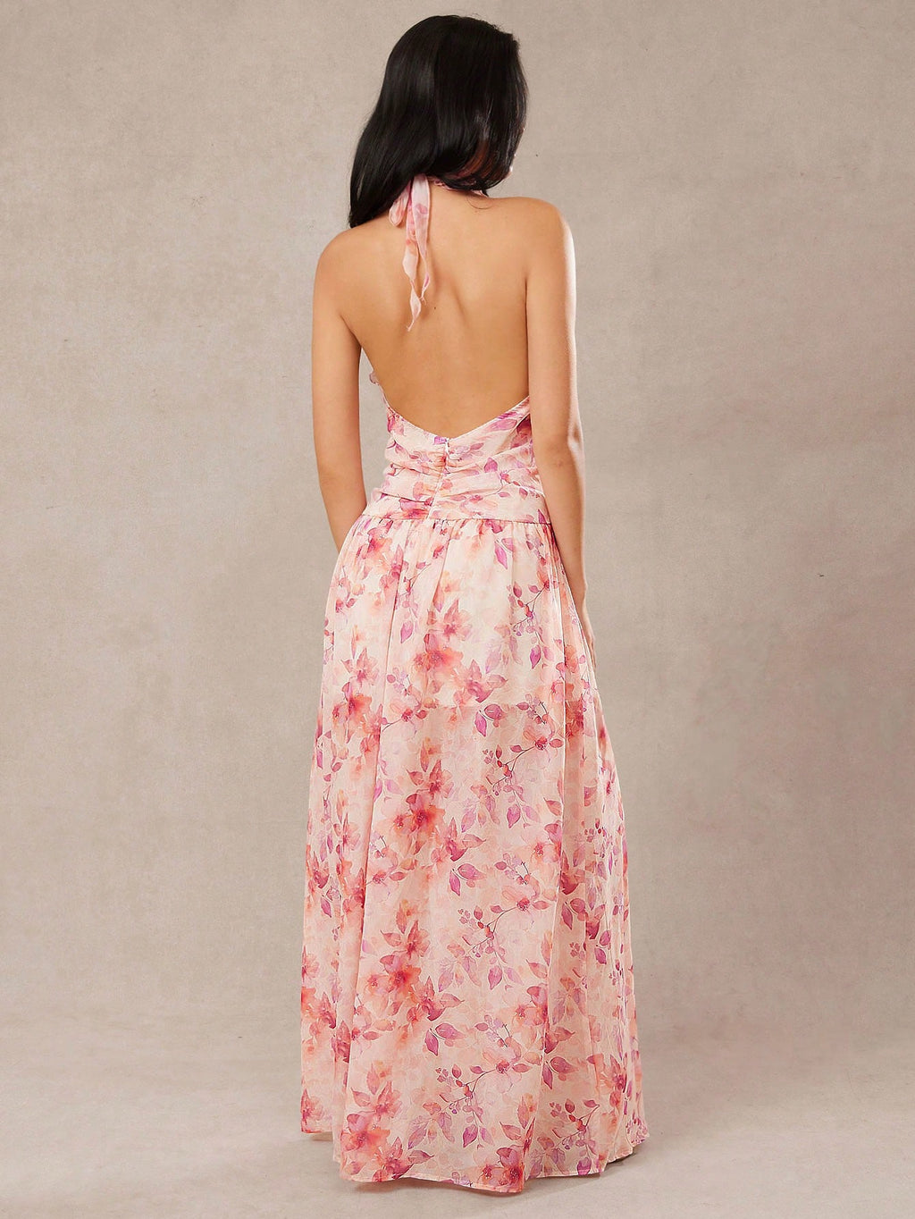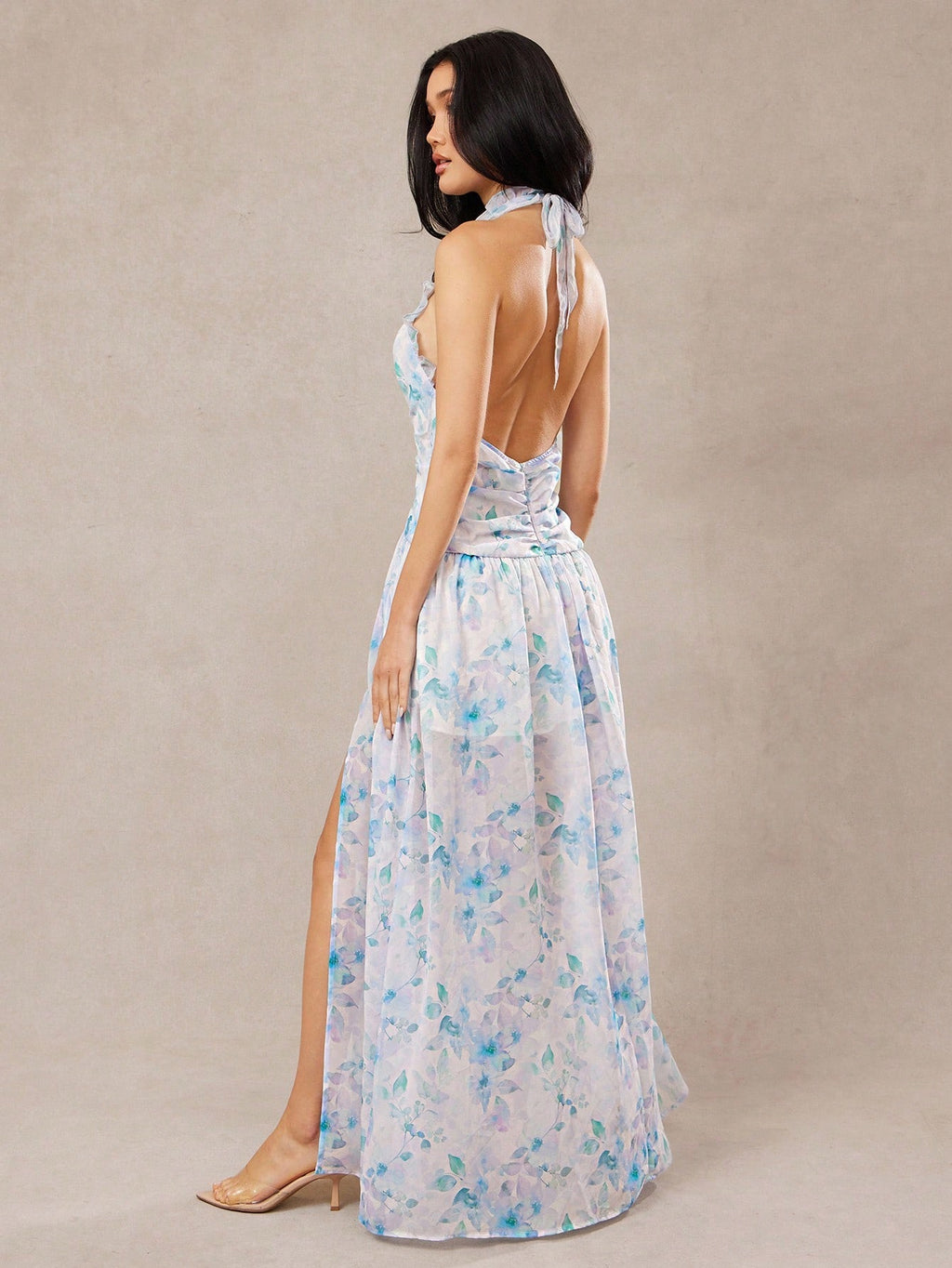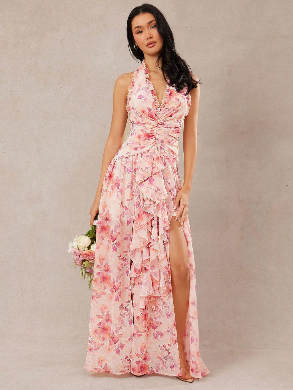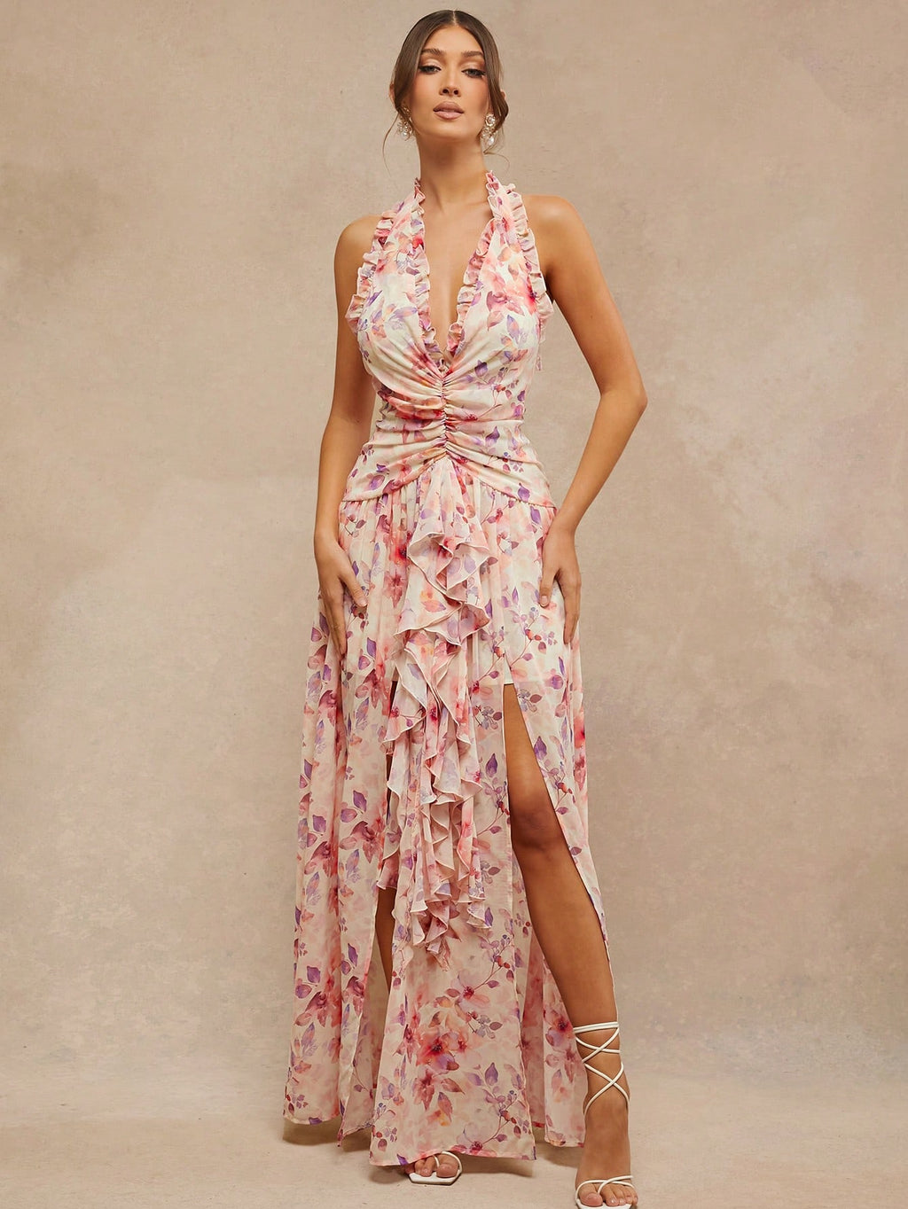 MIU Women's Holiday Floral Print Ruffle Hem Sleeveless Side Split Neck Dress