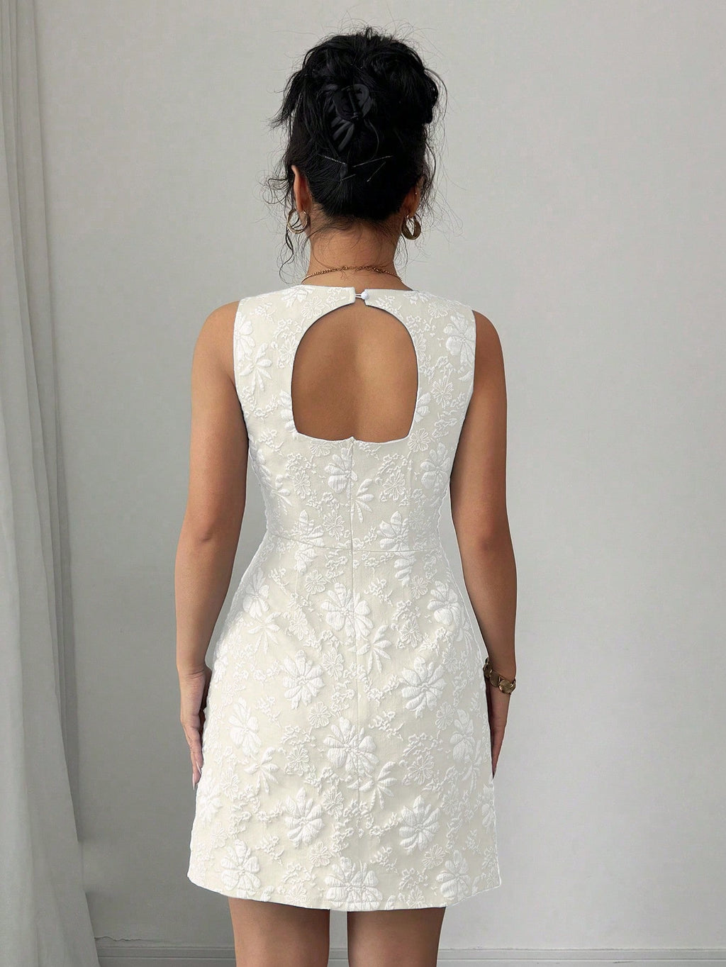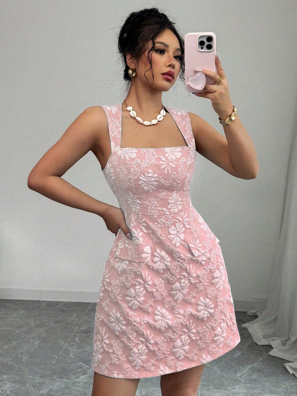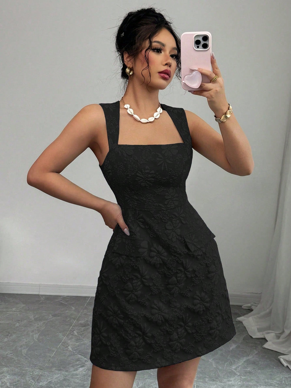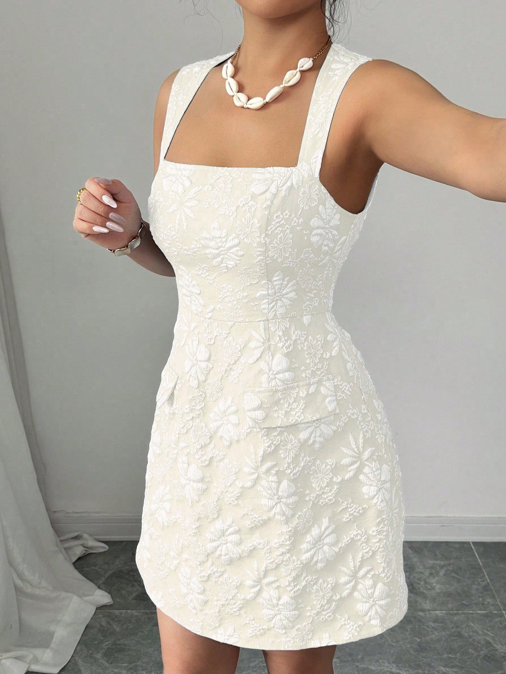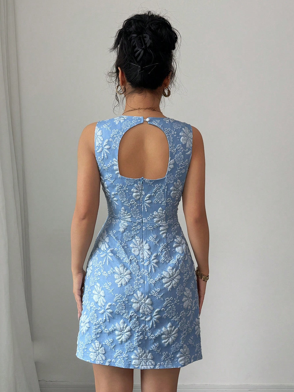 MIU Women's Jacquard Off-Shoulder Sleeveless Fake Pocket Mini Dress, Blue