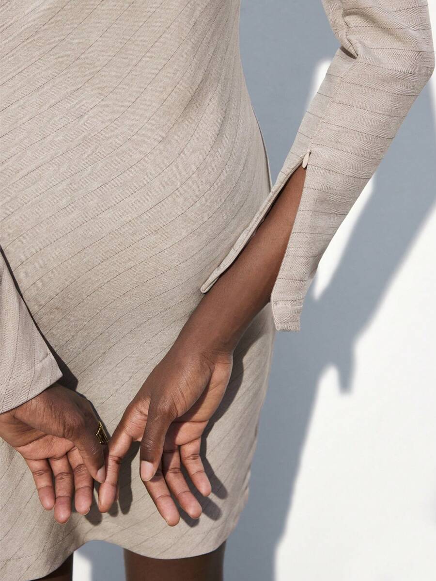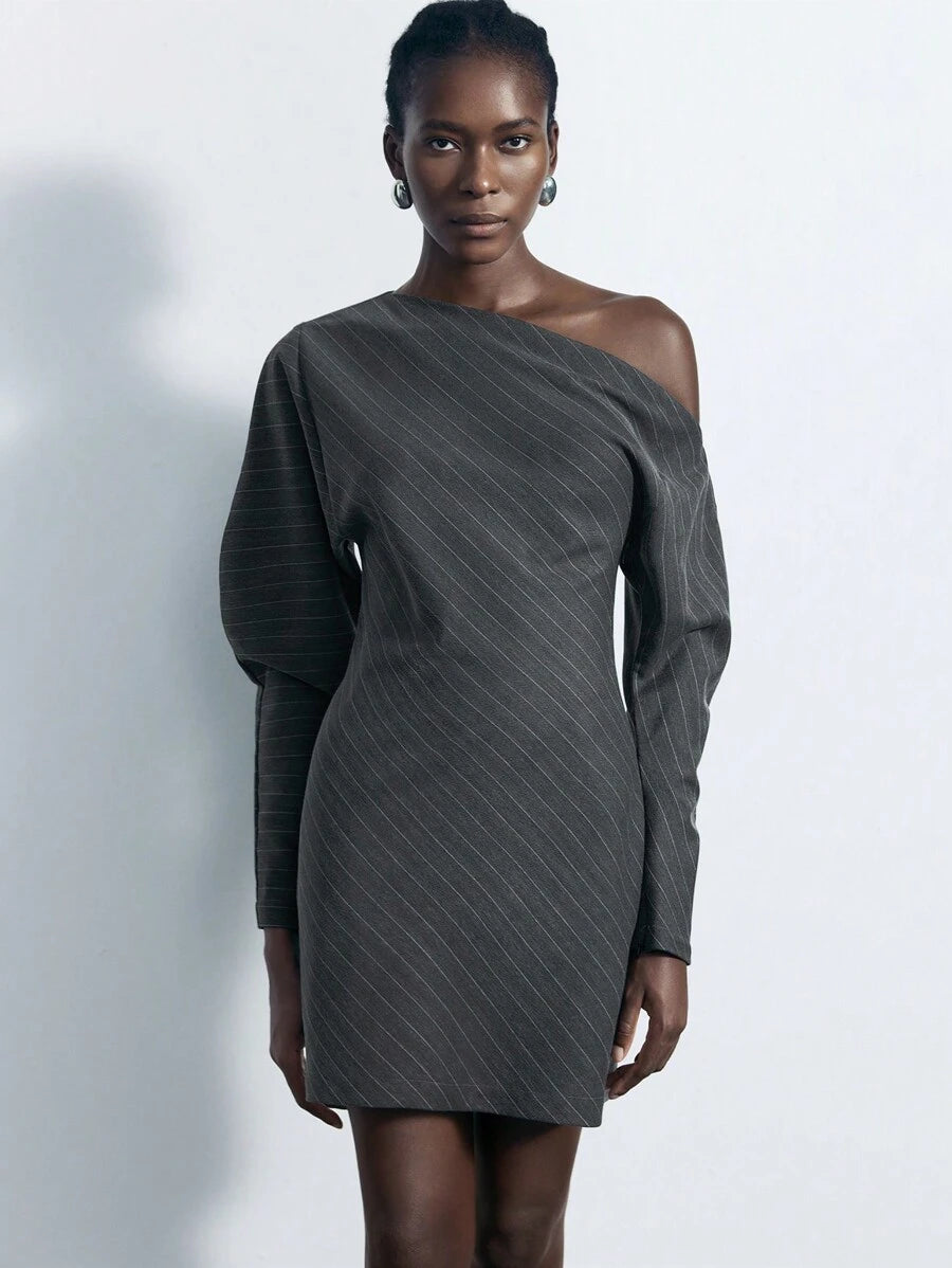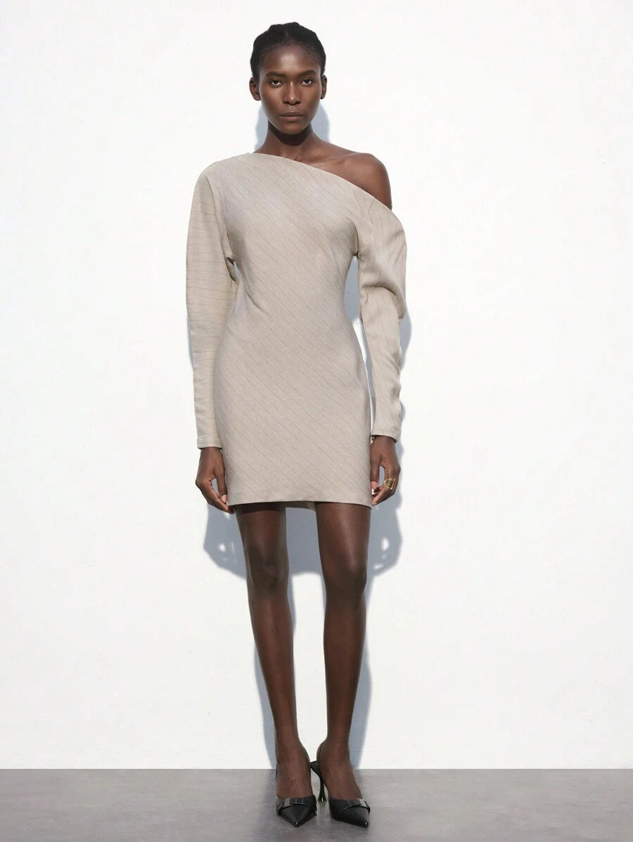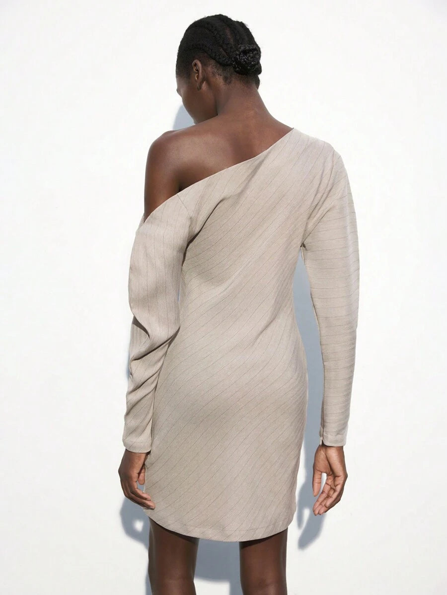 MIU Women's Khaki Modern Elegant Asymmetric Single Sleeve Layerable Short Dress, Versatile For All Seasons