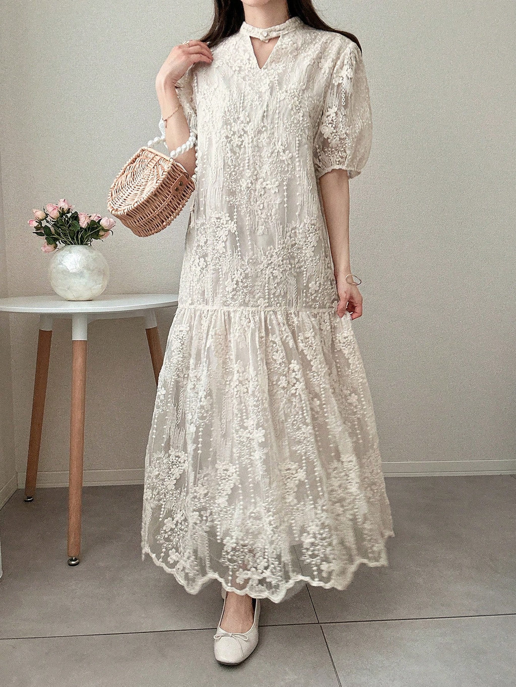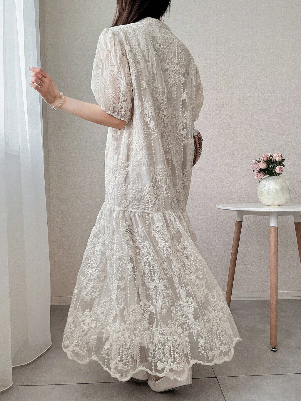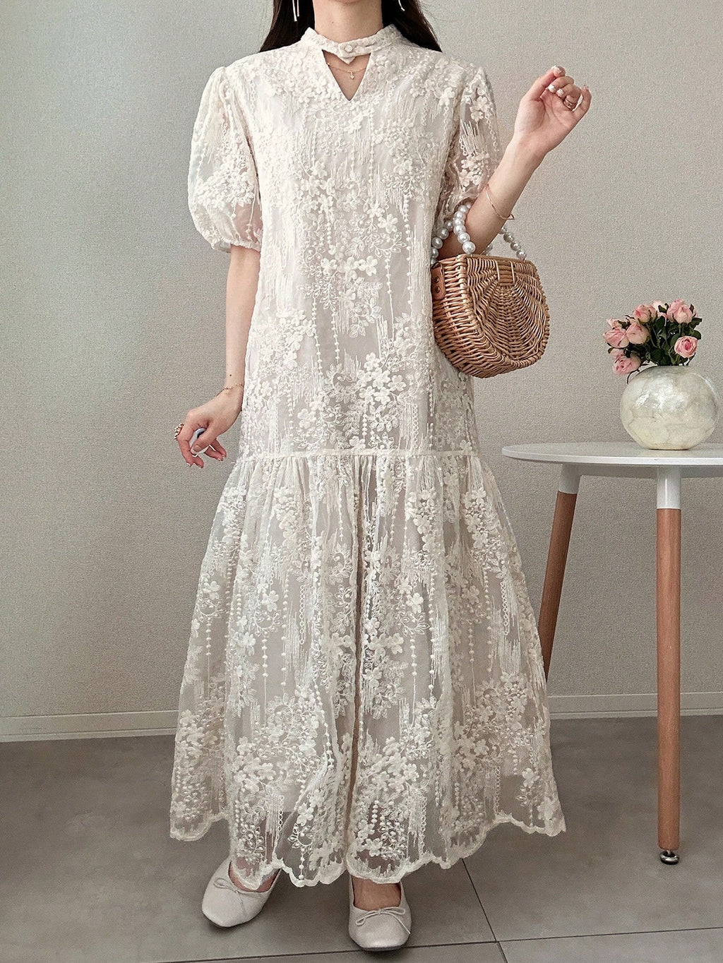 MIU Women's Lace Puff Sleeve Mid-Thigh Hollow Sweet Ruffle Hem Solid Color Short Sleeve Summer Dress Women Dresses Birthday Women Casual Dress Woman S Summer Clothes Women Birthday Outfit Women S Clothes