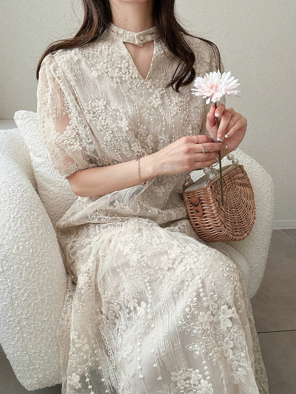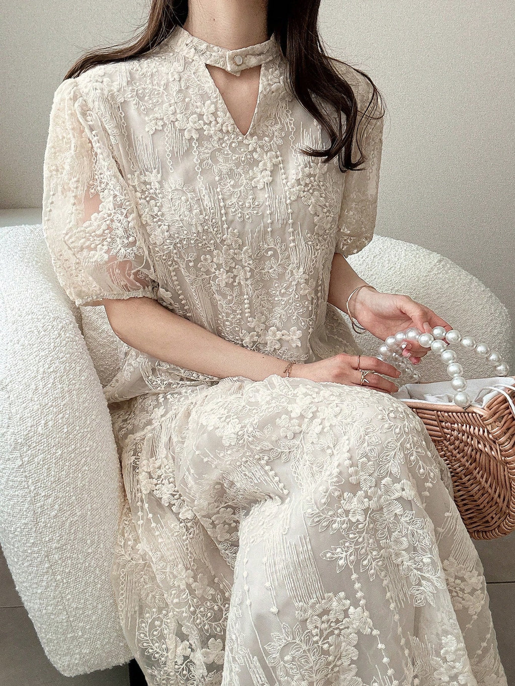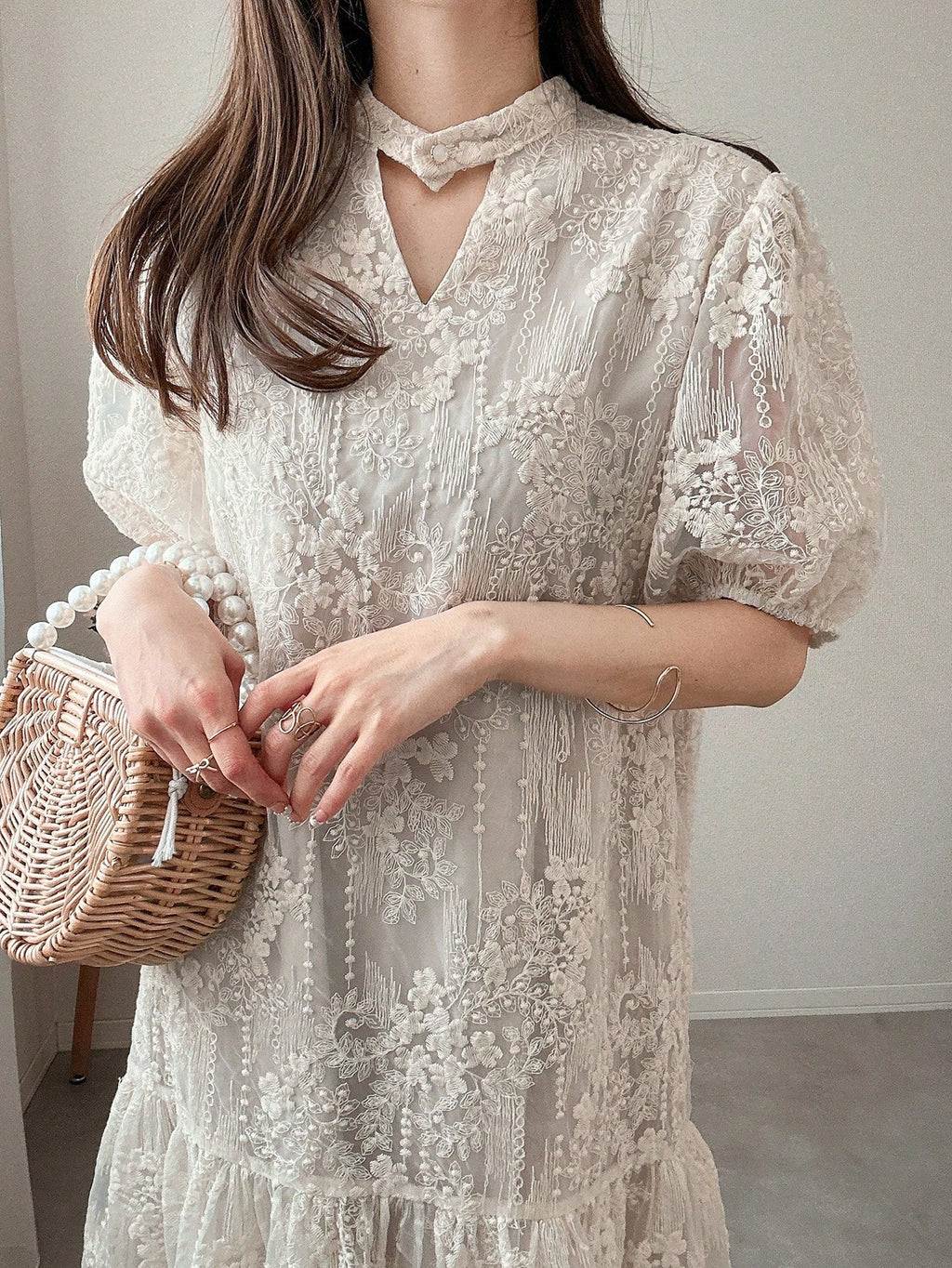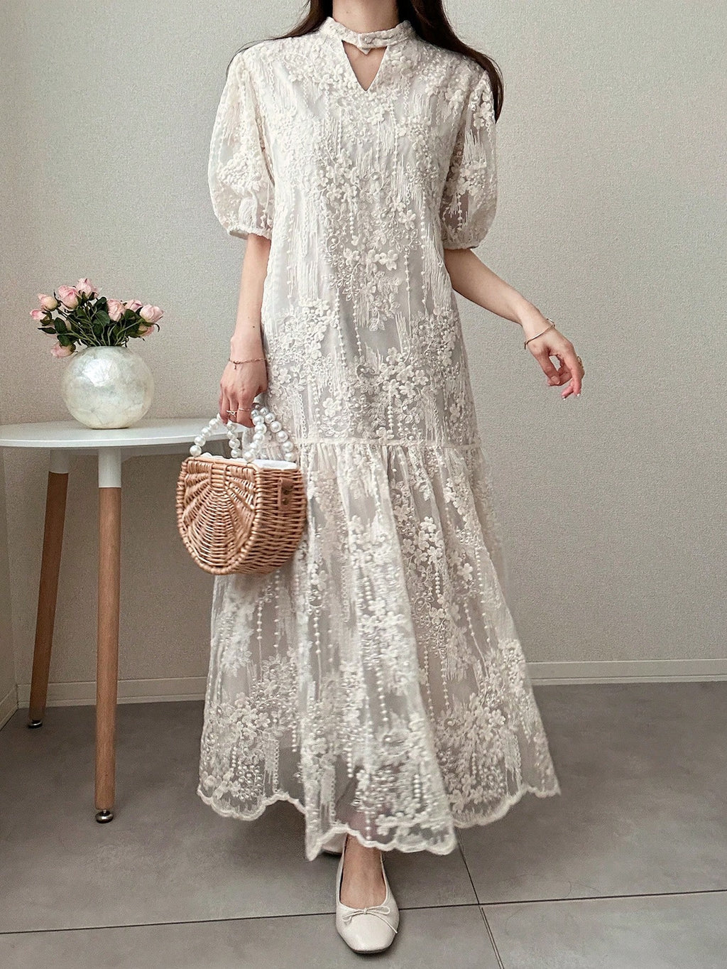 MIU Women's Lace Puff Sleeve Mid-Thigh Hollow Sweet Ruffle Hem Solid Color Short Sleeve Summer Dress Women Dresses Birthday Women Casual Dress Woman S Summer Clothes Women Birthday Outfit Women S Clothes
