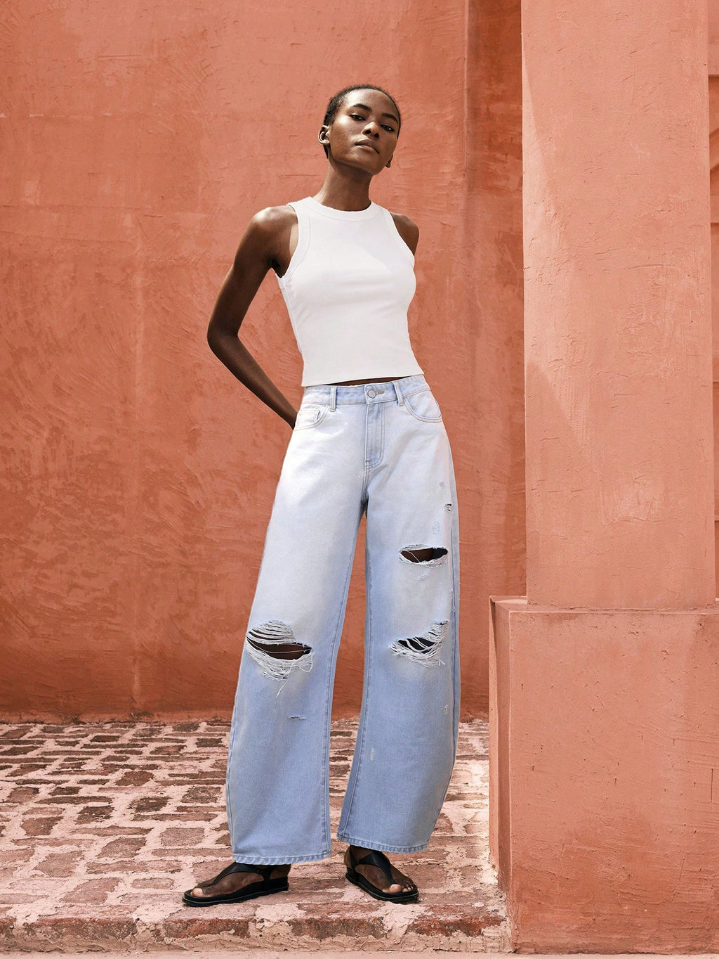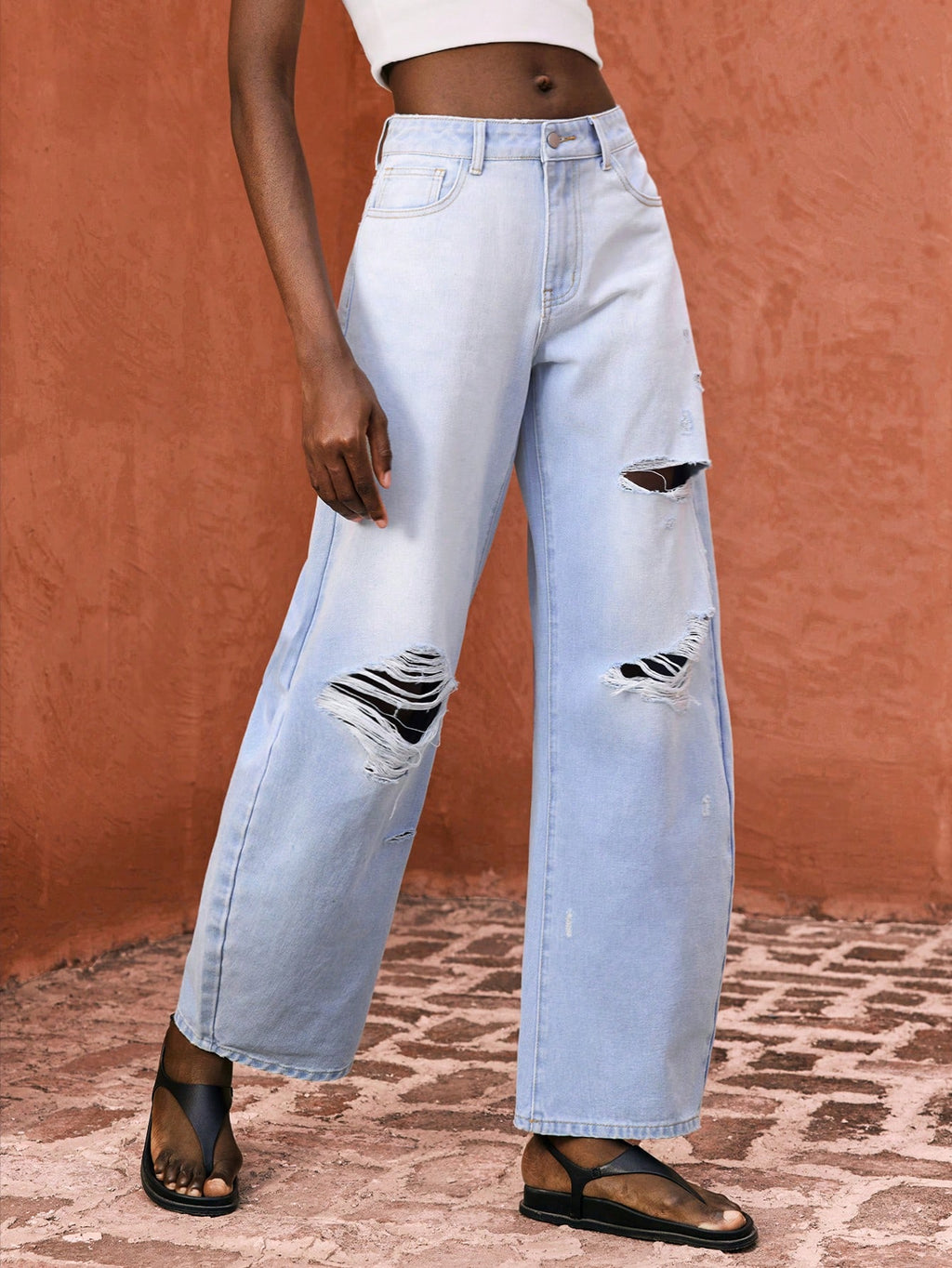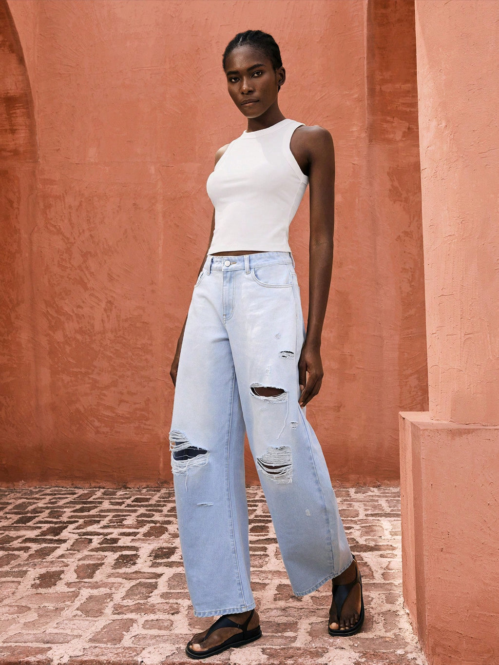 MIU Women's Light Blue Jeans Casual Ripped Banana Pants Summer Outfit