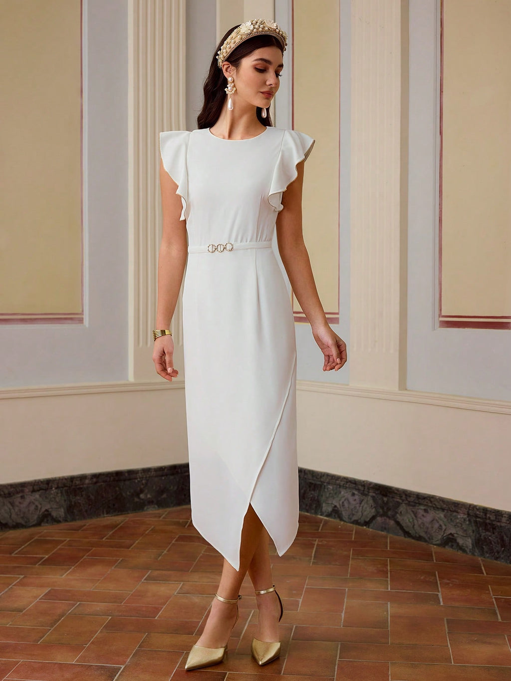 MIU Women's Midi Dress With Metal Buckle Waist And Crossover Hemline, Spring Summer, White Dress