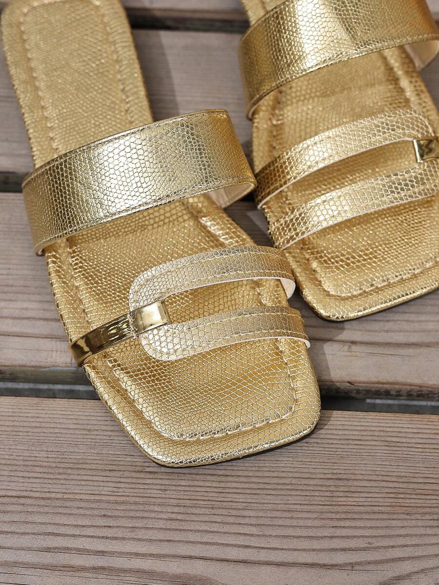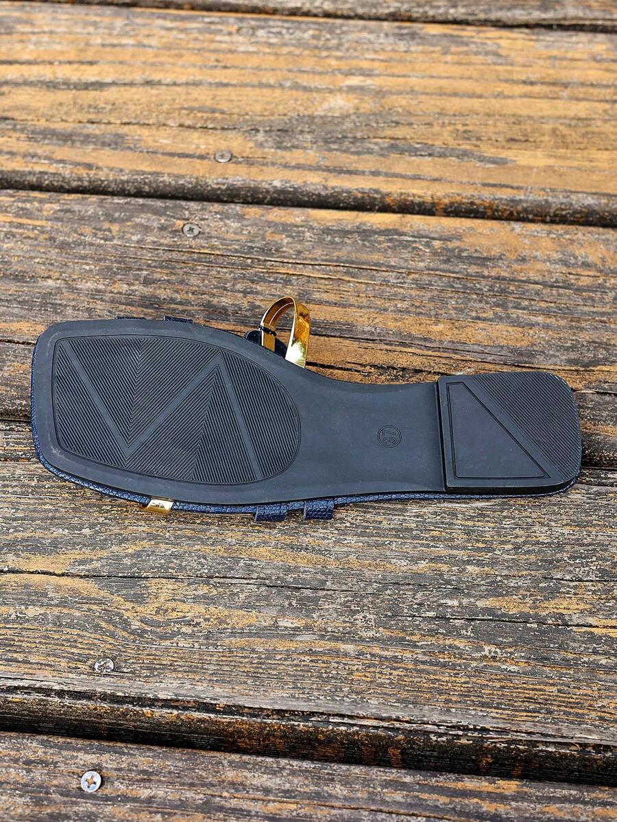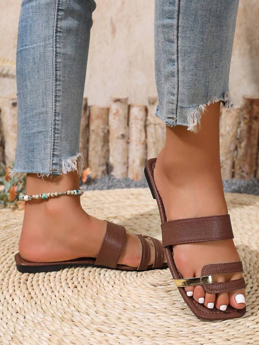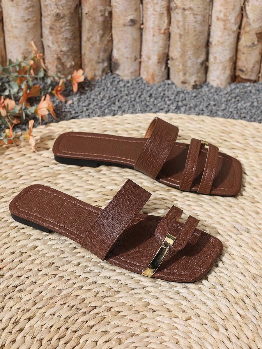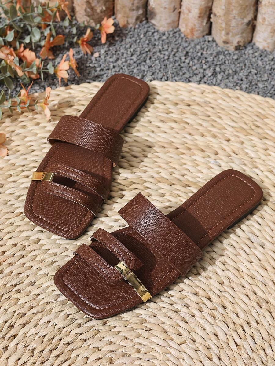 MIU Women's New Brown Square Toe Gold Strap Hollow Open Toe Casual Slip-On Sandals For Summer Vacation, Beach, Daily Wear