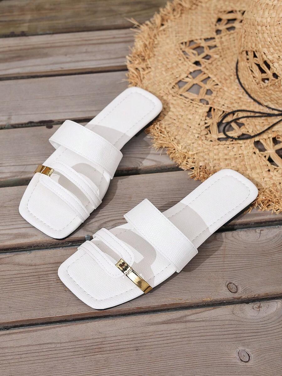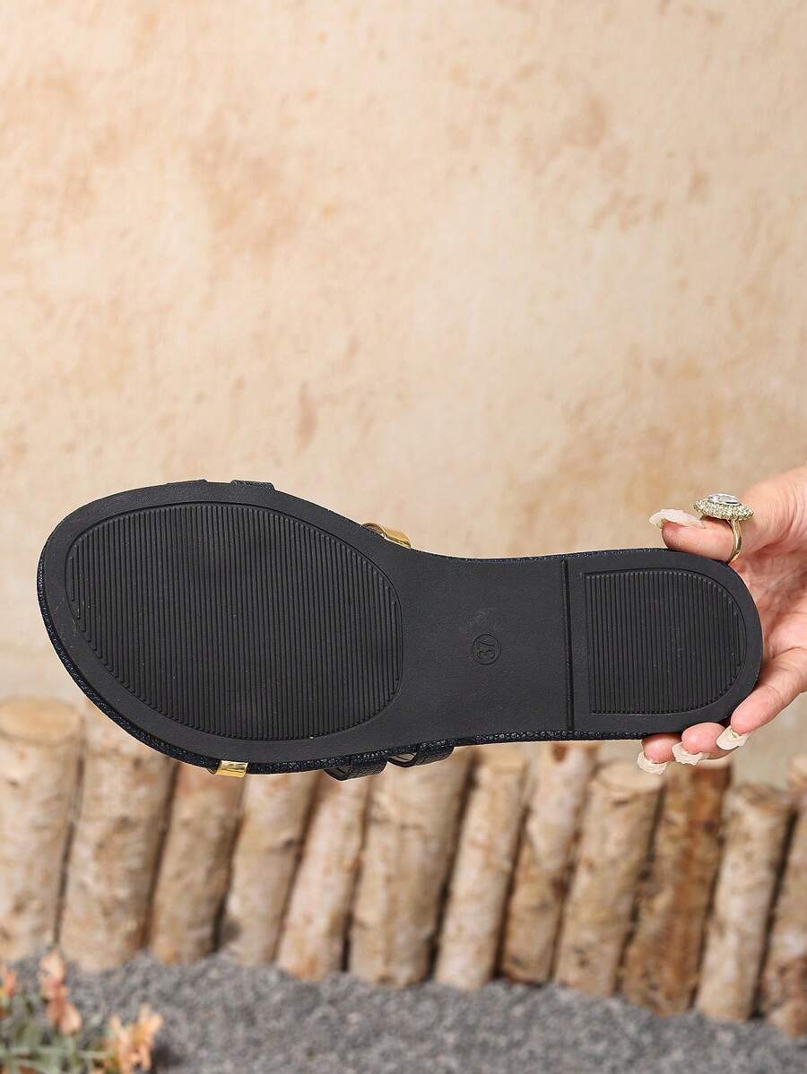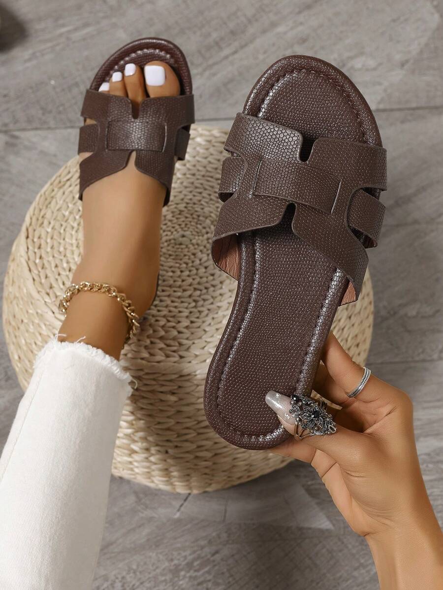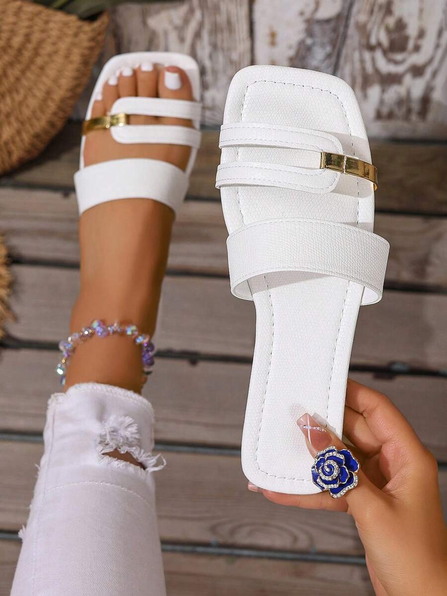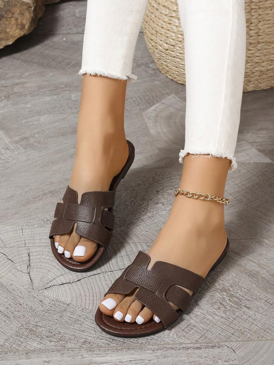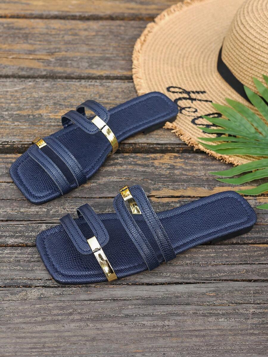 MIU Women's New Brown Square Toe Gold Strap Hollow Open Toe Casual Slip-On Sandals For Summer Vacation, Beach, Daily Wear