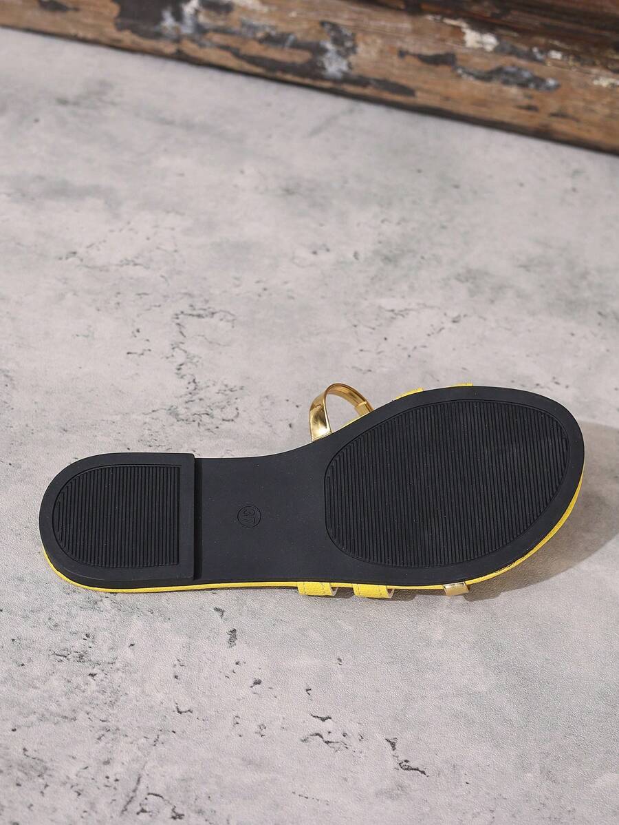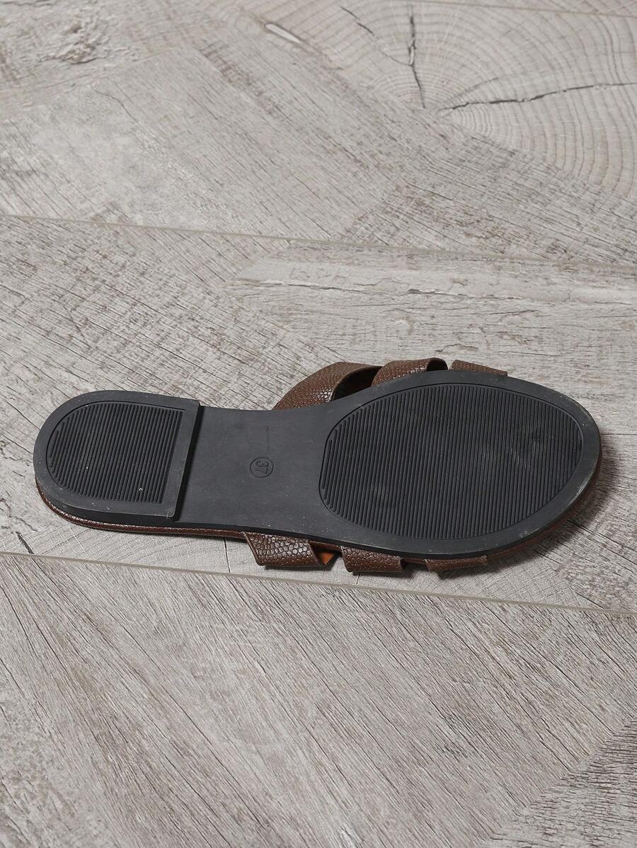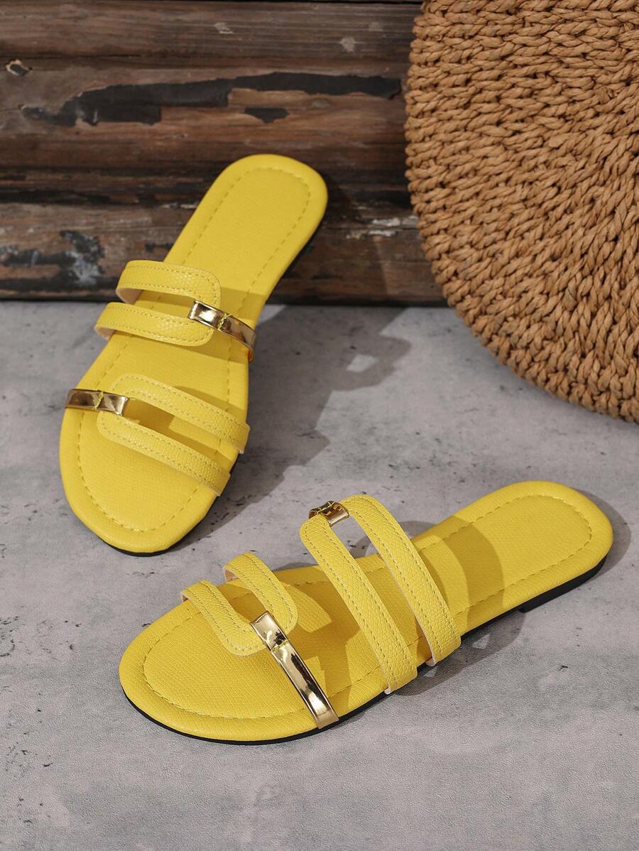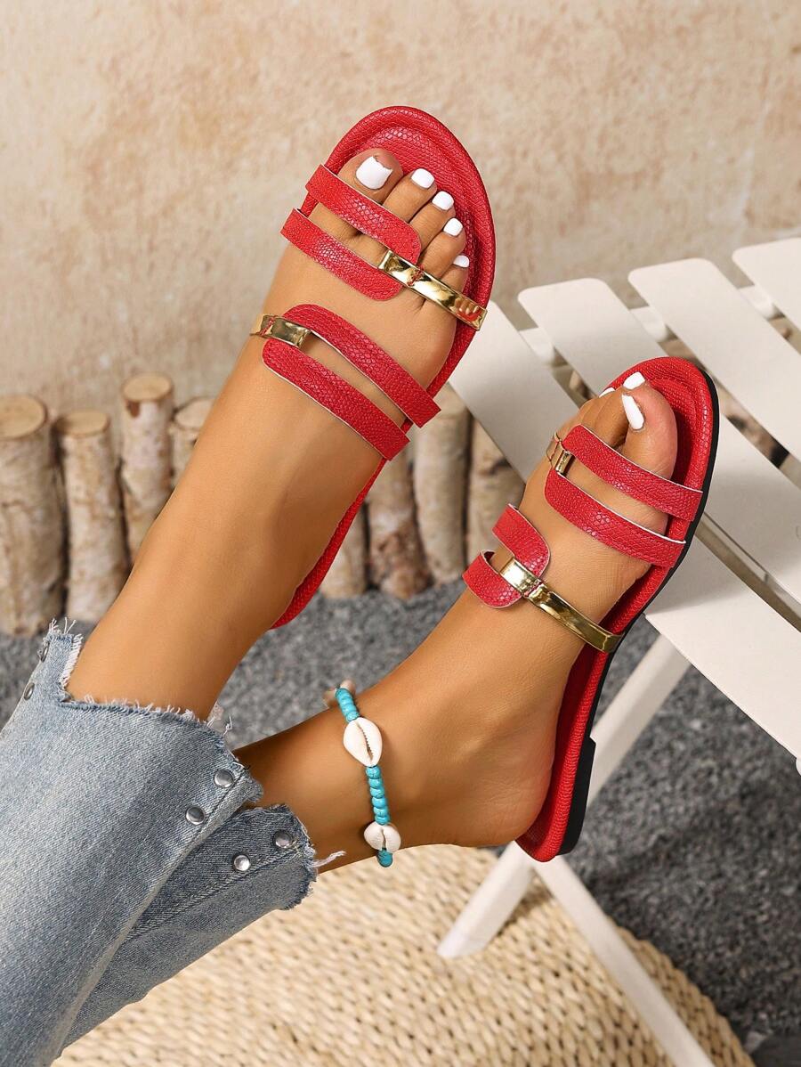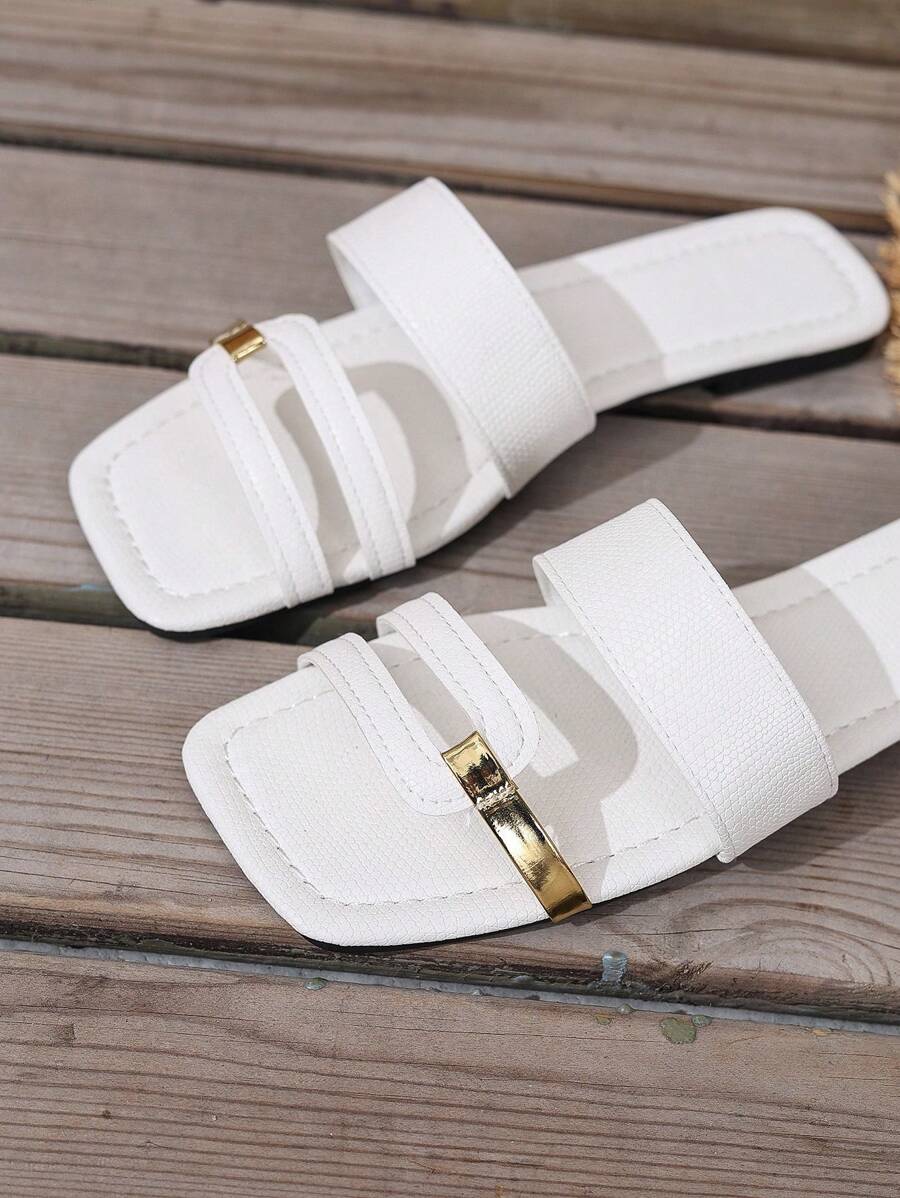 MIU Women's New Brown Square Toe Gold Strap Hollow Open Toe Casual Slip-On Sandals For Summer Vacation, Beach, Daily Wear