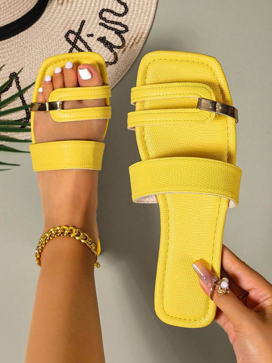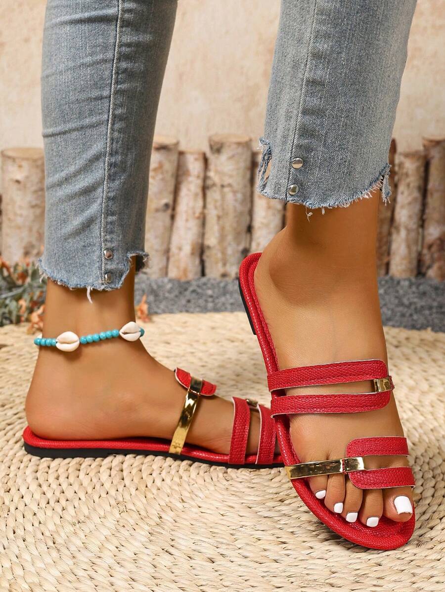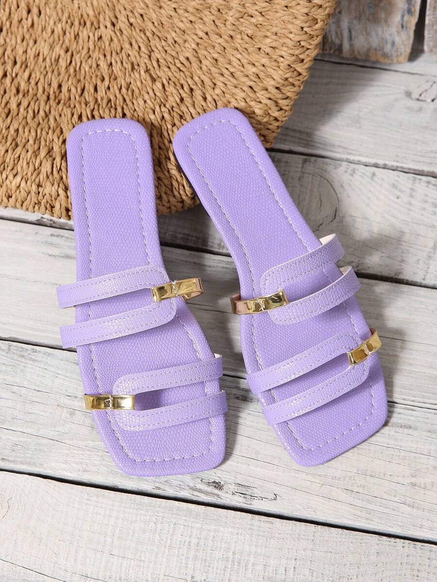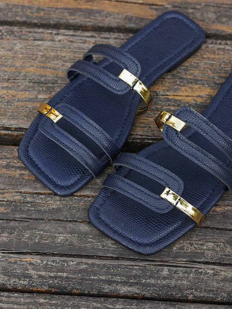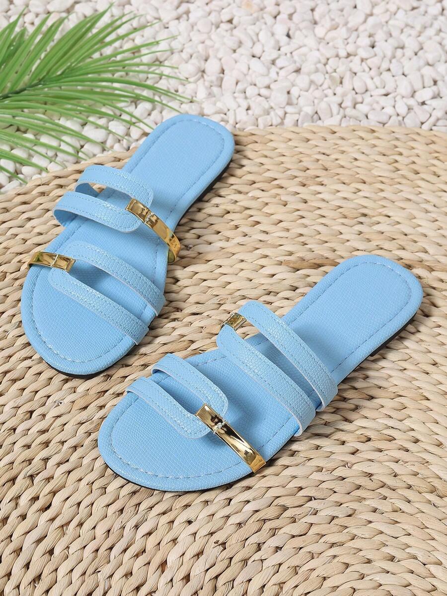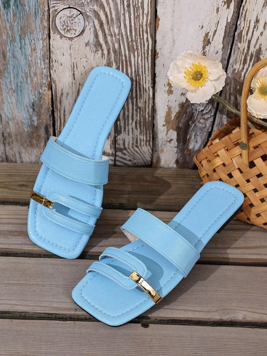 MIU Women's New Brown Square Toe Gold Strap Hollow Open Toe Casual Slip-On Sandals For Summer Vacation, Beach, Daily Wear
