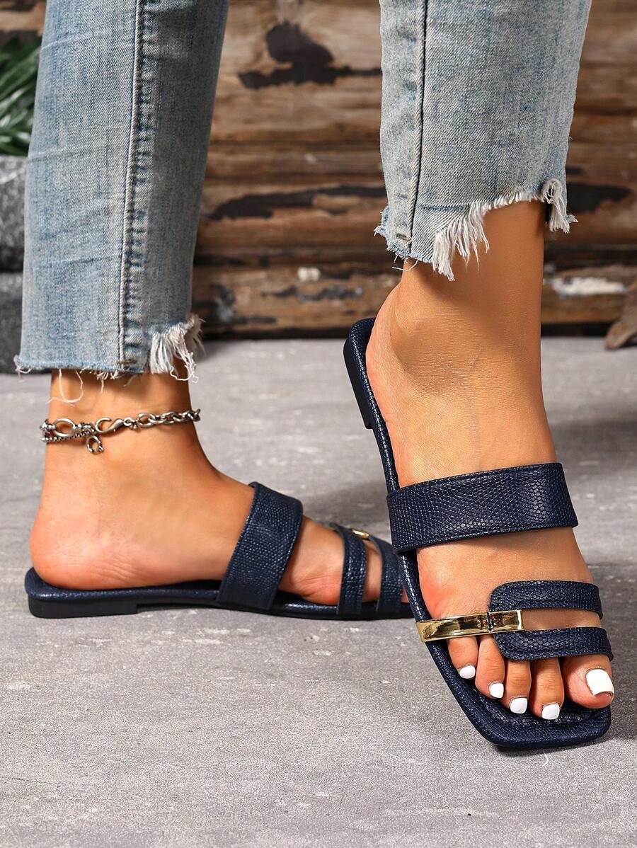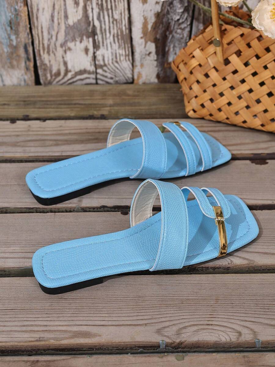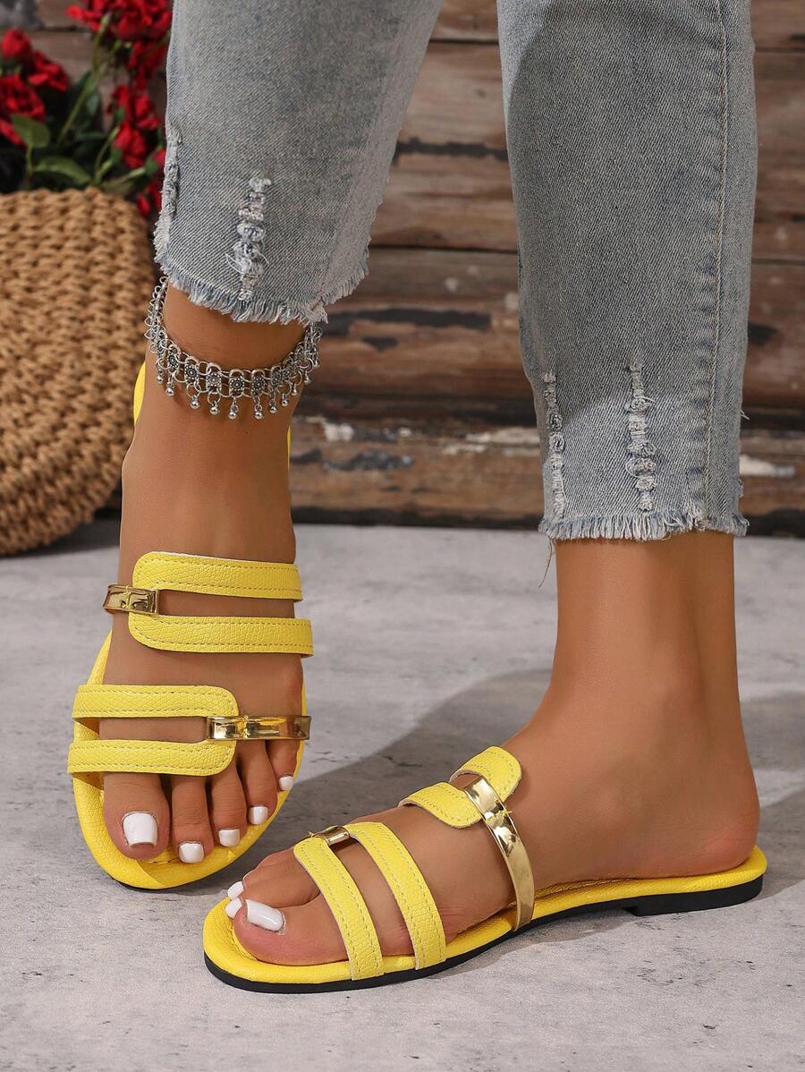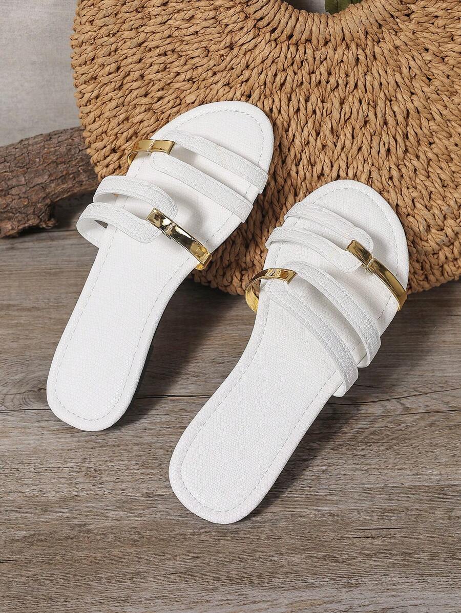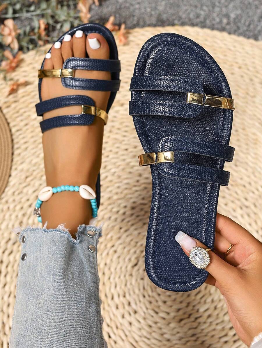 MIU Women's New Brown Square Toe Gold Strap Hollow Open Toe Casual Slip-On Sandals For Summer Vacation, Beach, Daily Wear