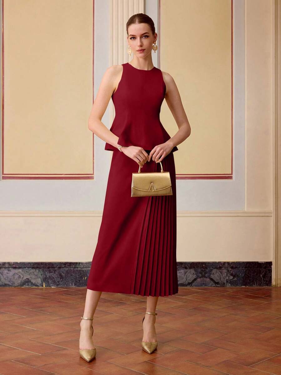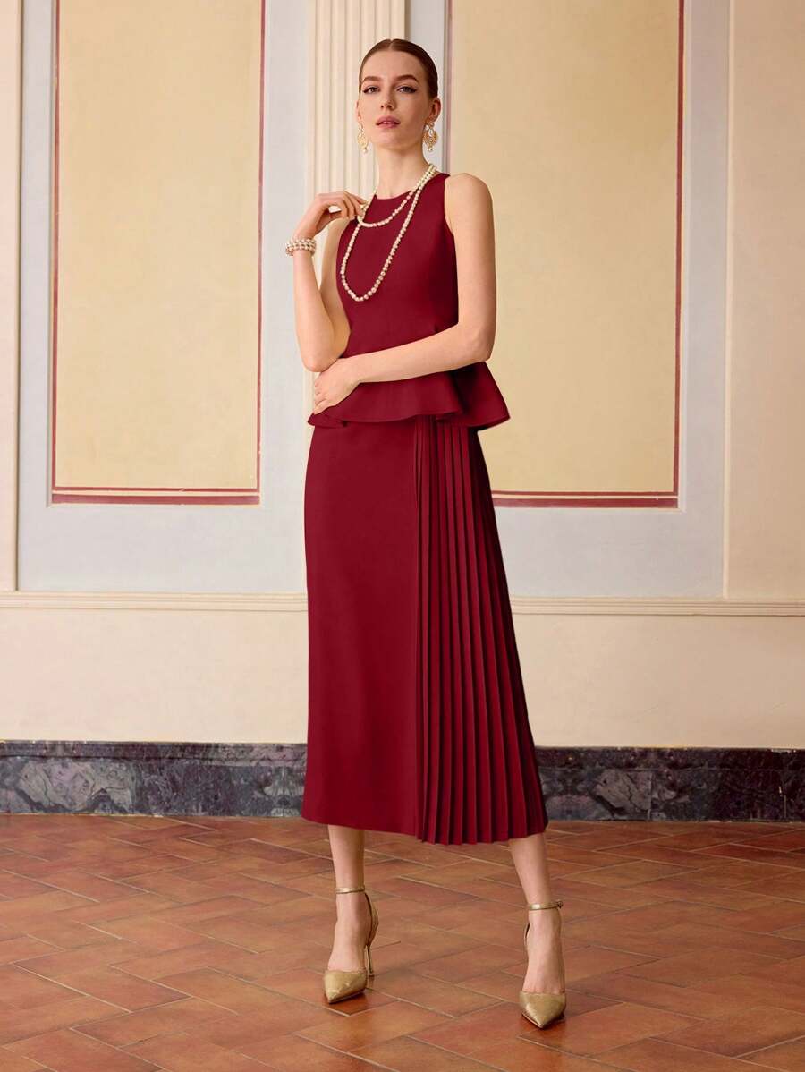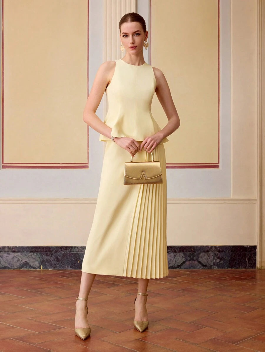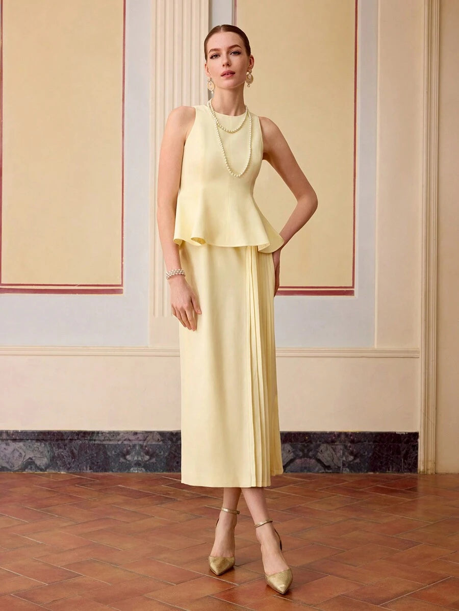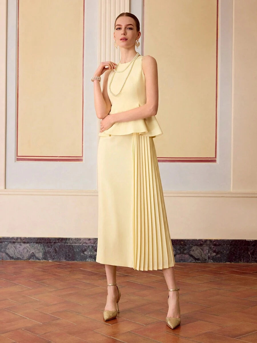 MIU WOMEN'S PEPLUM HEM PLEATED MIDI DRESS, SPRING SUMMER