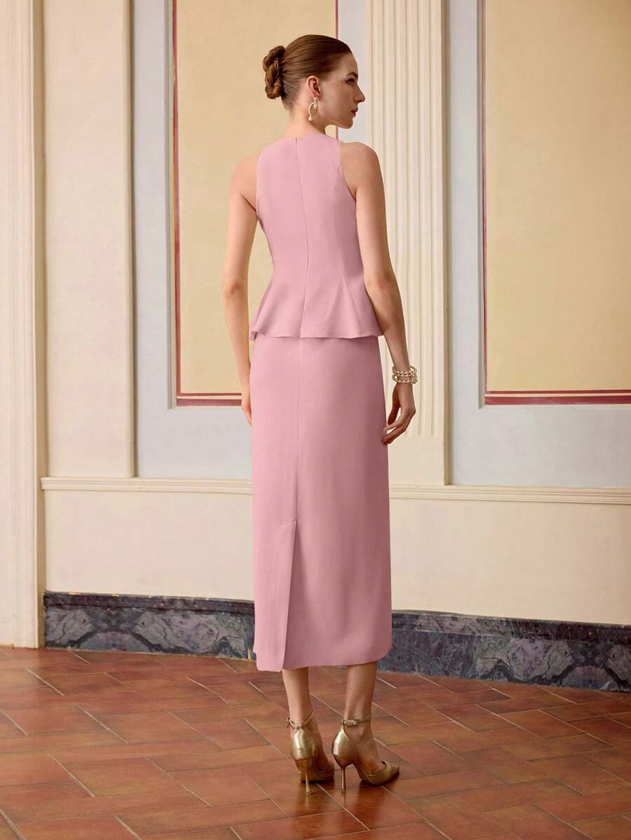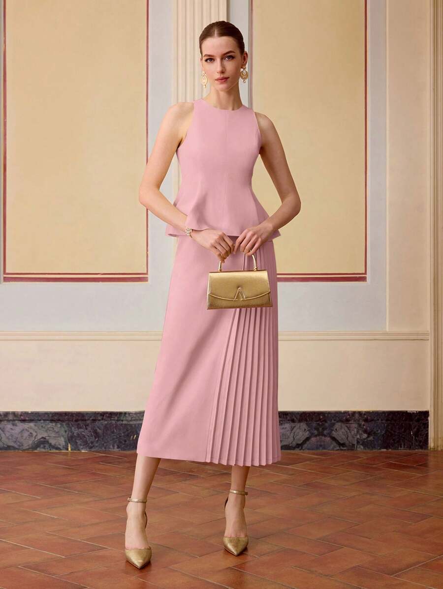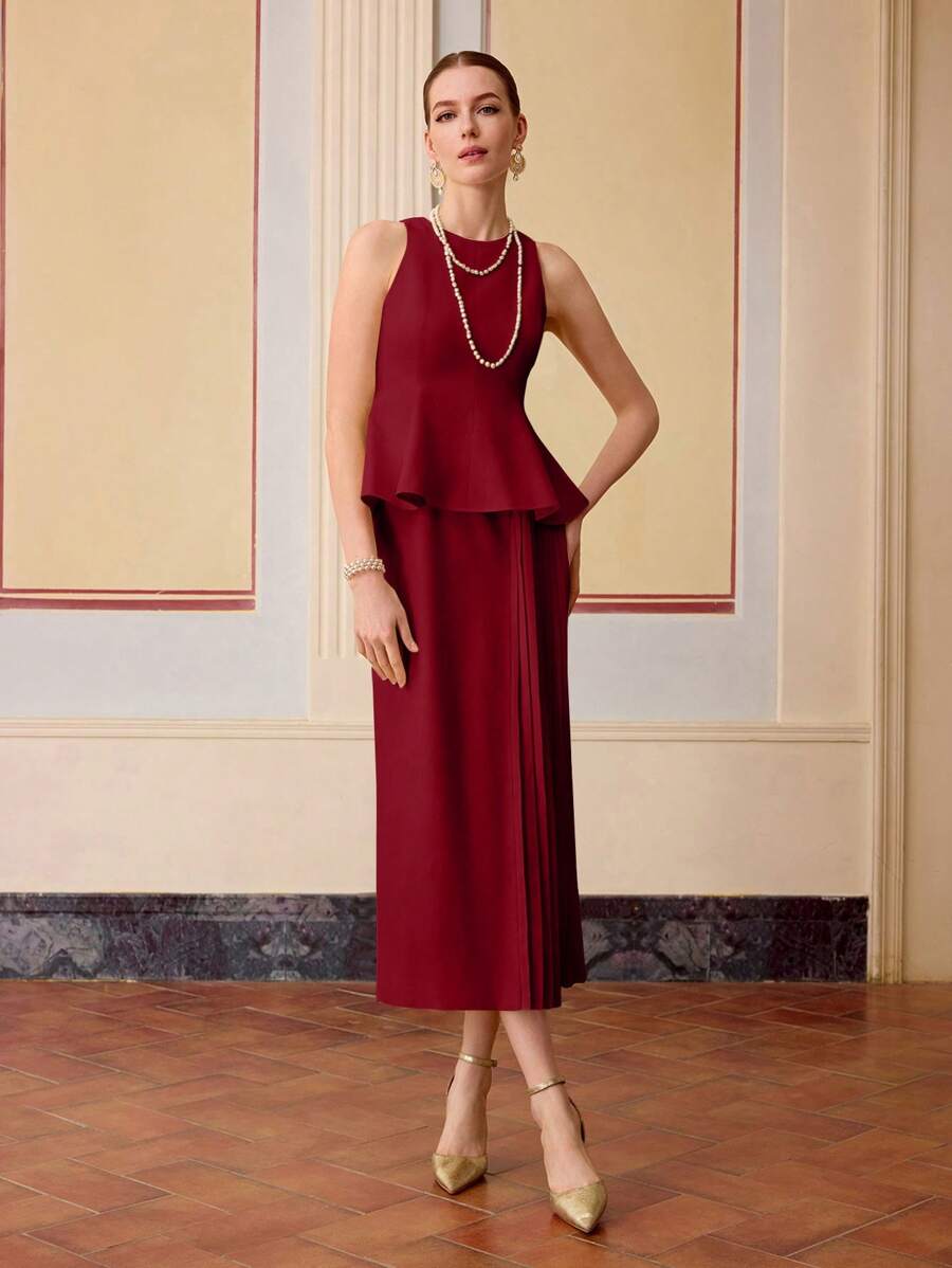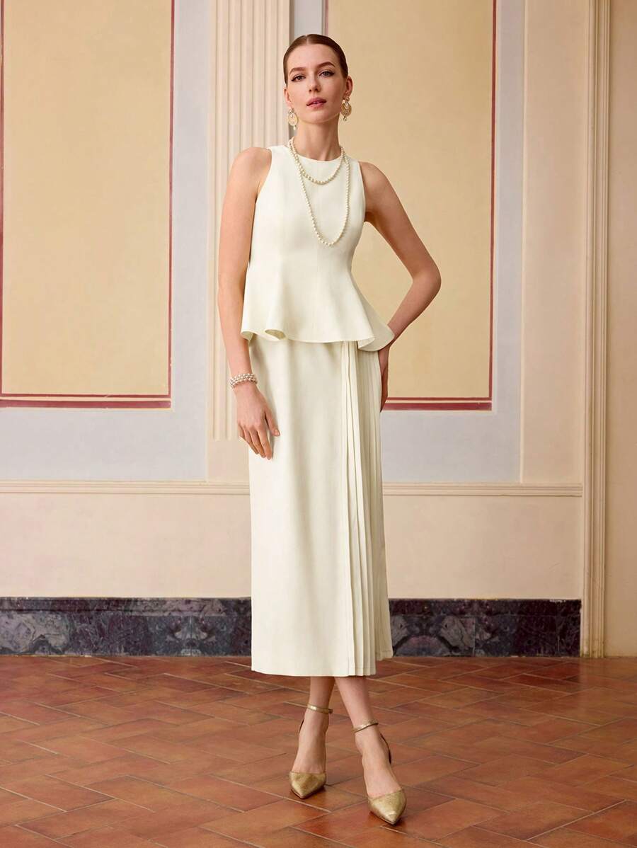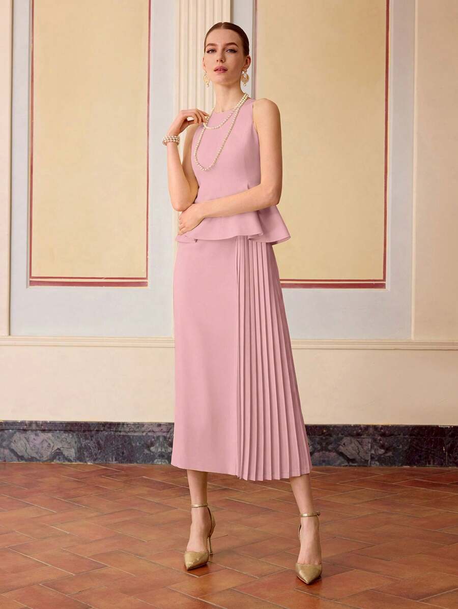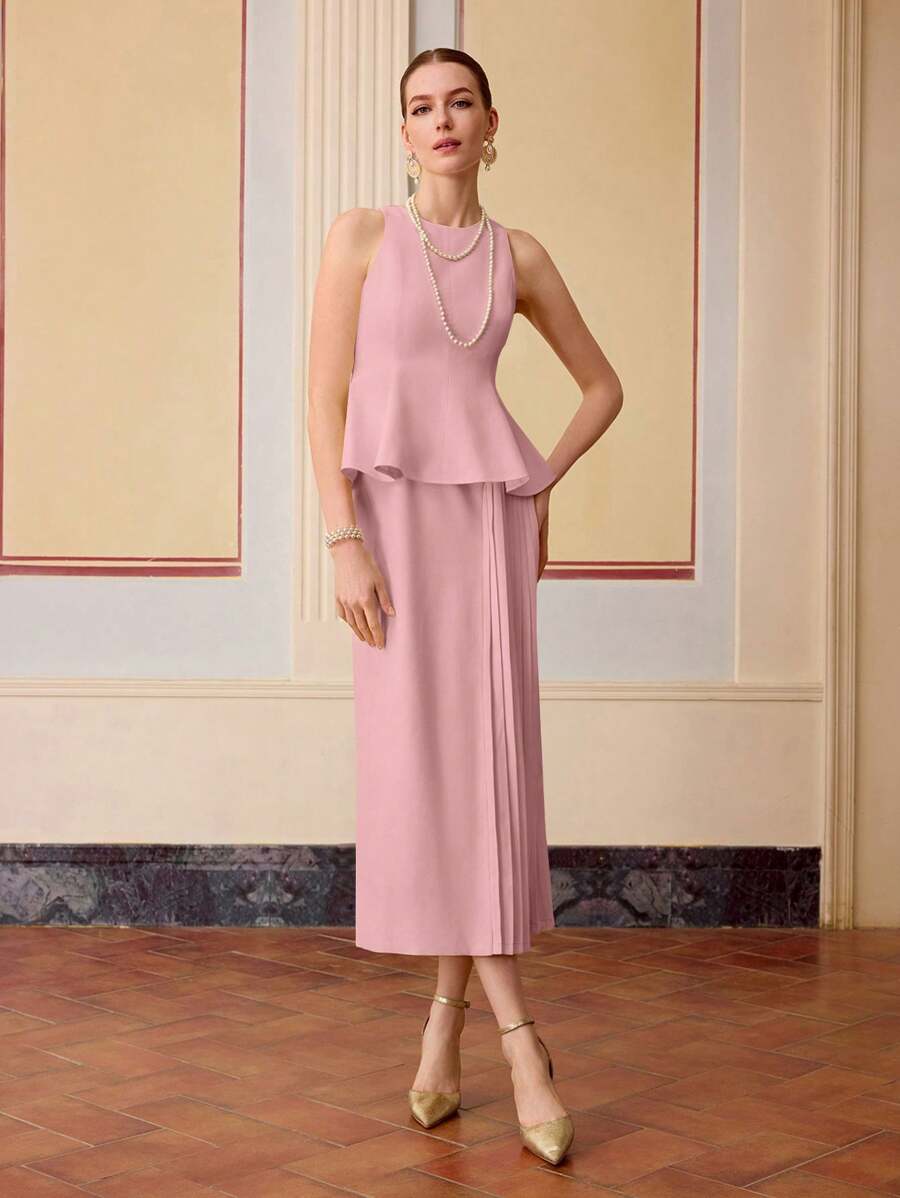 MIU WOMEN'S PEPLUM HEM PLEATED MIDI DRESS, SPRING SUMMER