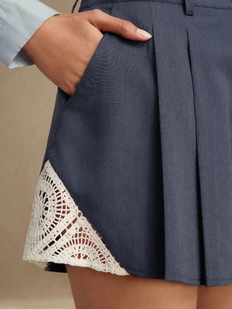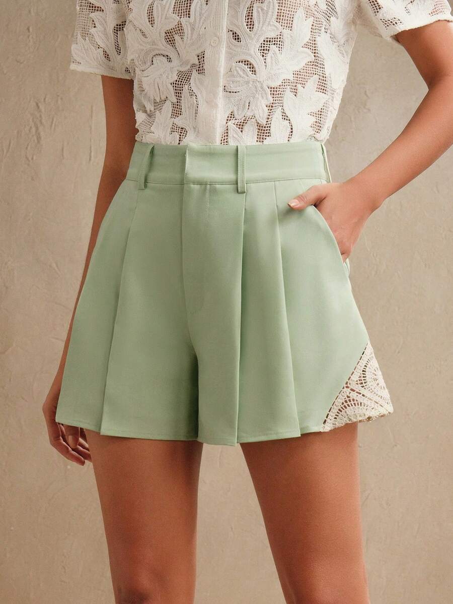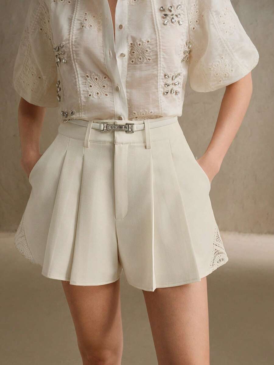 MIU Women's Pleated Embroidered Hollow-Out Flower Patchwork Short Suit Pants, Valentine's Day, Vacation, New Year's Outfit, Summer Boho, Spring Outfits