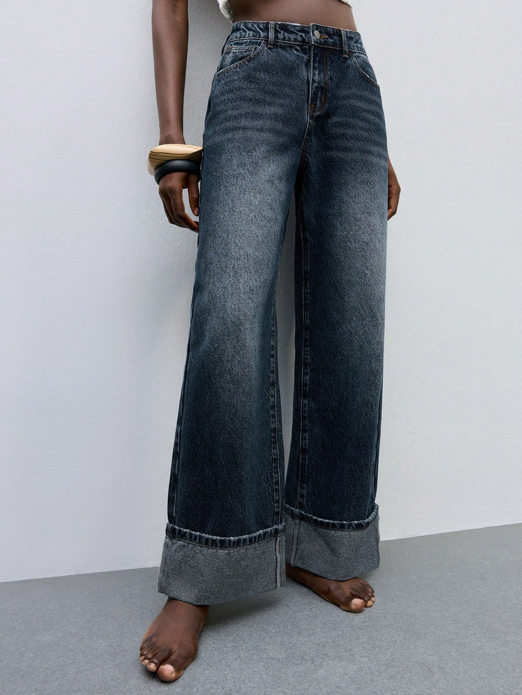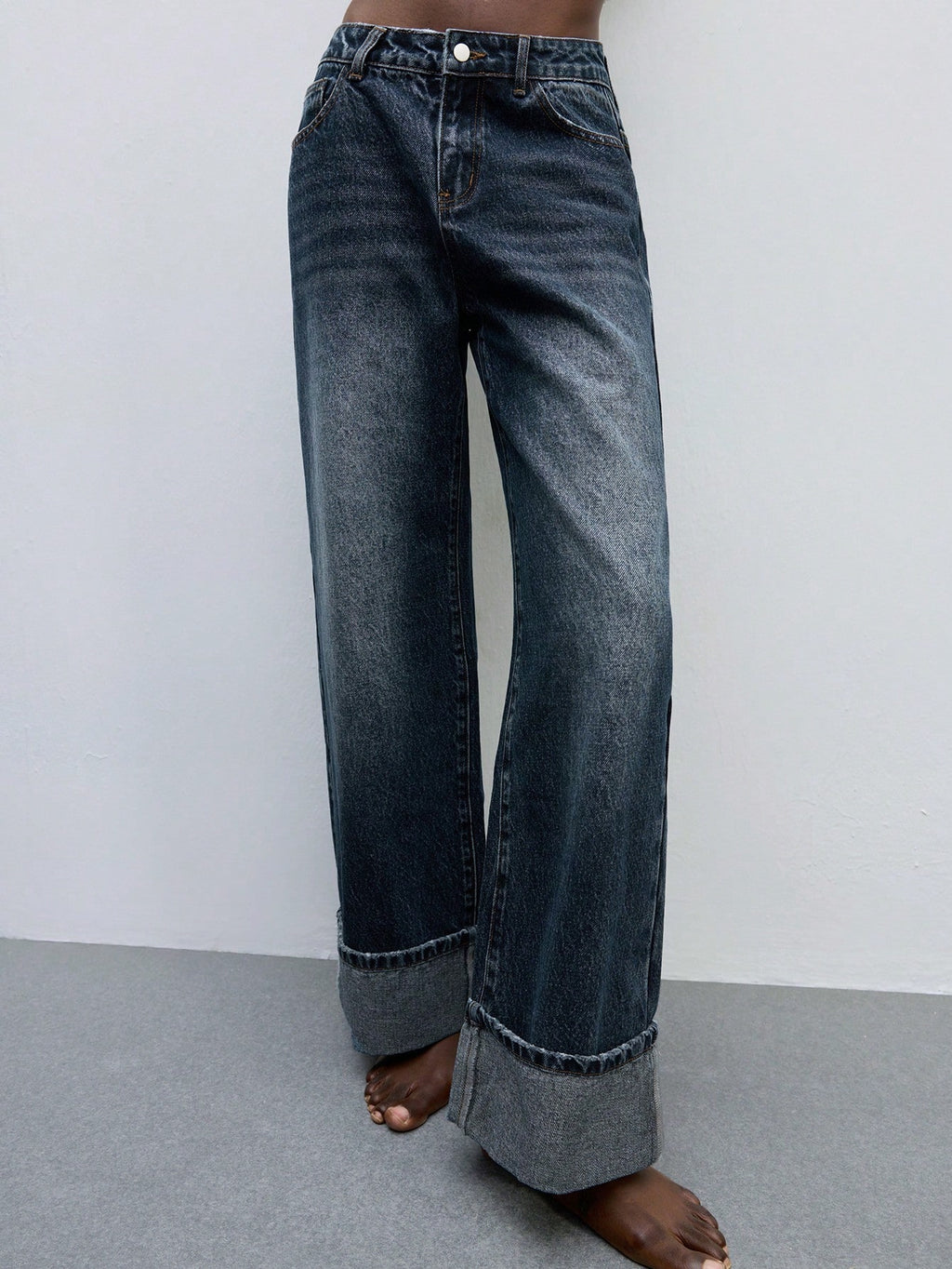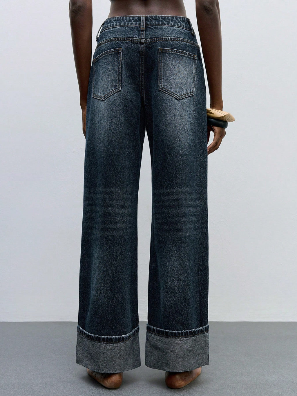MIU Women's Retro Blue Jeans Low-Rise Straight Leg Pants Folded Hems Autumn Casual Wear, Going Out Baggy Jeans Jeans Wide Leg Cuffed Jeans