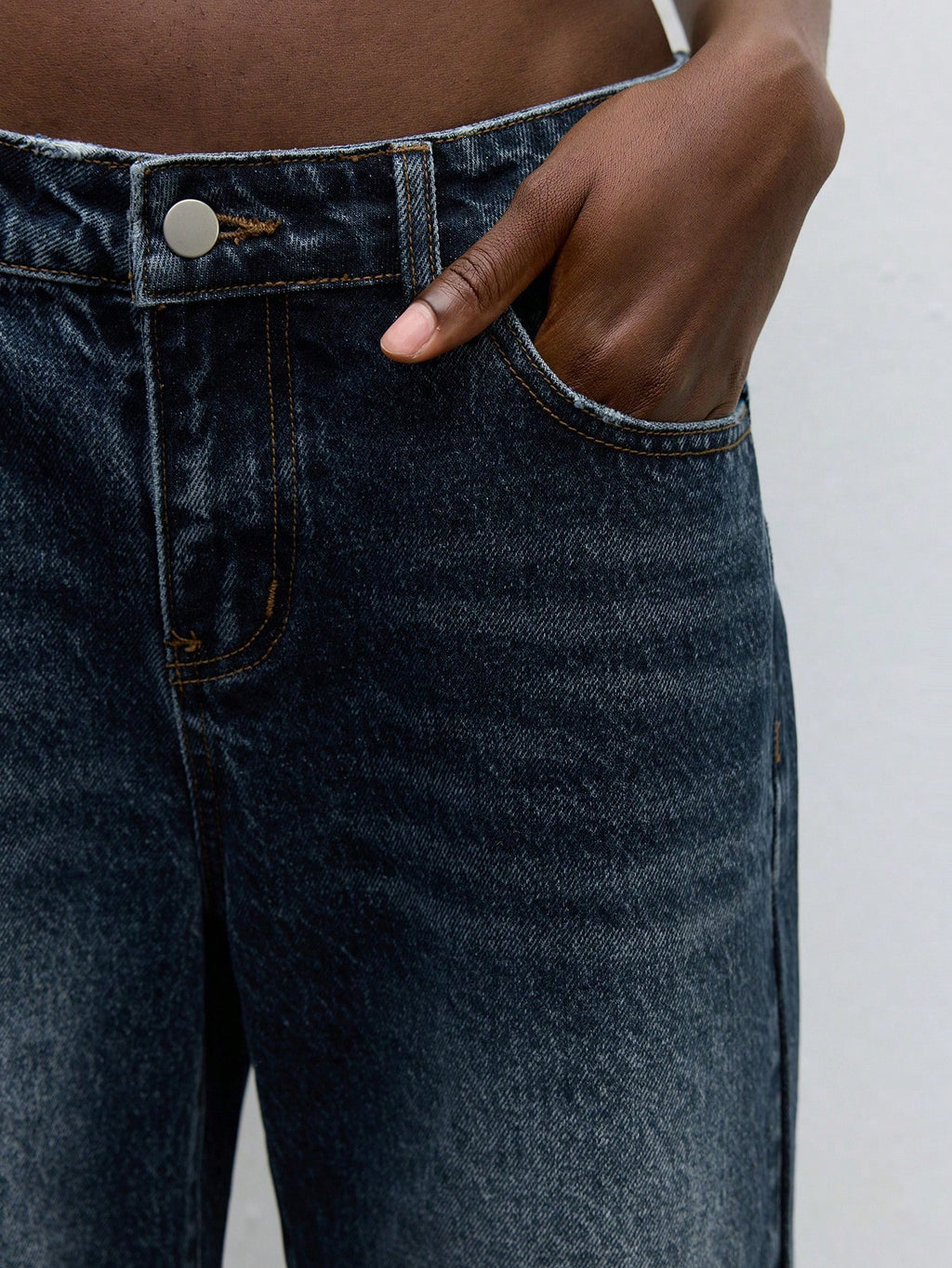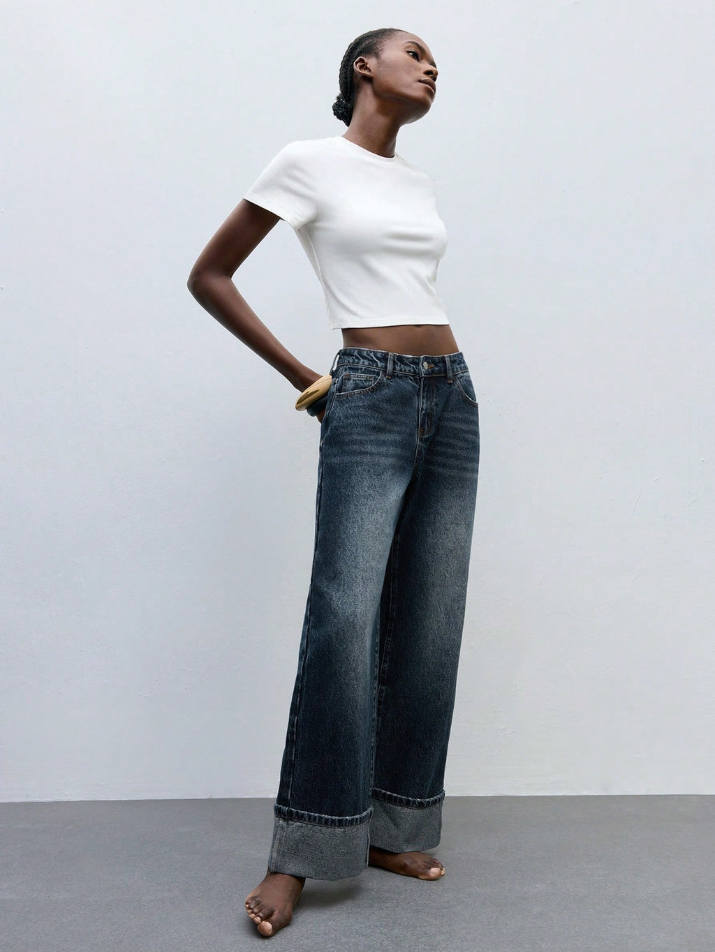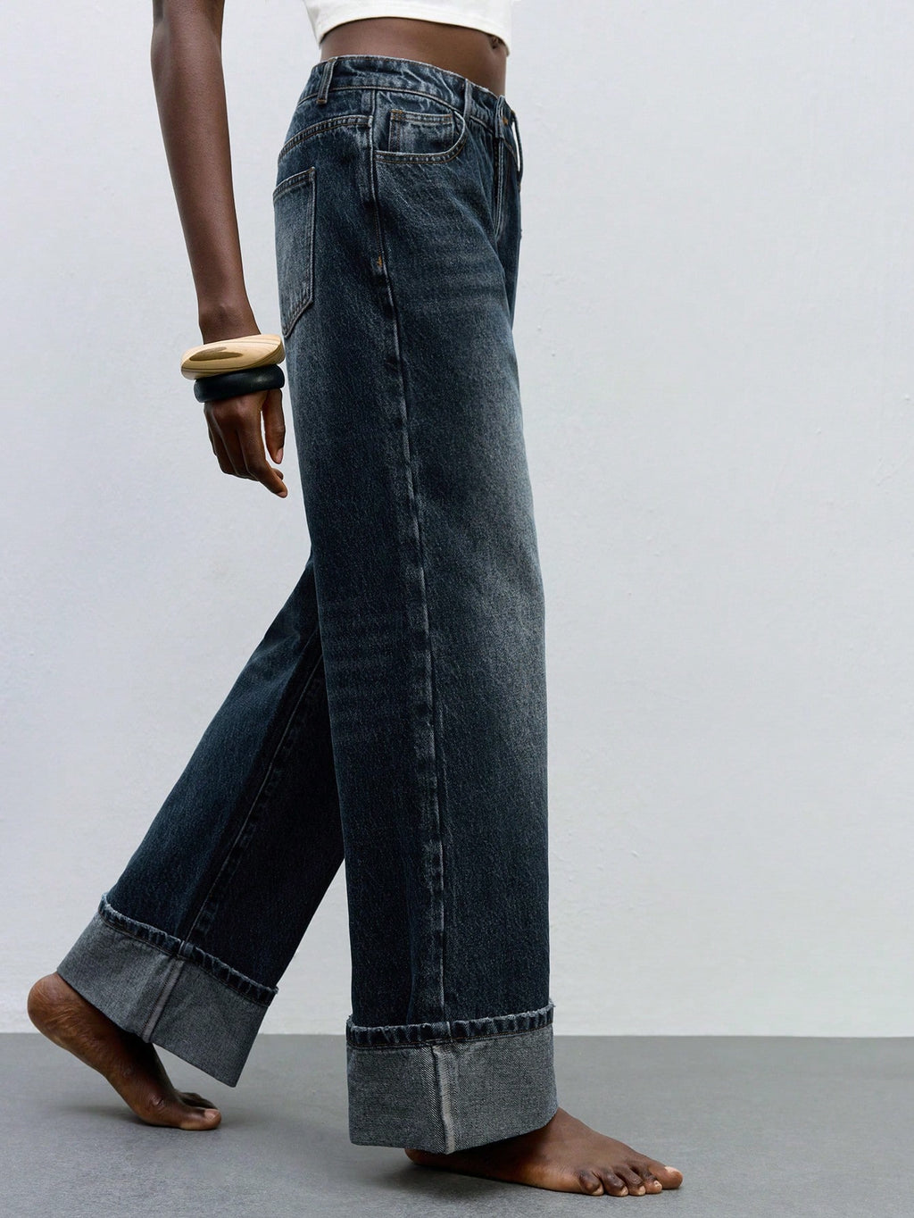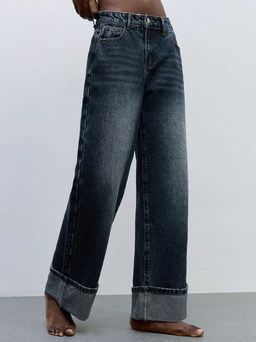 MIU Women's Retro Blue Jeans Low-Rise Straight Leg Pants Folded Hems Autumn Casual Wear, Going Out Baggy Jeans Jeans Wide Leg Cuffed Jeans